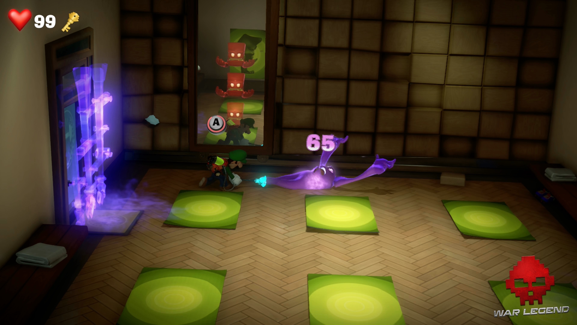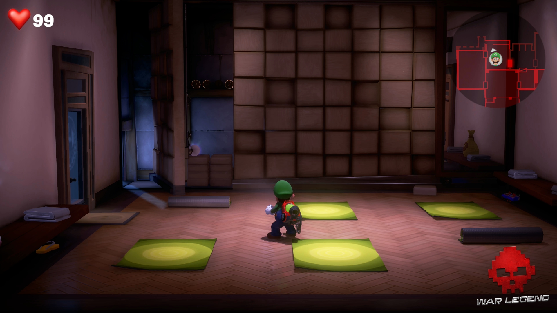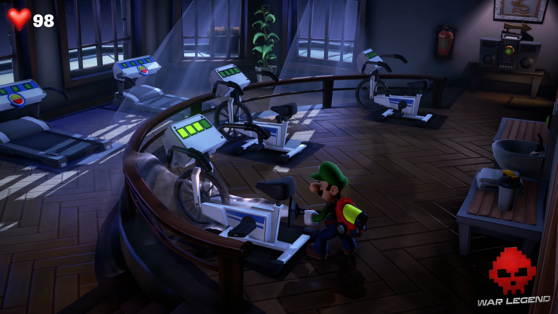 Une salle de yoga, mais la porte qui mène au reste de l’étage est elle aussi vérouillée. Remarquez le miroir du fond que vous pouvez manipuler avec l’Ectoblast. Le but est de recréer le motif des posters vus dans le miroir avec les tapis de sol. Soufflez ou aspirez pour les enrouler/dérouler révélez un passage secret.