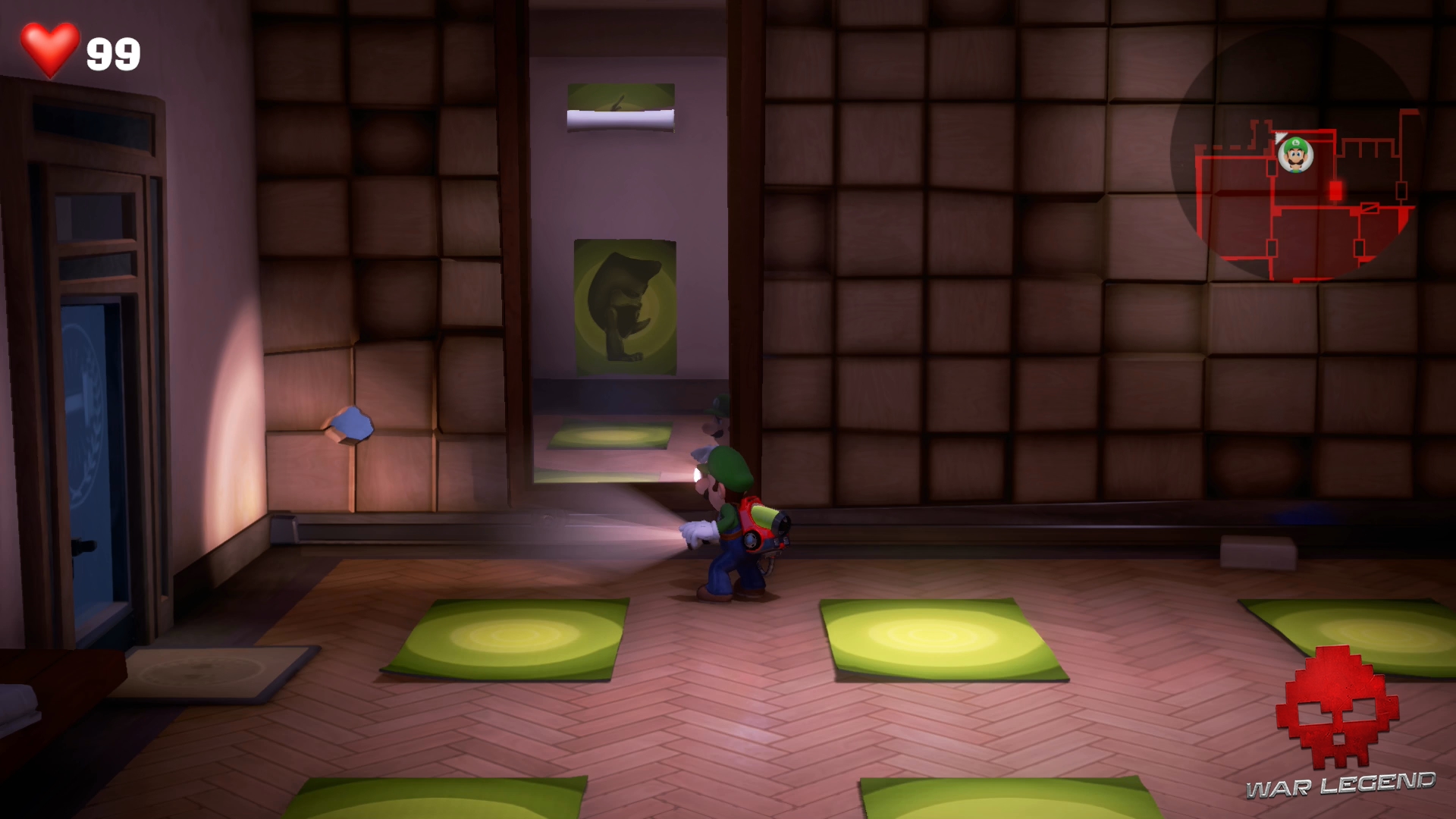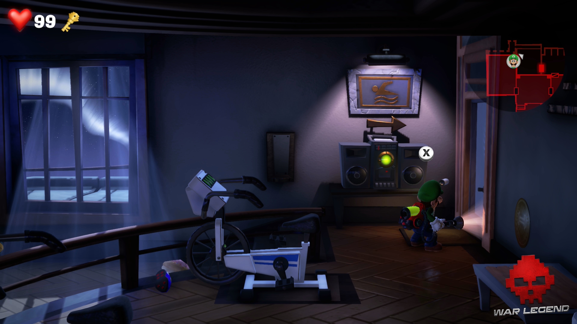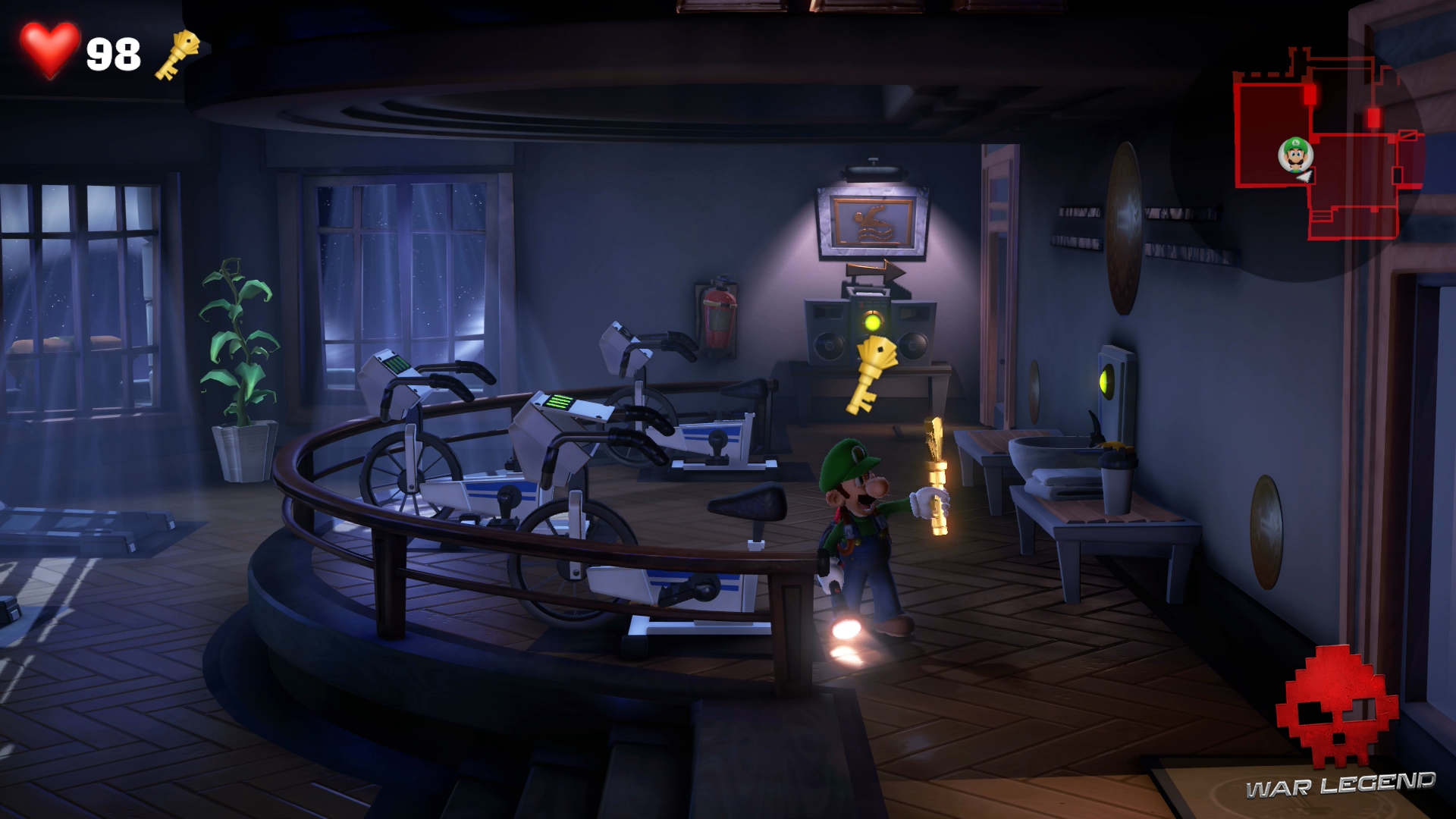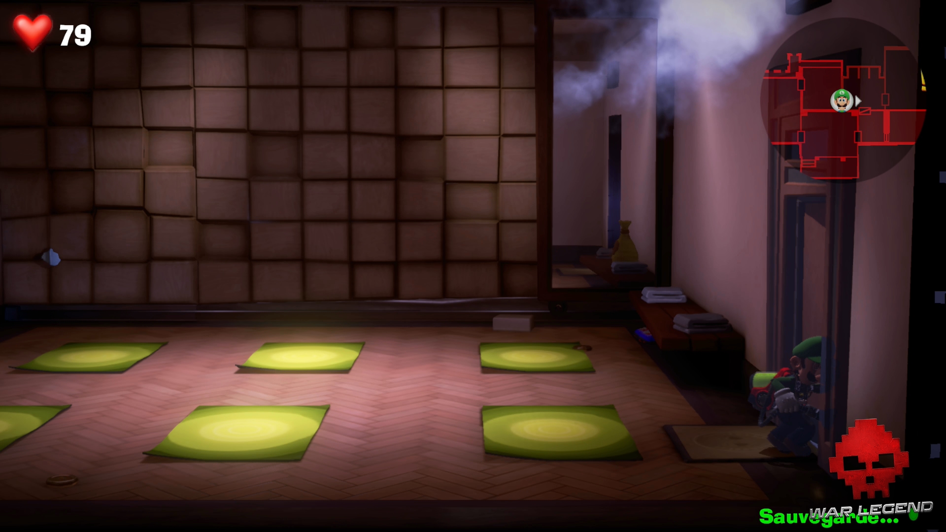 Une salle de yoga, mais la porte qui mène au reste de l’étage est elle aussi vérouillée. Remarquez le miroir du fond que vous pouvez manipuler avec l’Ectoblast. Le but est de recréer le motif des posters vus dans le miroir avec les tapis de sol. Soufflez ou aspirez pour les enrouler/dérouler révélez un passage secret.