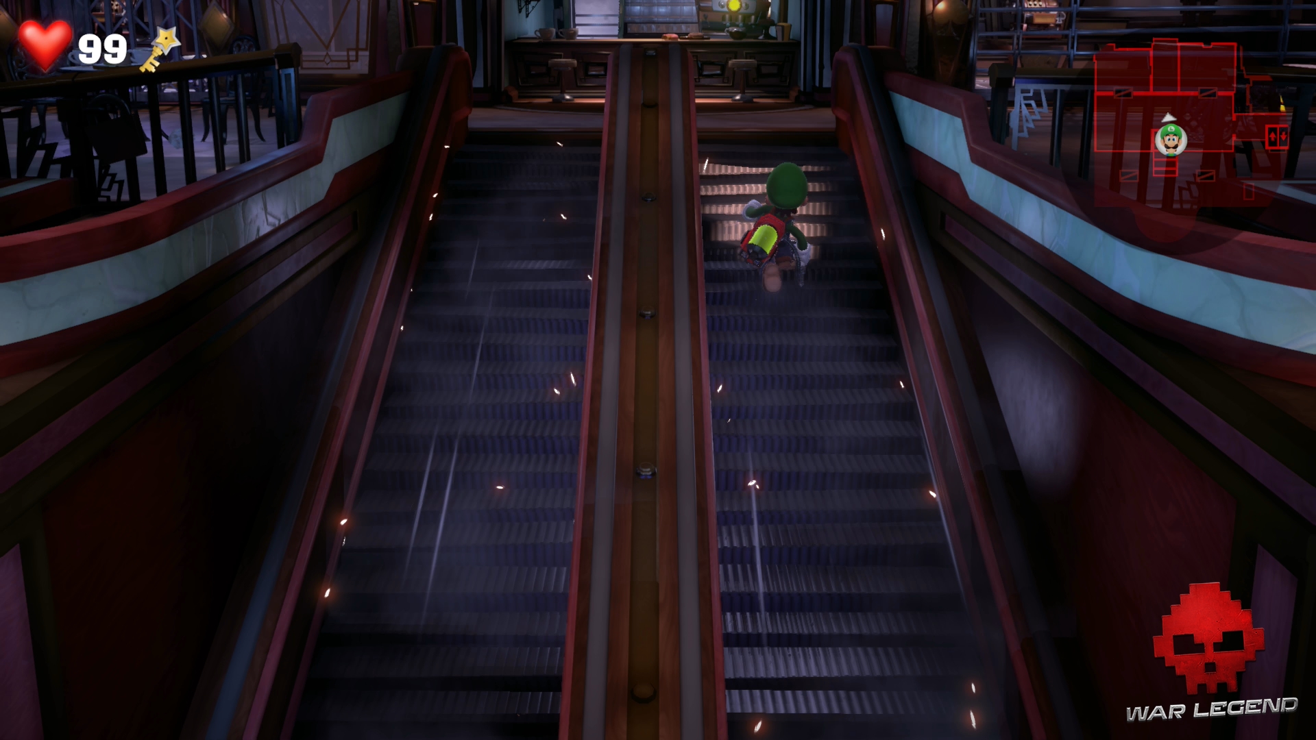 Une fois dans la galerie, vous faites connaissance avec Virgil le Vigile, le fantôme notoire des lieux. Il détient le bouton de l’ascenseur du 2e étage. Heureusement, le vigile un peu pataud fait tomber une clé de sa poche spectrale. Allez la récupérer.