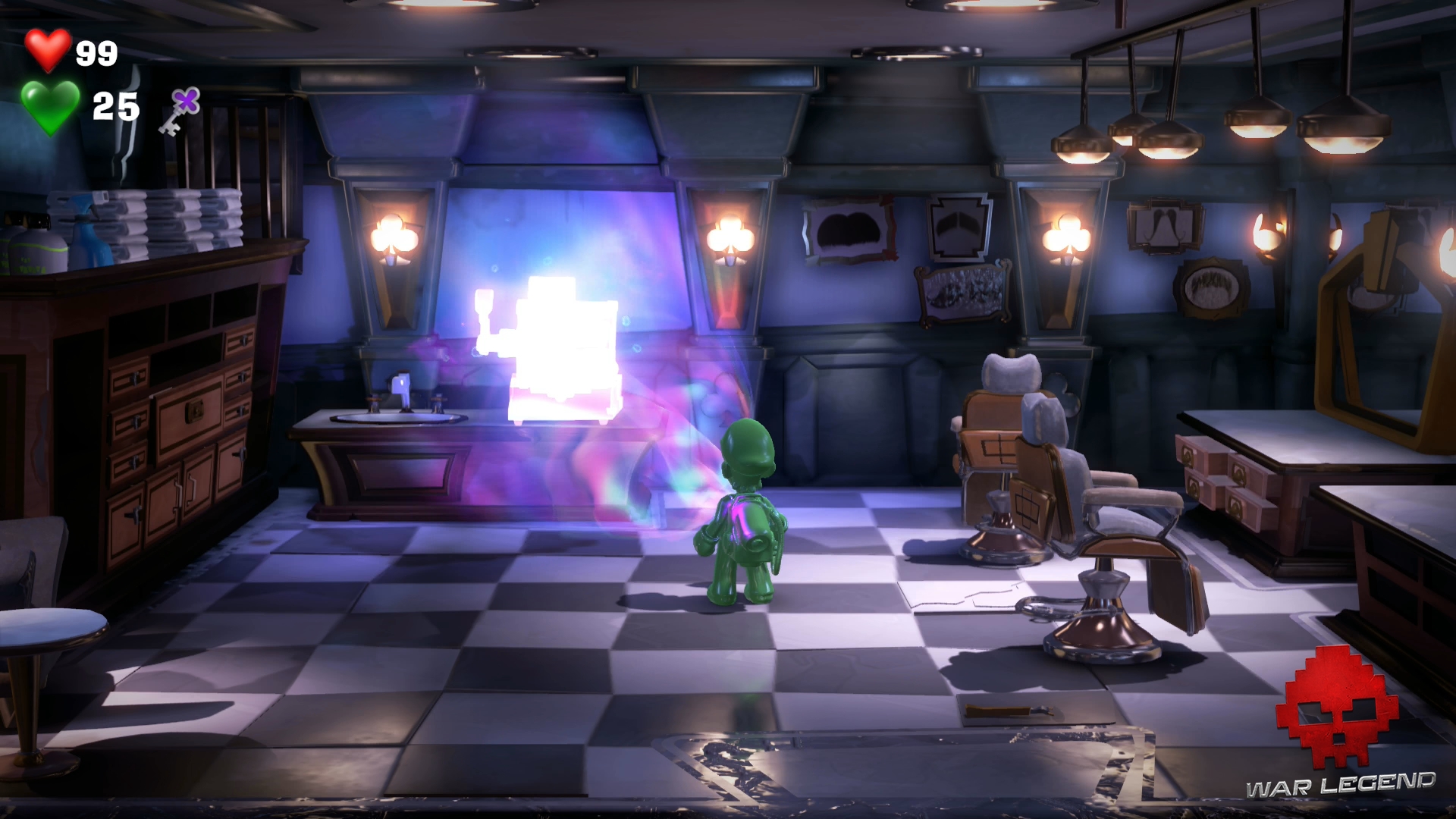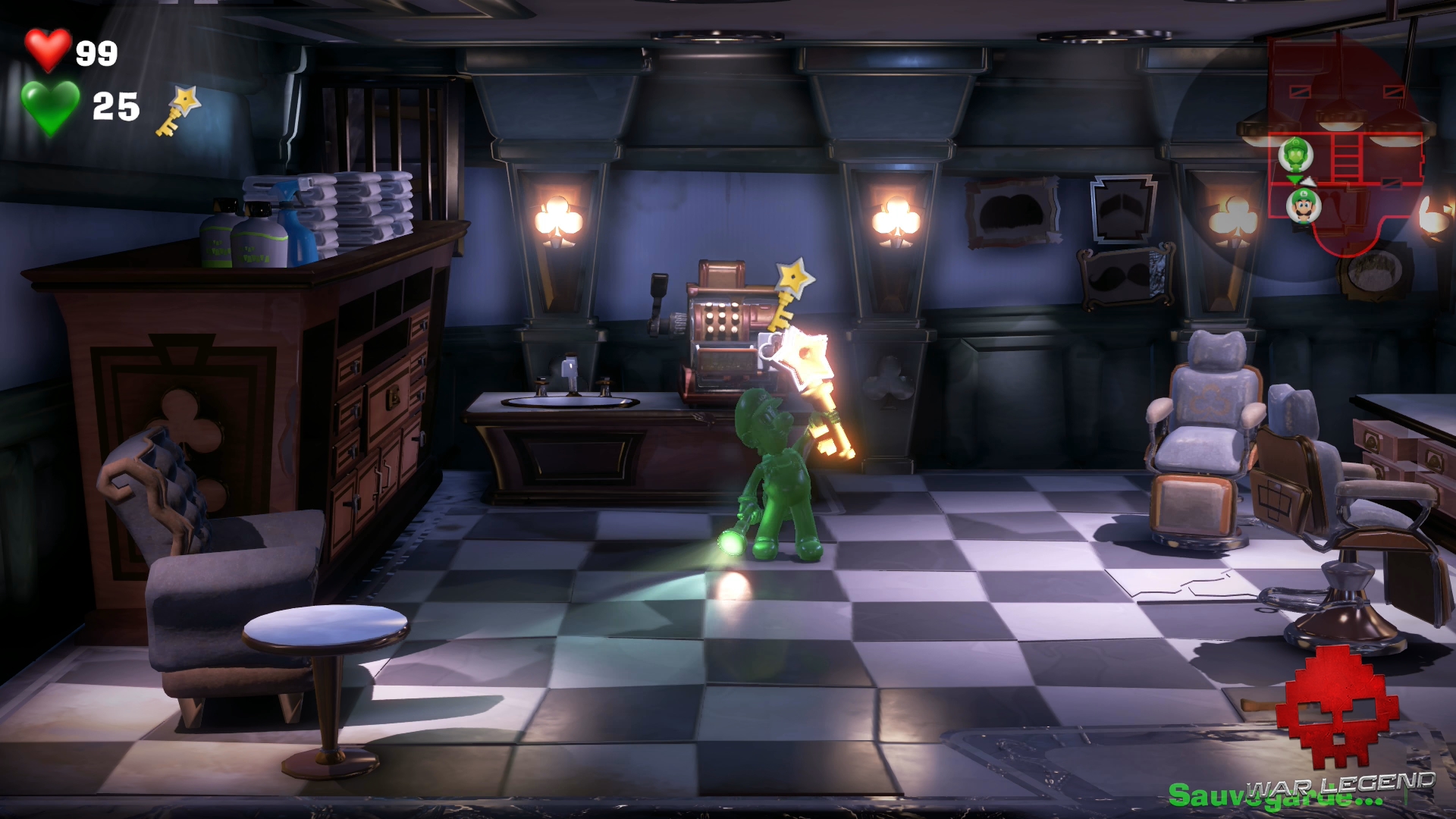Vous voilà avec une nouvelle clé, mais il ne reste plus qu’une boutique. Rendez-vous chez le coiffeur en bas à gauche. Cette fois, pas de grille pour accéder à l’intérieur. Utilisez Gluigi pour aspirer les deux trèfles de chaque côté de la paire de ciseaux jusqu’à l’ouverture complète des panneaux. Vous n’avez plus qu’à passer.