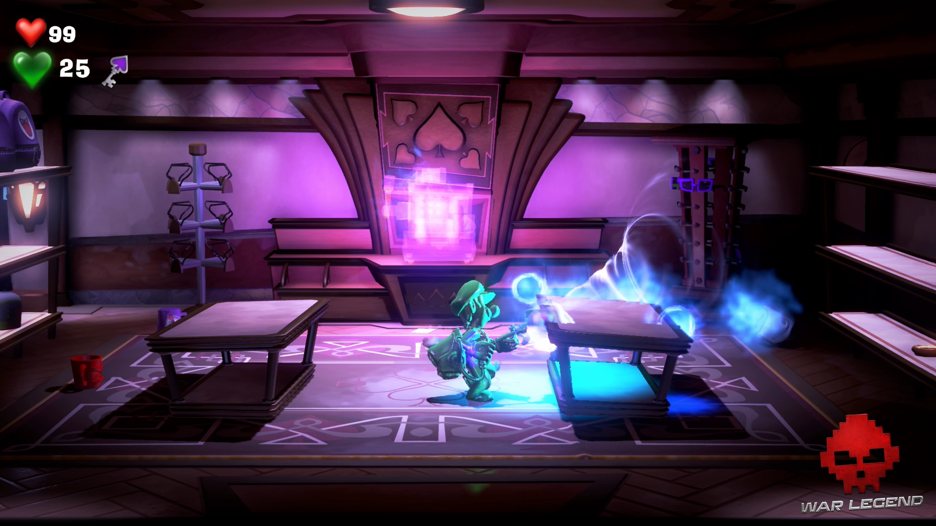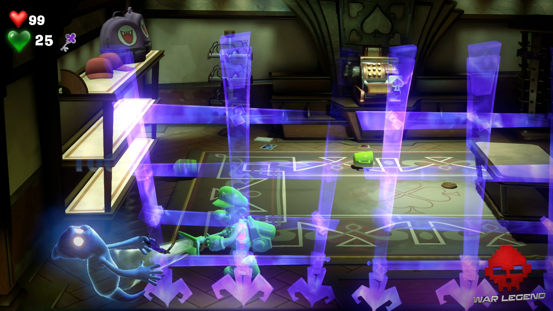 Rendez-vous cette fois à la boutique d’accessoires à l’étage à droite. Traversez à nouveau la grille avec Gluigi et approchez de la caisse. Celle-ci disparaît, transformée par des particules Boo en suspension. Utilisez le Révéloscope pour faire apparaître les particules à nouveau et aspirez-les. La caisse sera à nouveau tangible.