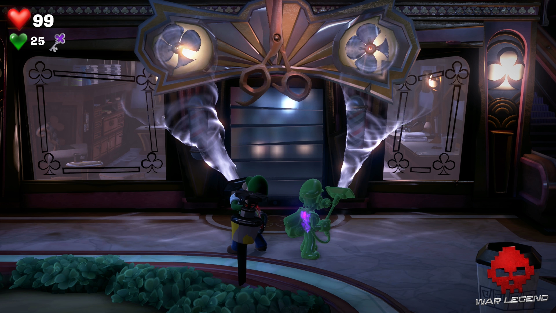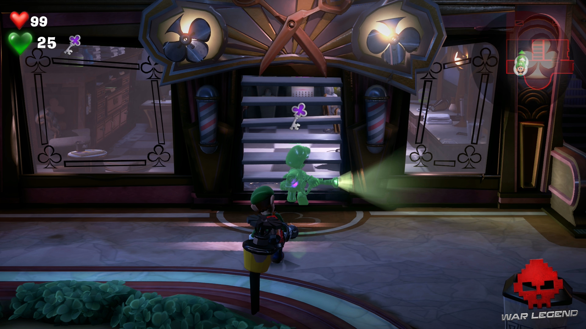 Vous voilà avec une nouvelle clé, mais il ne reste plus qu’une boutique. Rendez-vous chez le coiffeur en bas à gauche. Cette fois, pas de grille pour accéder à l’intérieur. Utilisez Gluigi pour aspirer les deux trèfles de chaque côté de la paire de ciseaux jusqu’à l’ouverture complète des panneaux. Vous n’avez plus qu’à passer.