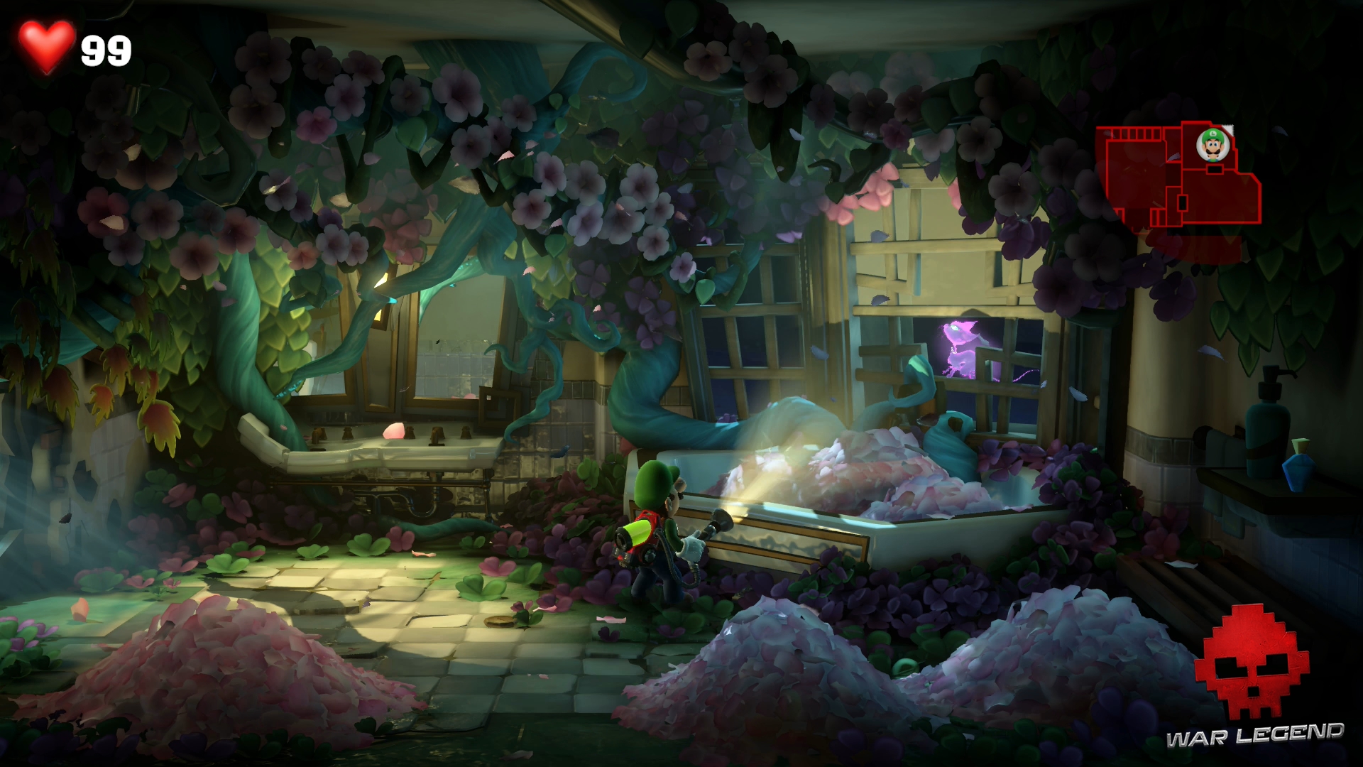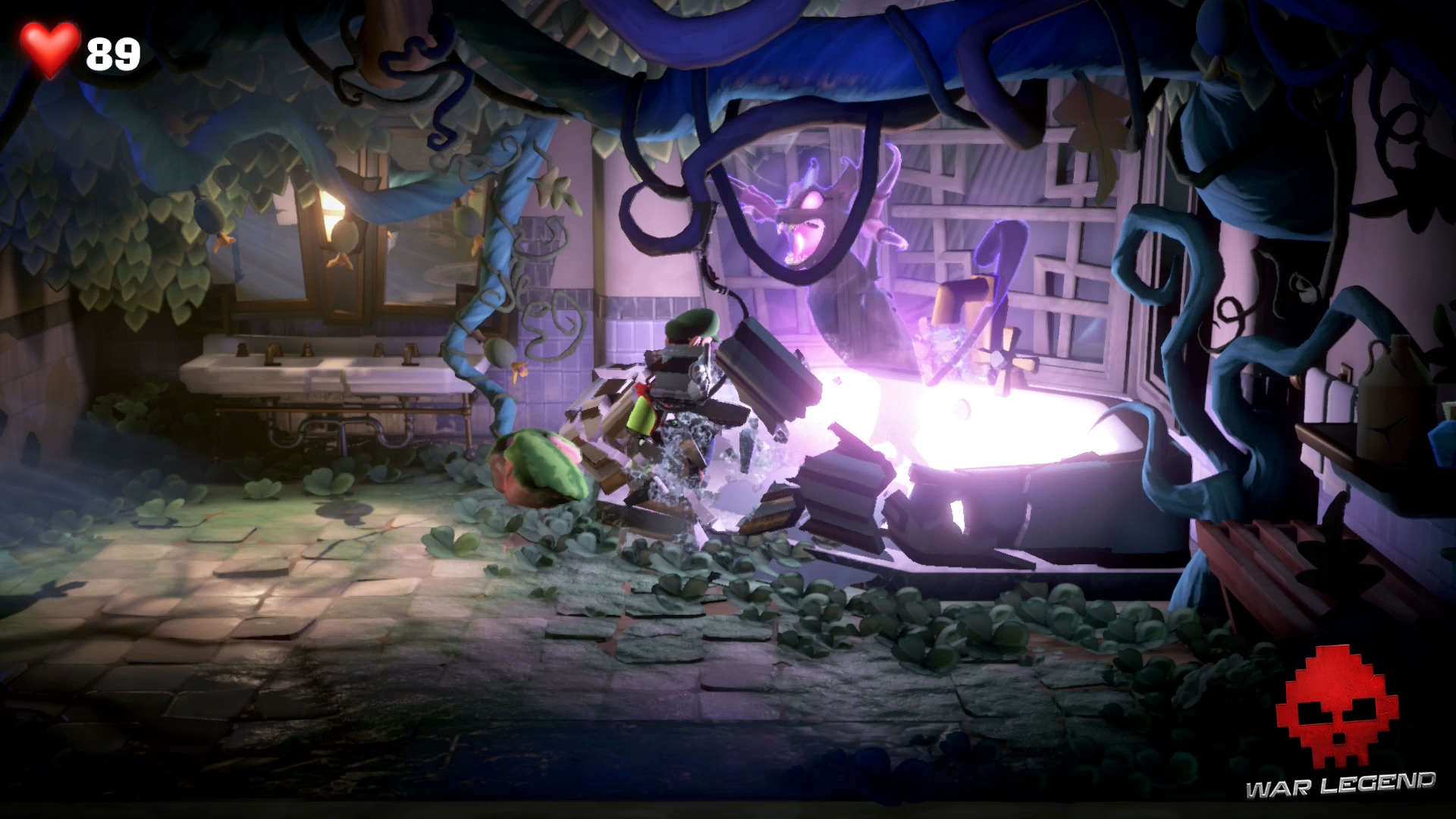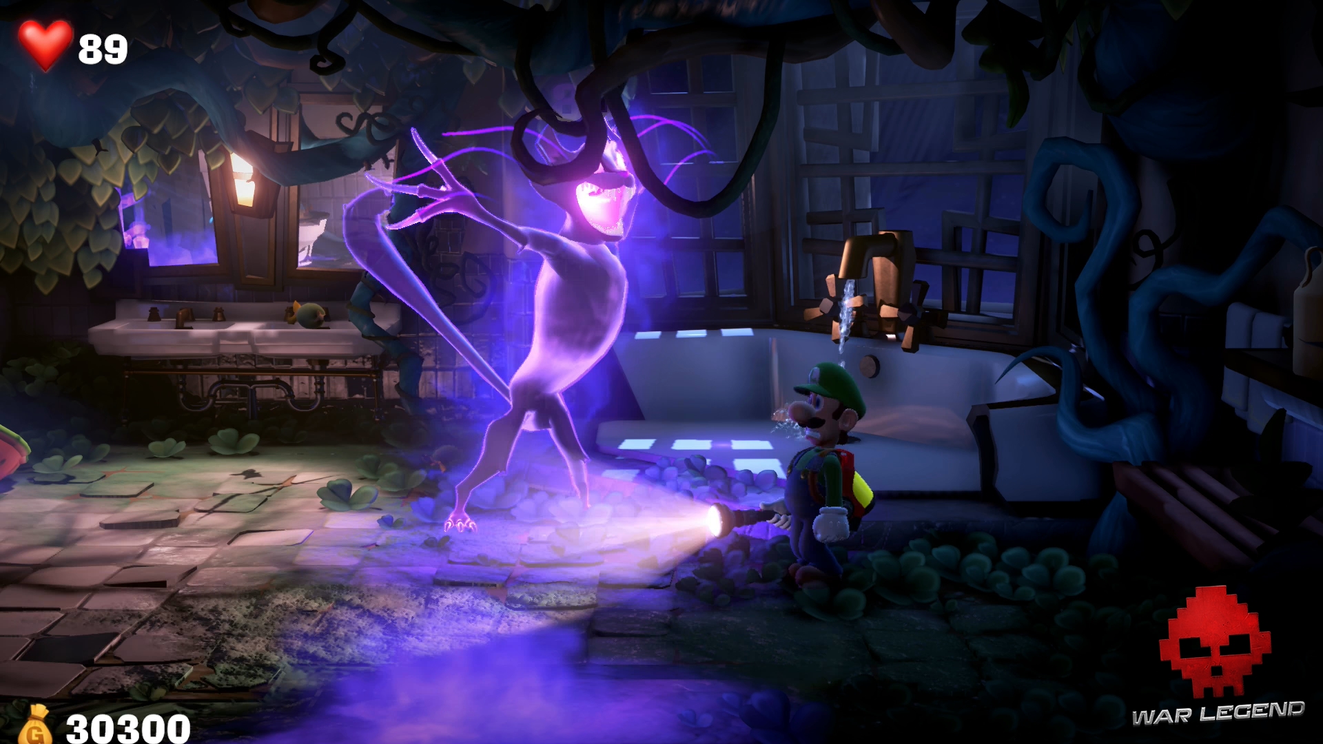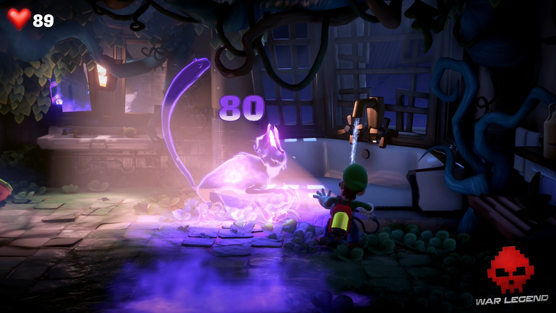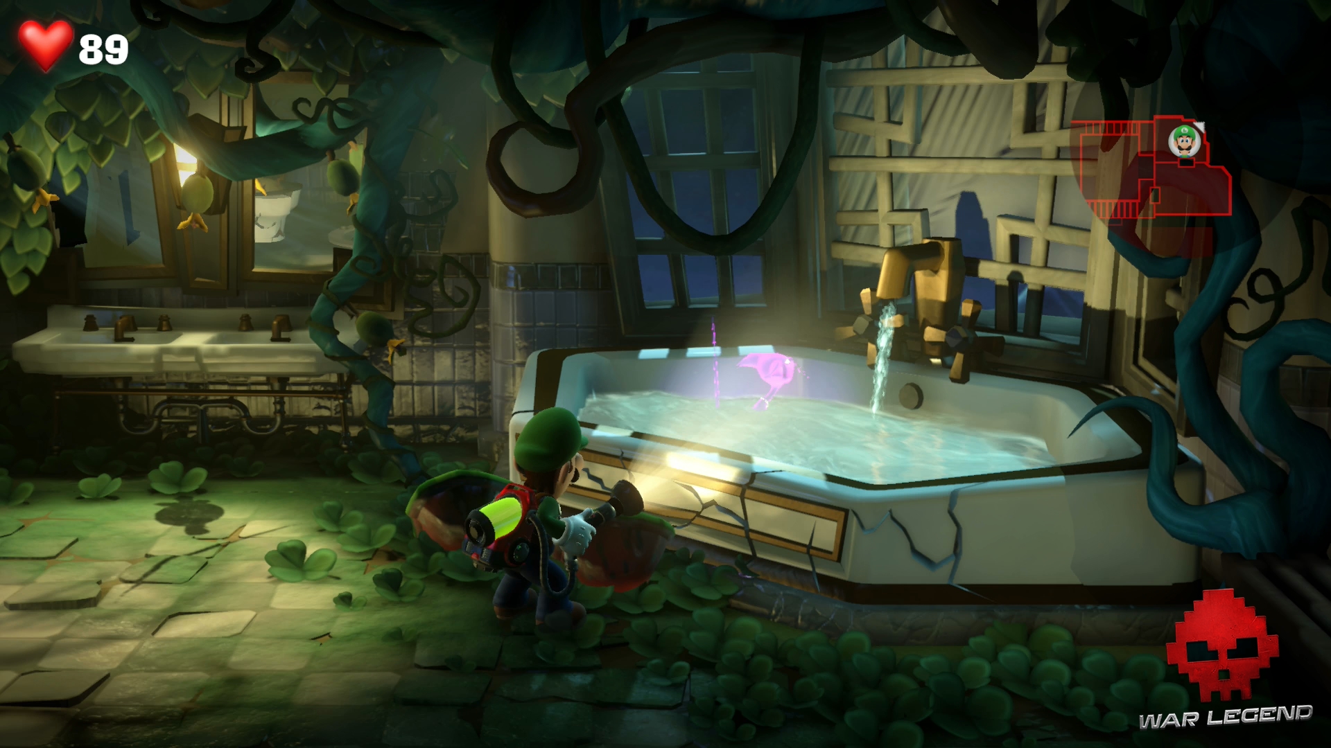 Rentrez dans la chambre suivante à l’étage suivant et rendez-vous à la salle de bain. Luigi se fait attraper par un Léchouilleur. Utilisez Gluigi pour le flasher afin qu’il lâche prise, puis tirez sur ses deux langues en même temps pour le capturer.