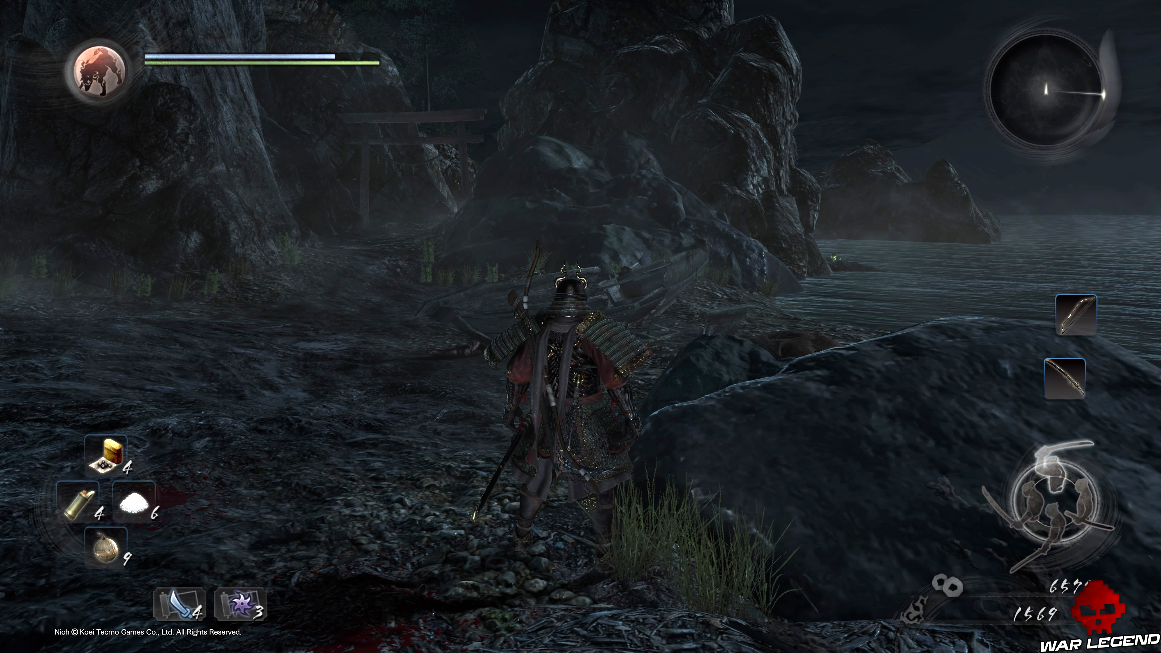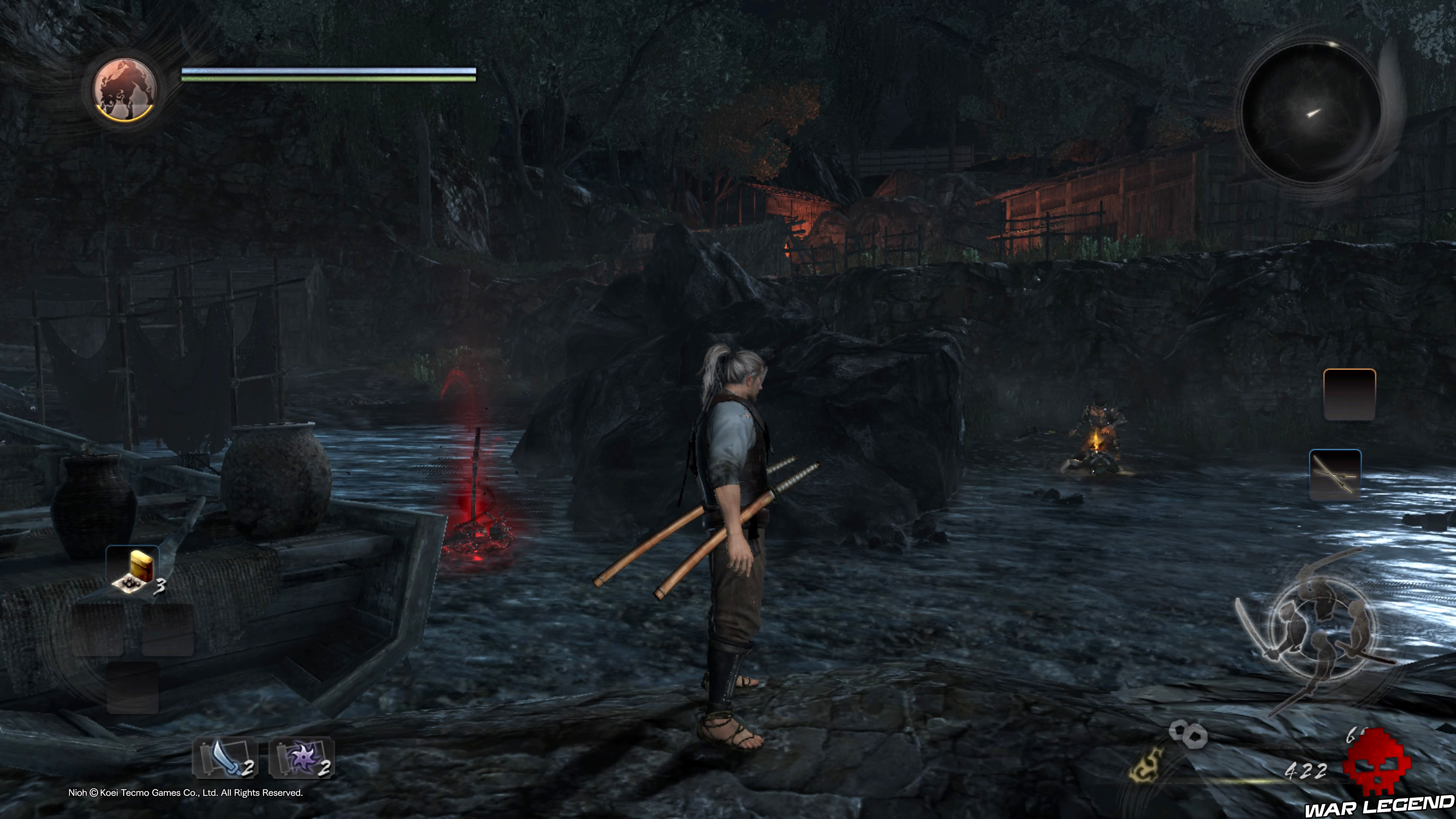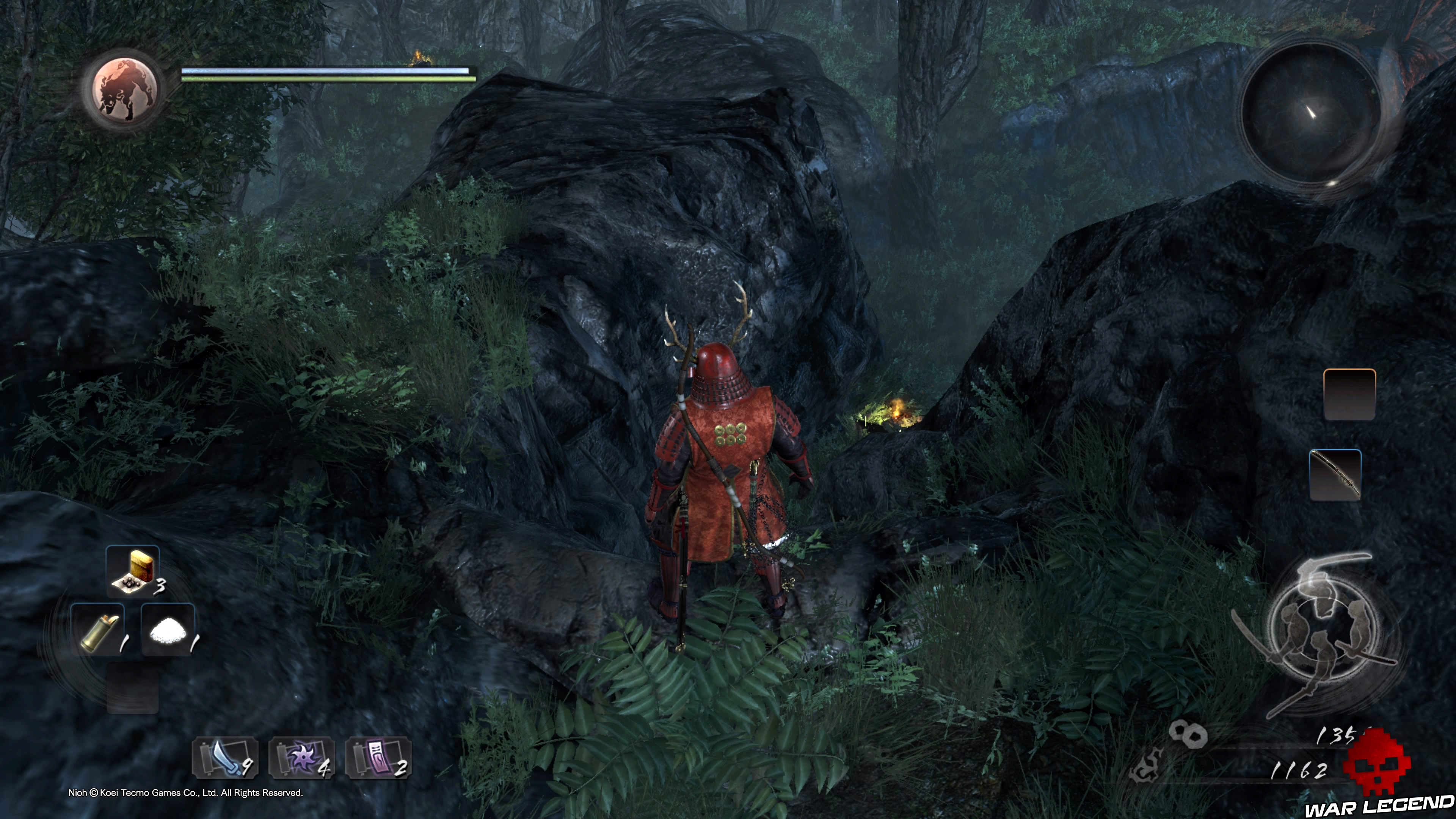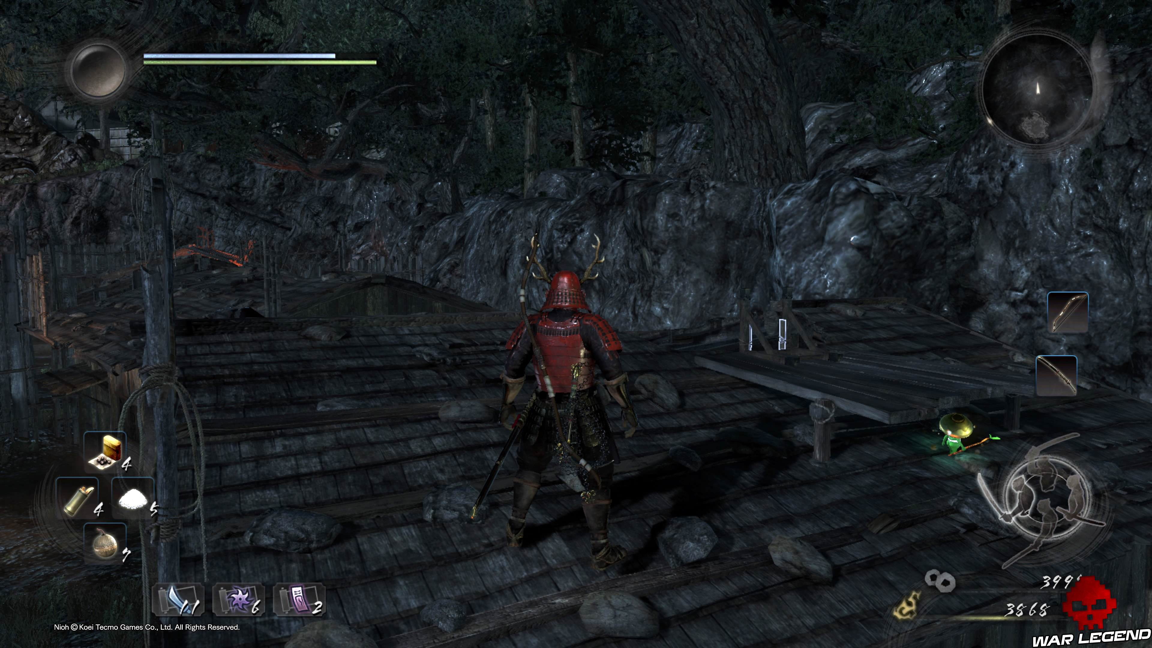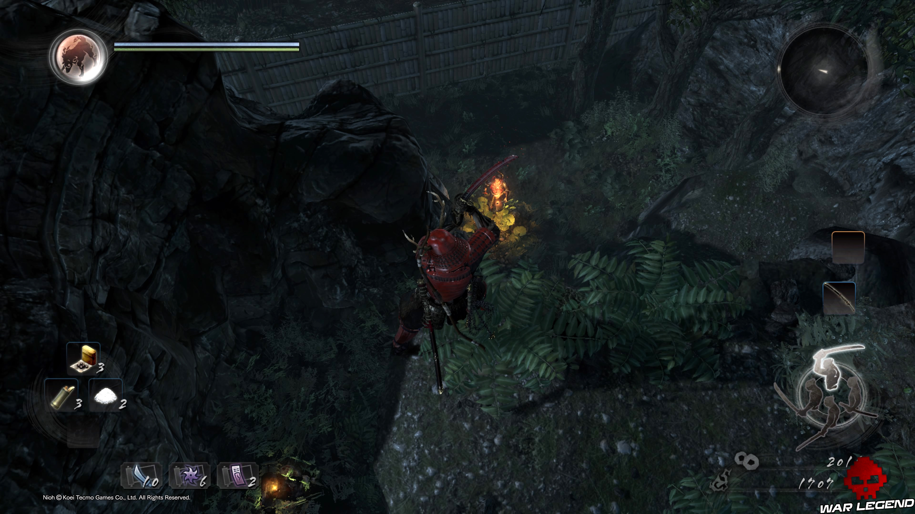 Caché au bout derrière la roche, un Kodama, et sur le cadavre non loin, un « Kabuto » de baroudeur. Maintenant descendez par le chemin qu’il vous reste à emprunter et allez descendre l’échelle qui sert de raccourci vers le premier autel de la zone. Revenez sur vos pas, là où vous avez tué un archer plus tôt, puis regardez sur votre droite en contrebas : tuez l’ennemi et pillez les corps.