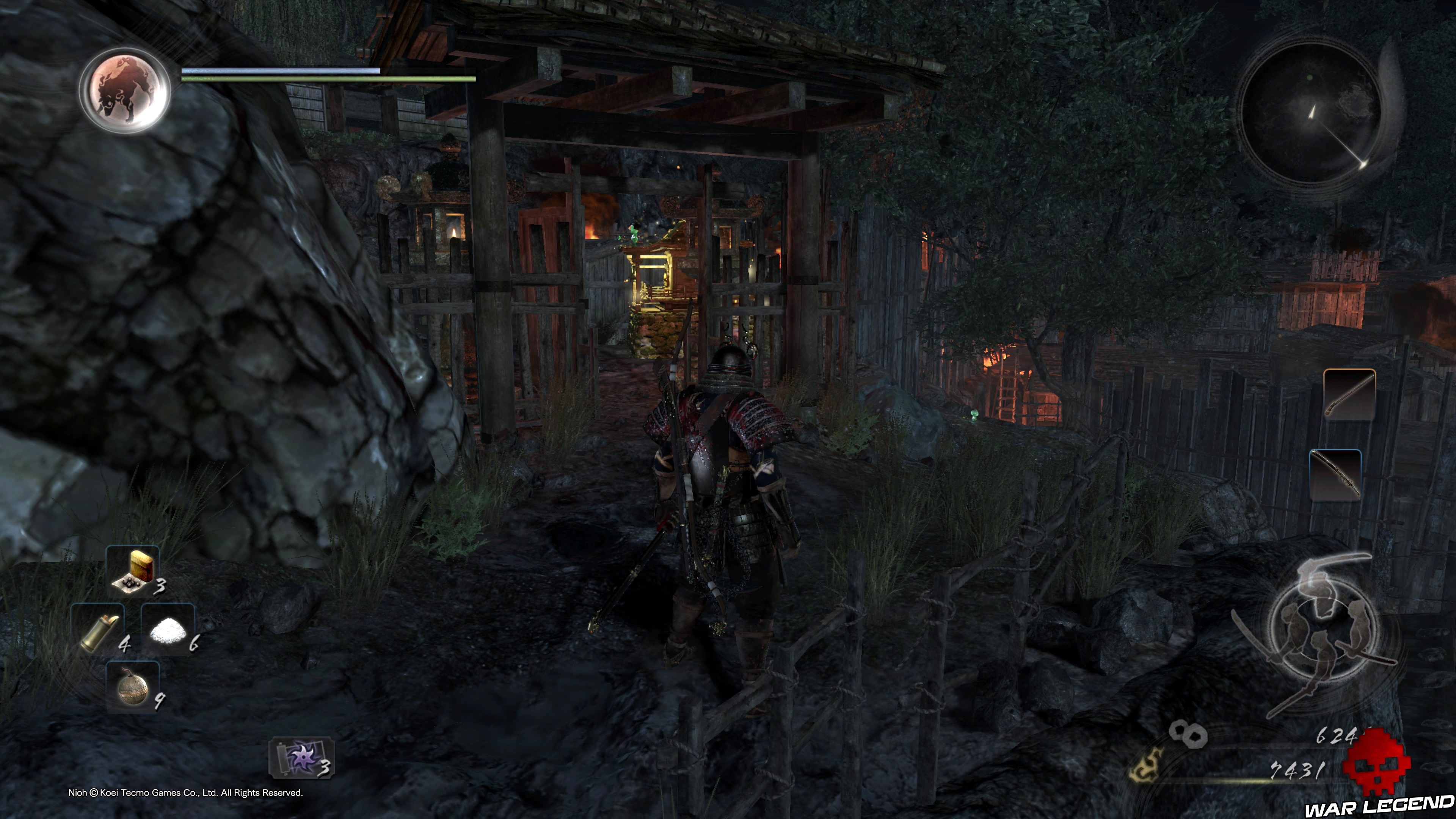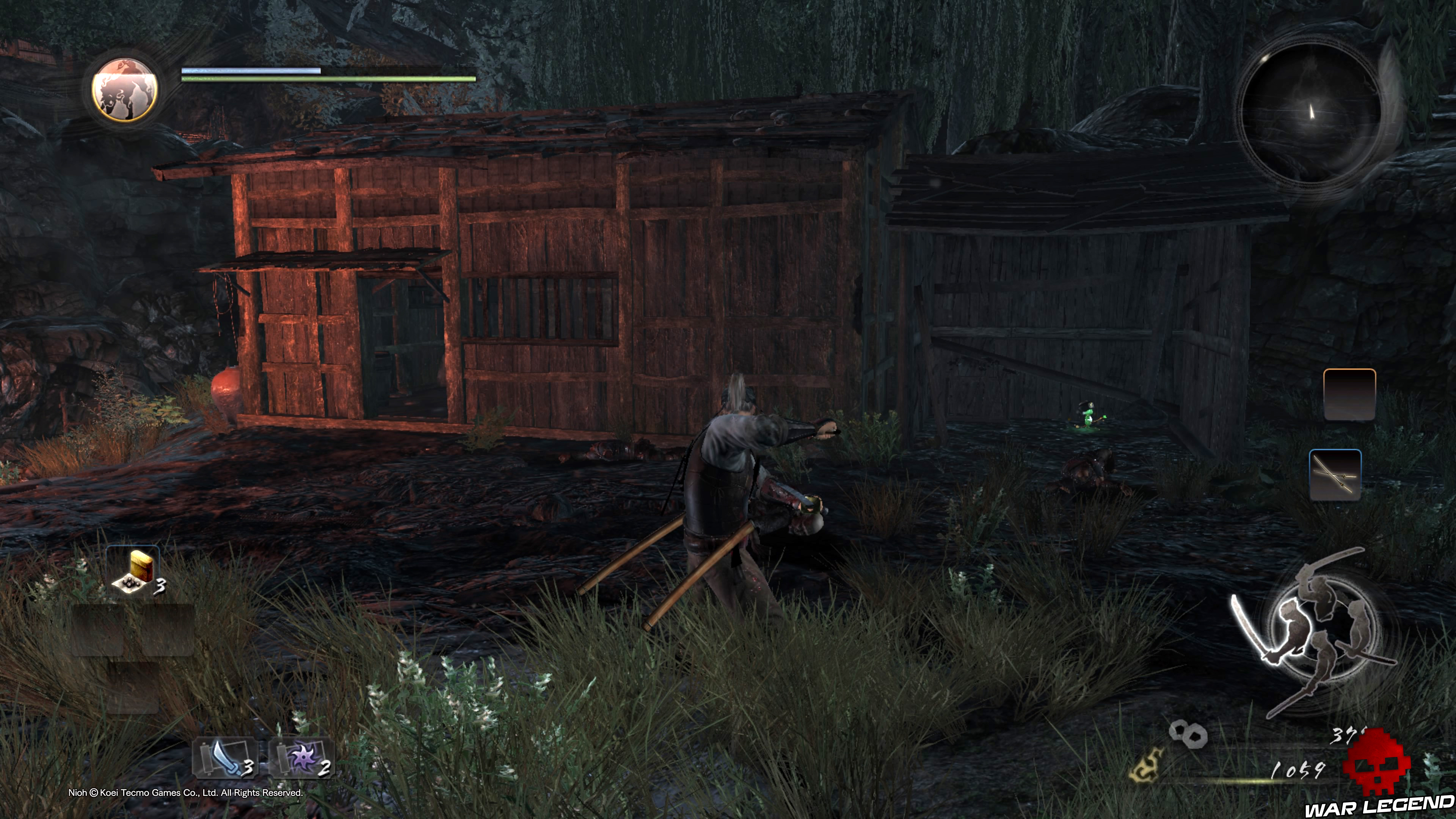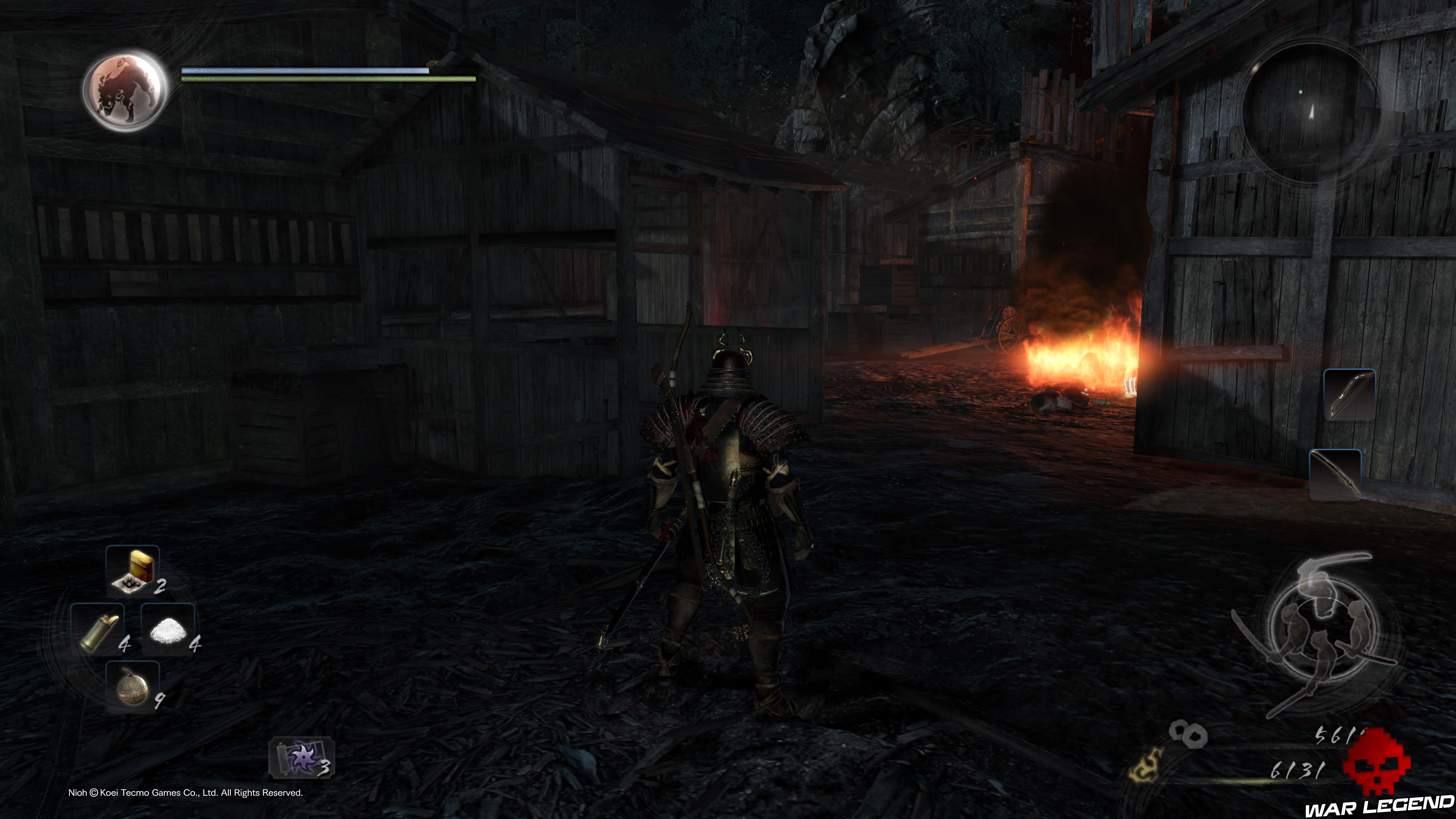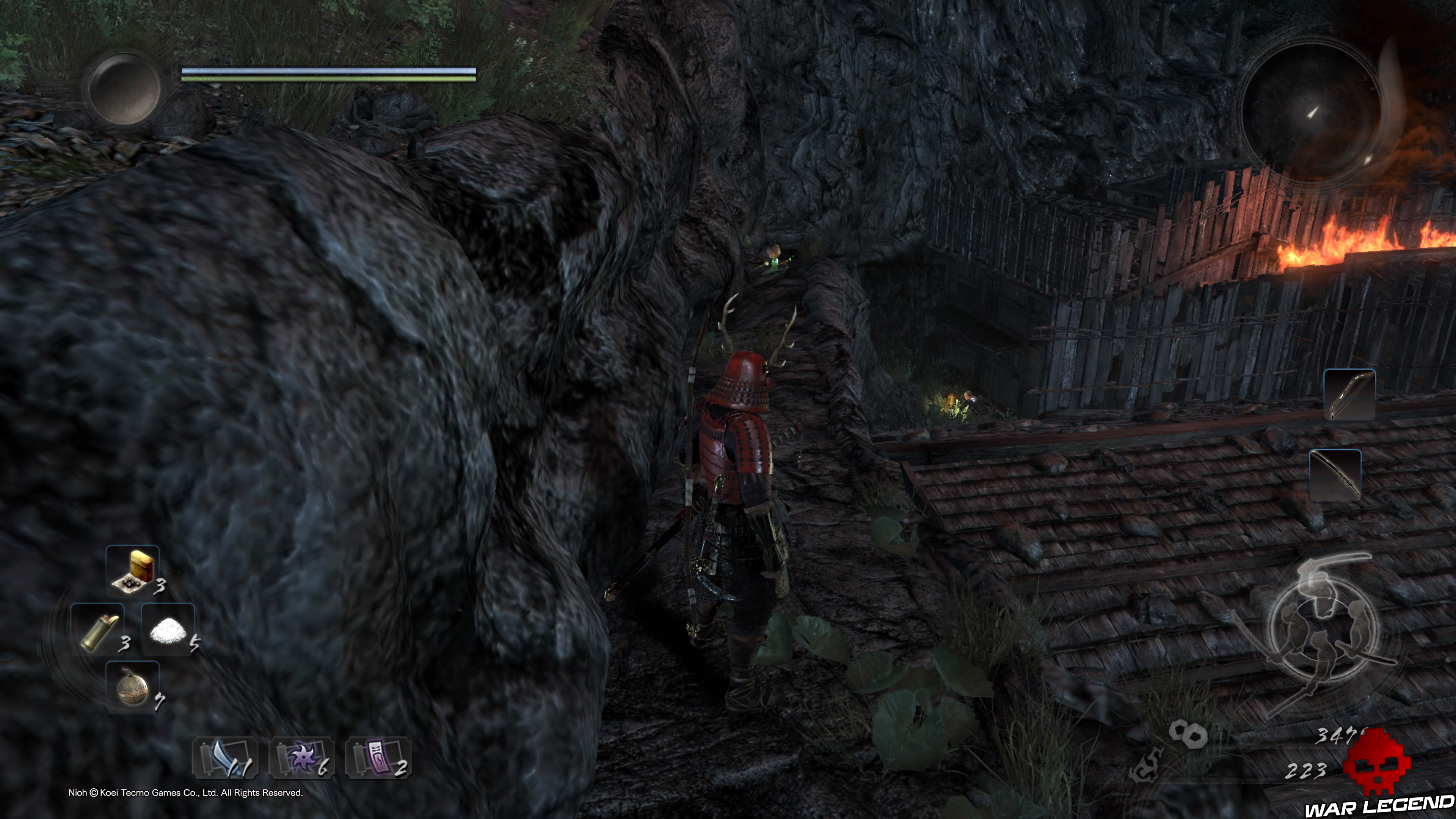 Revenez sur le chemin et poursuivez, en ayant pris soin de contourner la maison par la gauche pour passer derrière et trouver un corps caché derrière des caisses. Attention, non loin du corps affalé près de l’arbre, un ennemi va vous charger avec une lance depuis la gauche. Tuez-le, continuez et prenez à gauche pour occire un nouvel ennemi et piller un corps. Explorez maintenant la zone avec quelques maisons. Trois gardes – dont un surgissant de la maison de droite – que vous tuez, et un coffre contenant une « Lance de fantassin » et un « Hizayoroi » de fantassin. Grimpez maintenant la pente à proximité, éliminez un adversaire puis allez au bout du chemin pour tomber sur un toit avec un corps à piller (il contient des « Horoku-dama ») – ne vous dirigez pas vers la maison derrière les palissades, quatre ennemis vous tomberaient dessus.