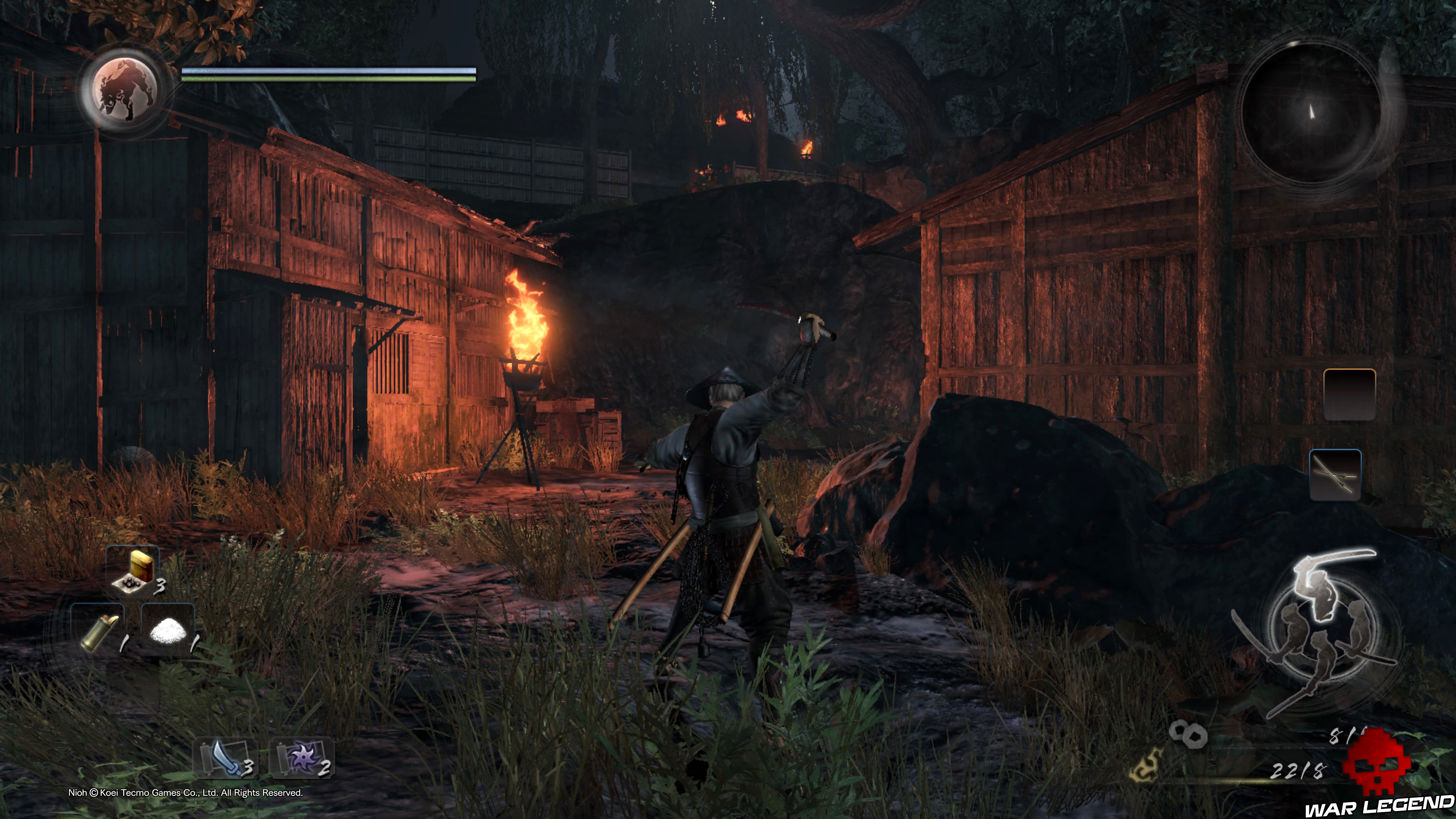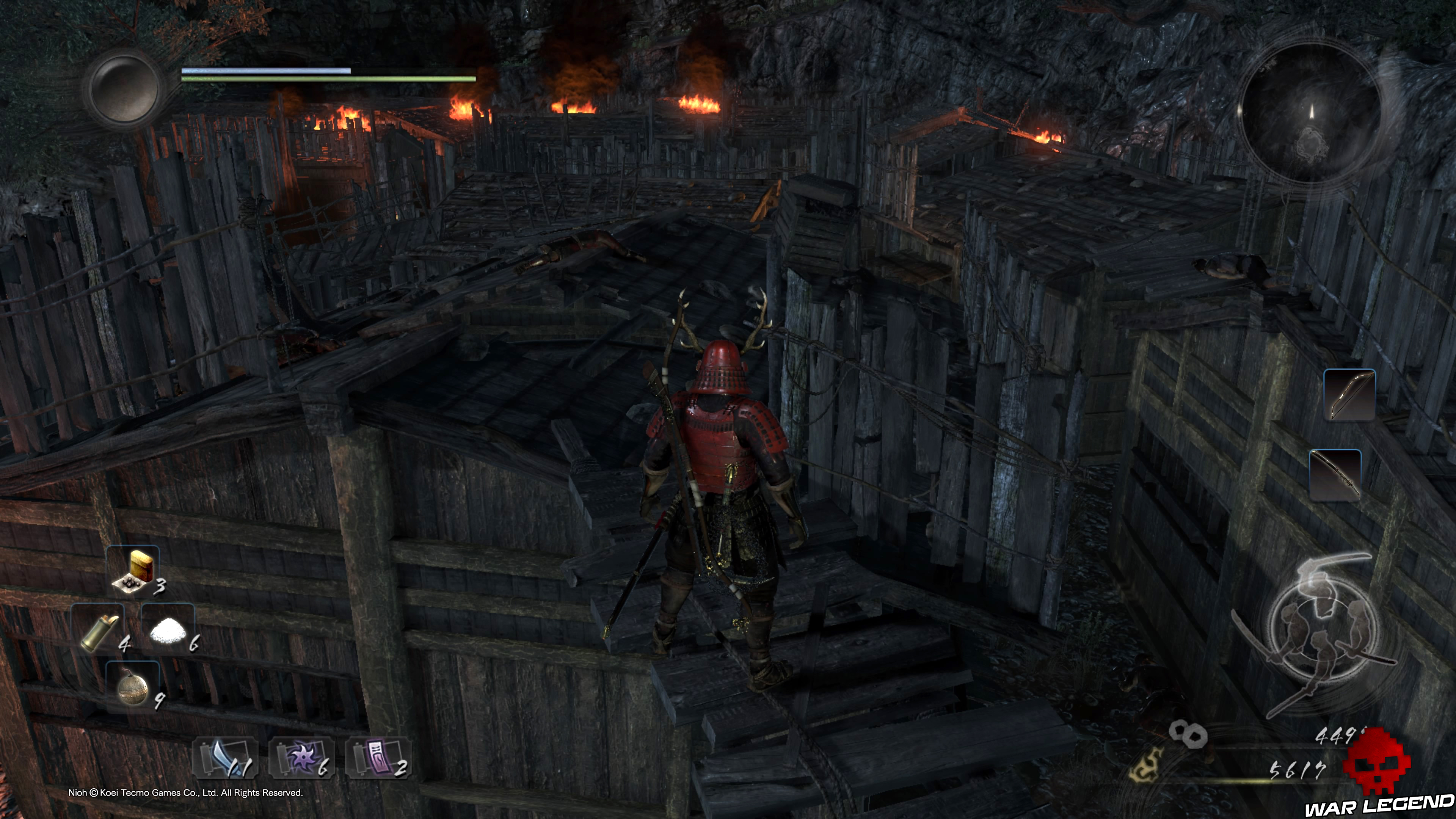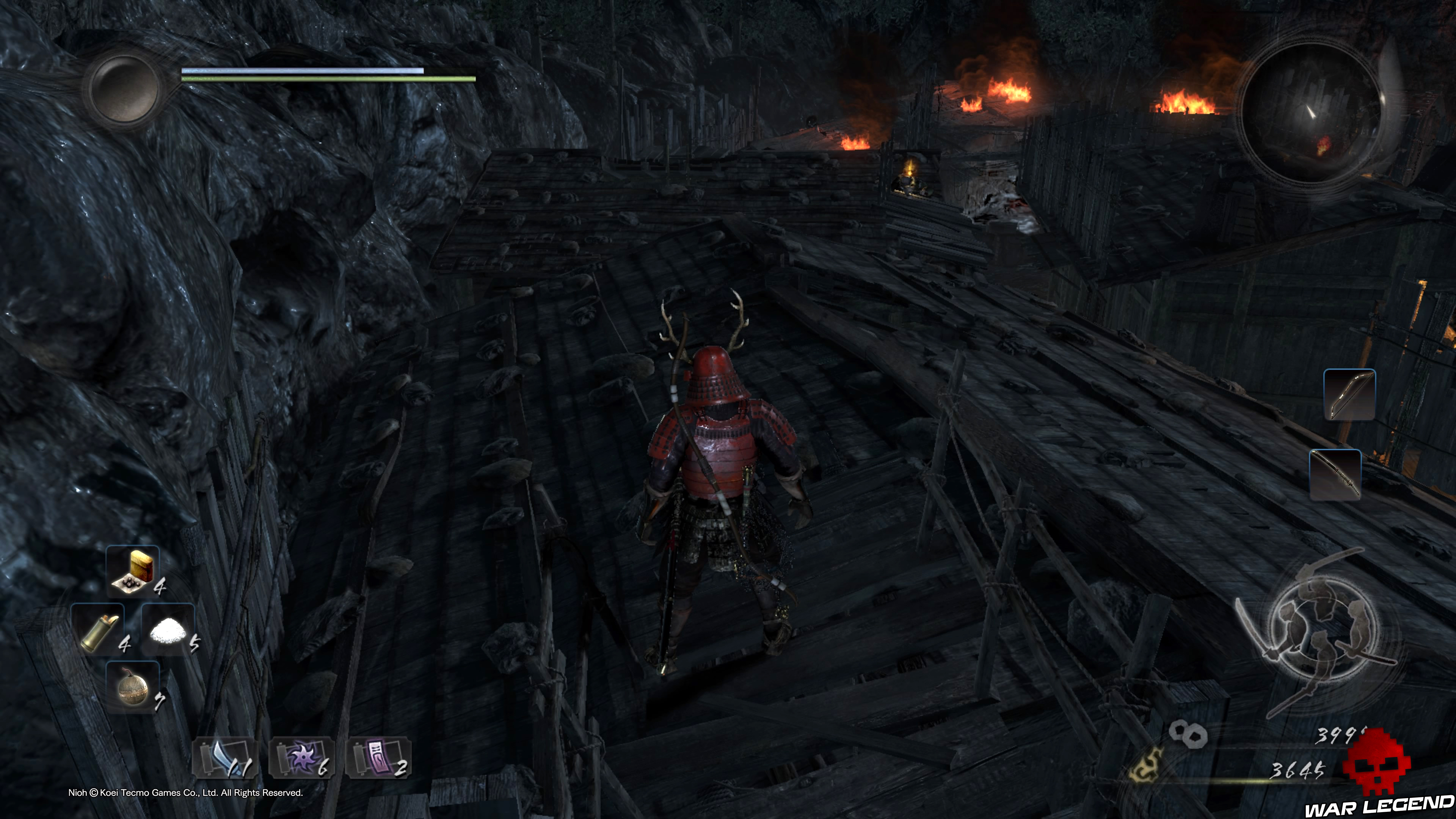 Revenez sur le chemin et poursuivez, en ayant pris soin de contourner la maison par la gauche pour passer derrière et trouver un corps caché derrière des caisses. Attention, non loin du corps affalé près de l’arbre, un ennemi va vous charger avec une lance depuis la gauche. Tuez-le, continuez et prenez à gauche pour occire un nouvel ennemi et piller un corps. Explorez maintenant la zone avec quelques maisons. Trois gardes – dont un surgissant de la maison de droite – que vous tuez, et un coffre contenant une « Lance de fantassin » et un « Hizayoroi » de fantassin. Grimpez maintenant la pente à proximité, éliminez un adversaire puis allez au bout du chemin pour tomber sur un toit avec un corps à piller (il contient des « Horoku-dama ») – ne vous dirigez pas vers la maison derrière les palissades, quatre ennemis vous tomberaient dessus.
