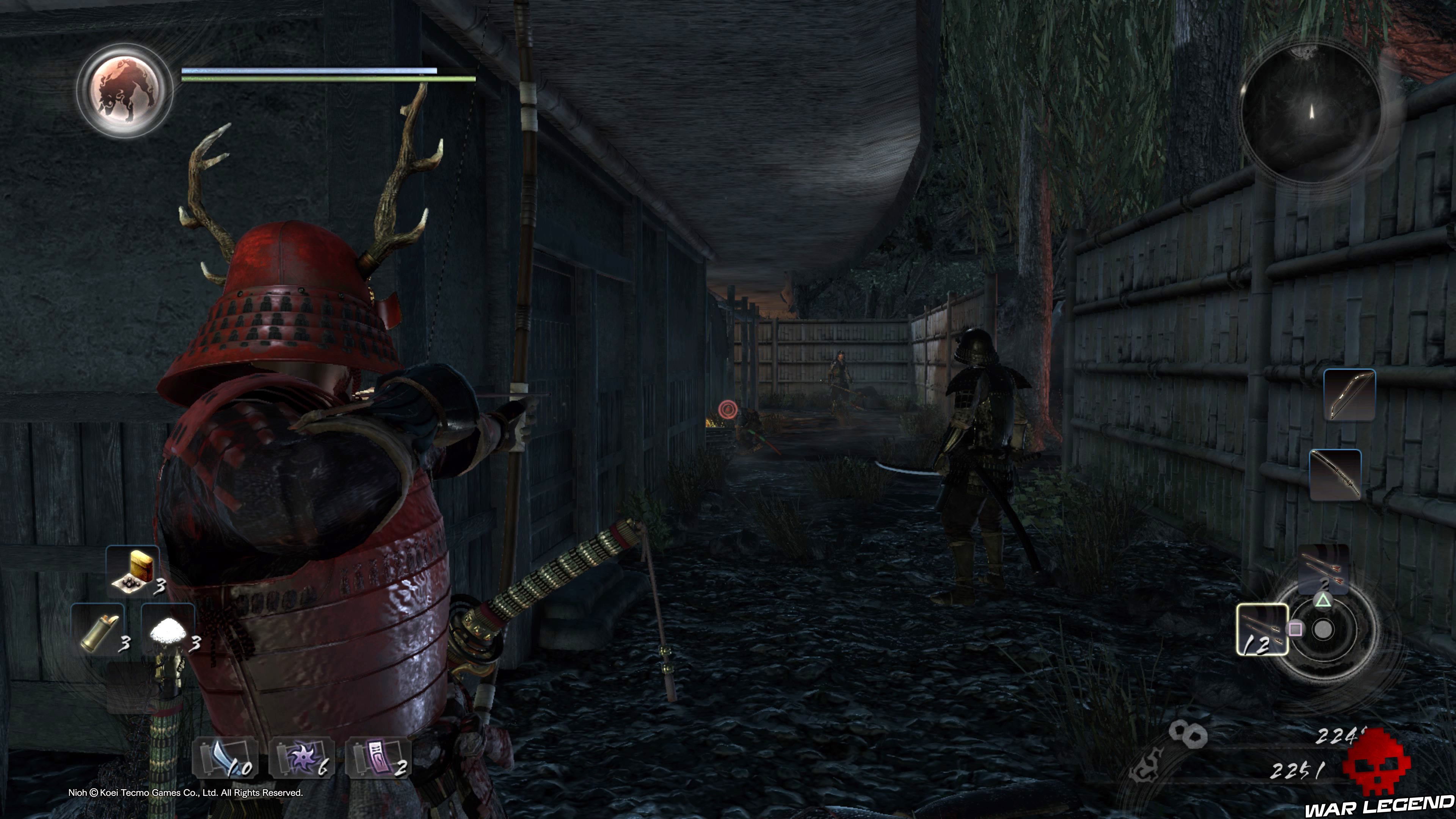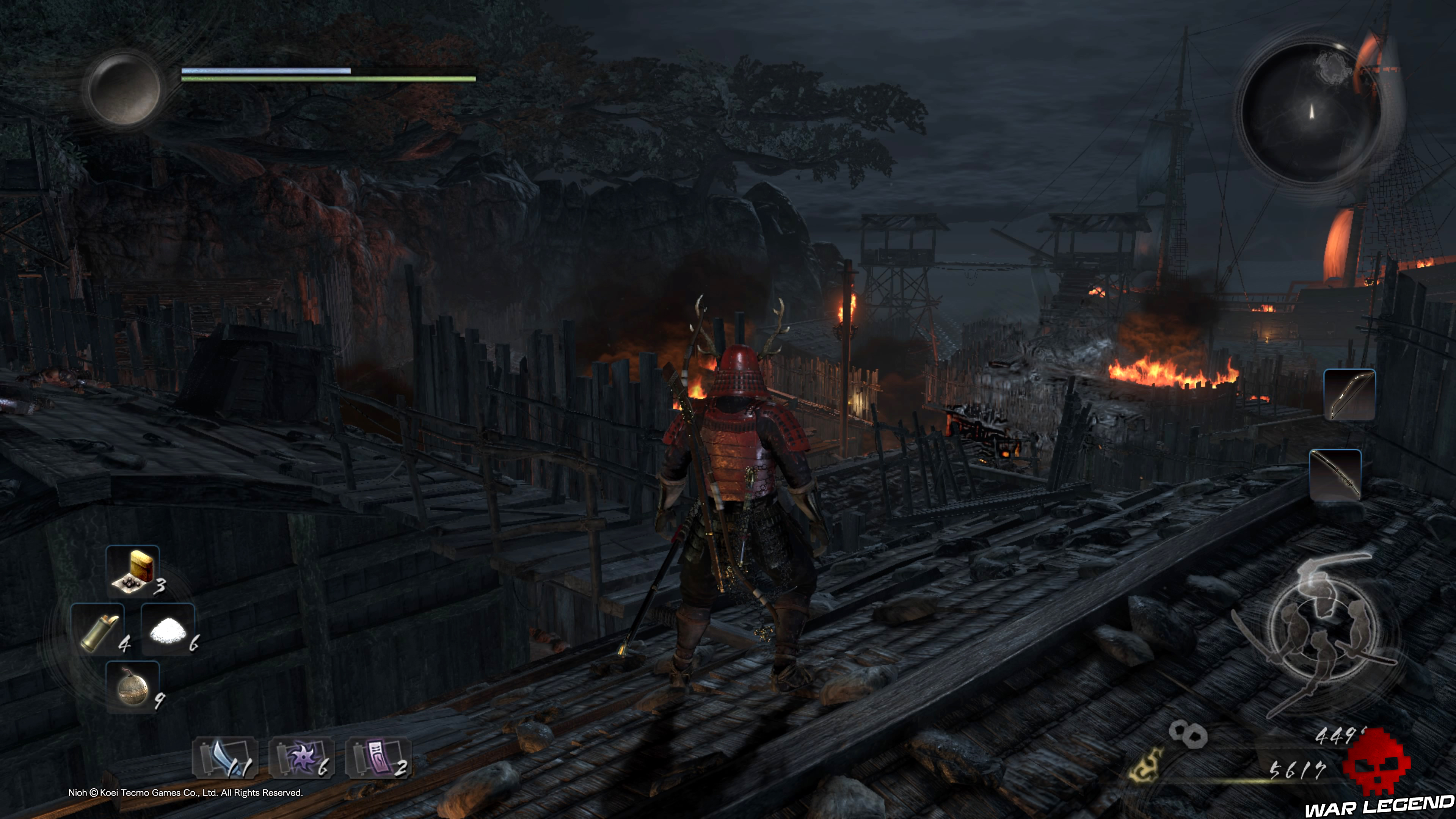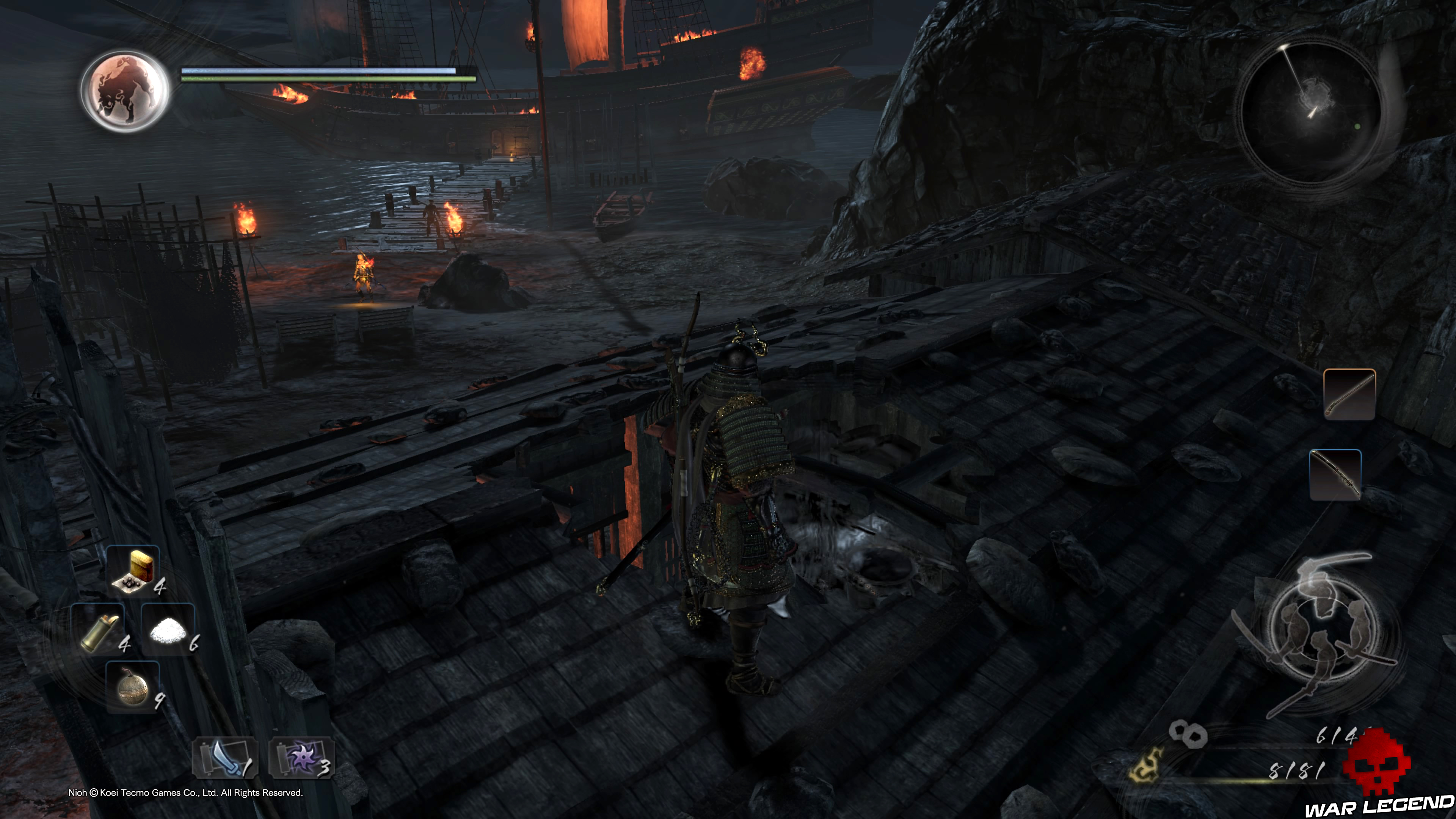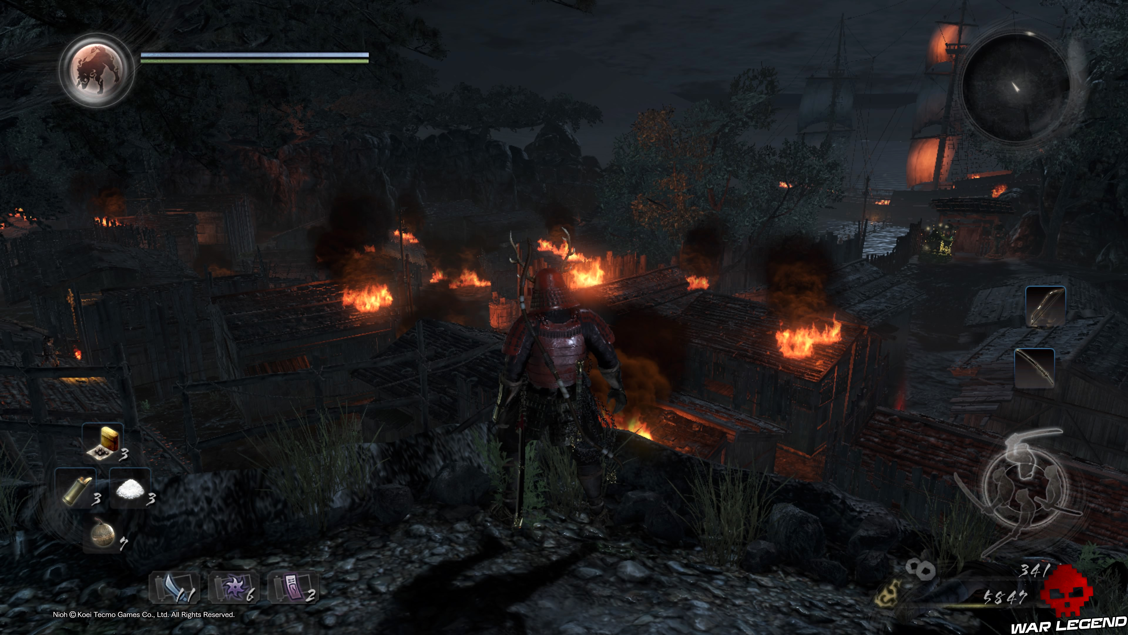 Revenez sur le chemin et poursuivez, en ayant pris soin de contourner la maison par la gauche pour passer derrière et trouver un corps caché derrière des caisses. Attention, non loin du corps affalé près de l’arbre, un ennemi va vous charger avec une lance depuis la gauche. Tuez-le, continuez et prenez à gauche pour occire un nouvel ennemi et piller un corps. Explorez maintenant la zone avec quelques maisons. Trois gardes – dont un surgissant de la maison de droite – que vous tuez, et un coffre contenant une « Lance de fantassin » et un « Hizayoroi » de fantassin. Grimpez maintenant la pente à proximité, éliminez un adversaire puis allez au bout du chemin pour tomber sur un toit avec un corps à piller (il contient des « Horoku-dama ») – ne vous dirigez pas vers la maison derrière les palissades, quatre ennemis vous tomberaient dessus.