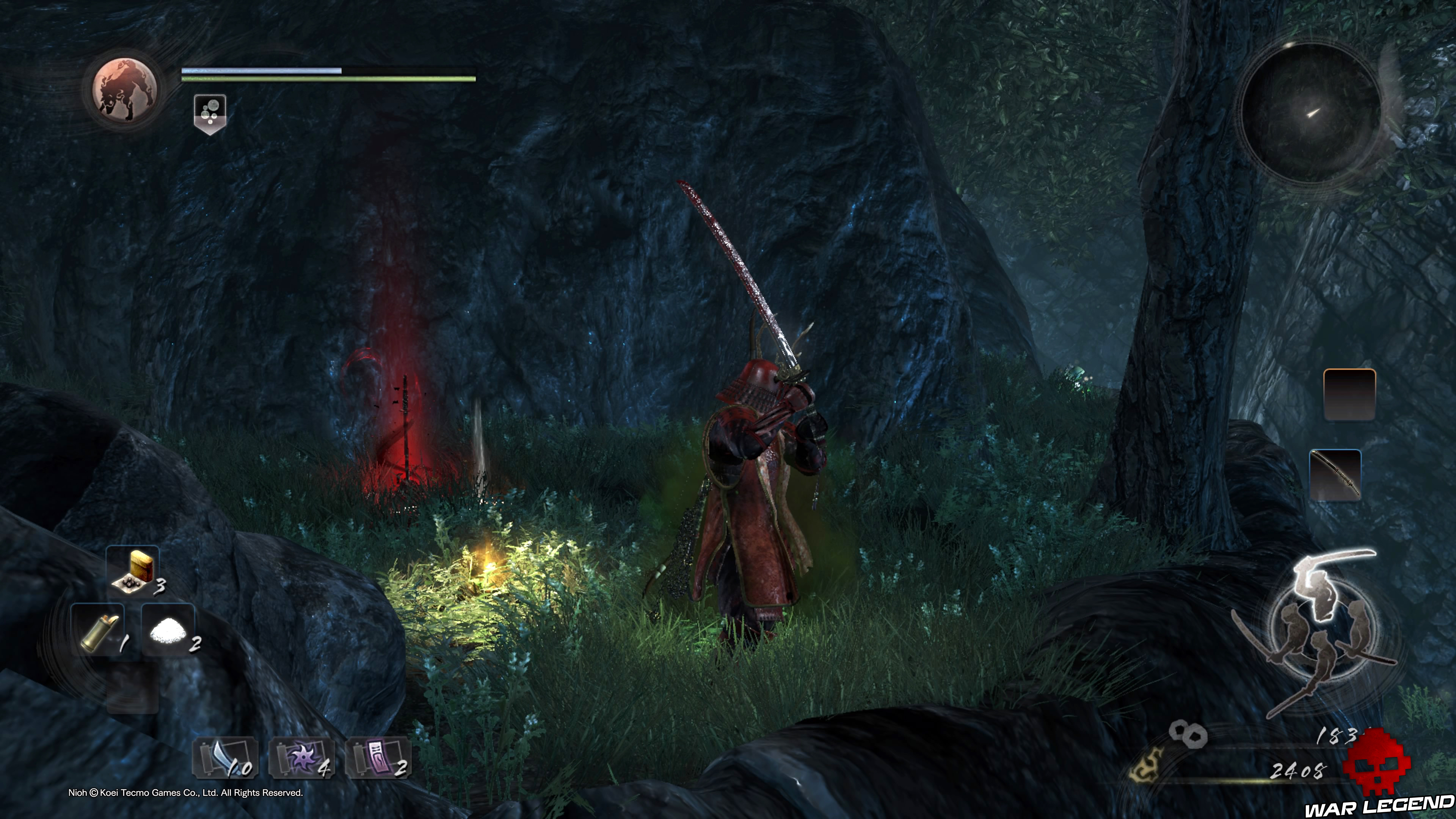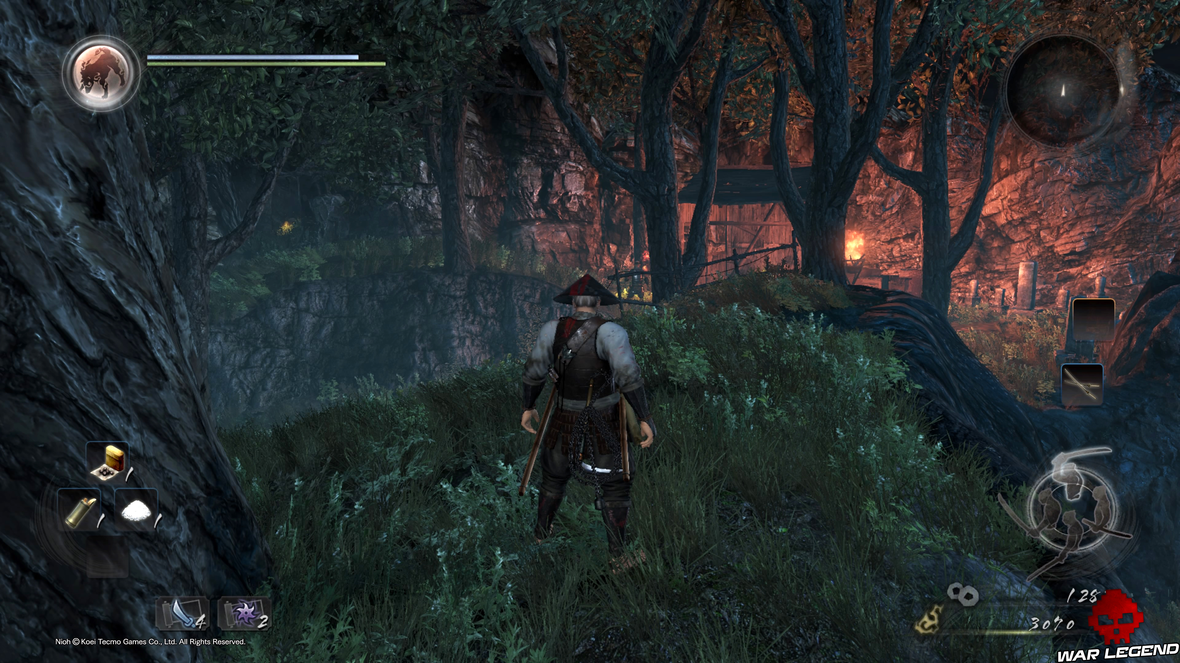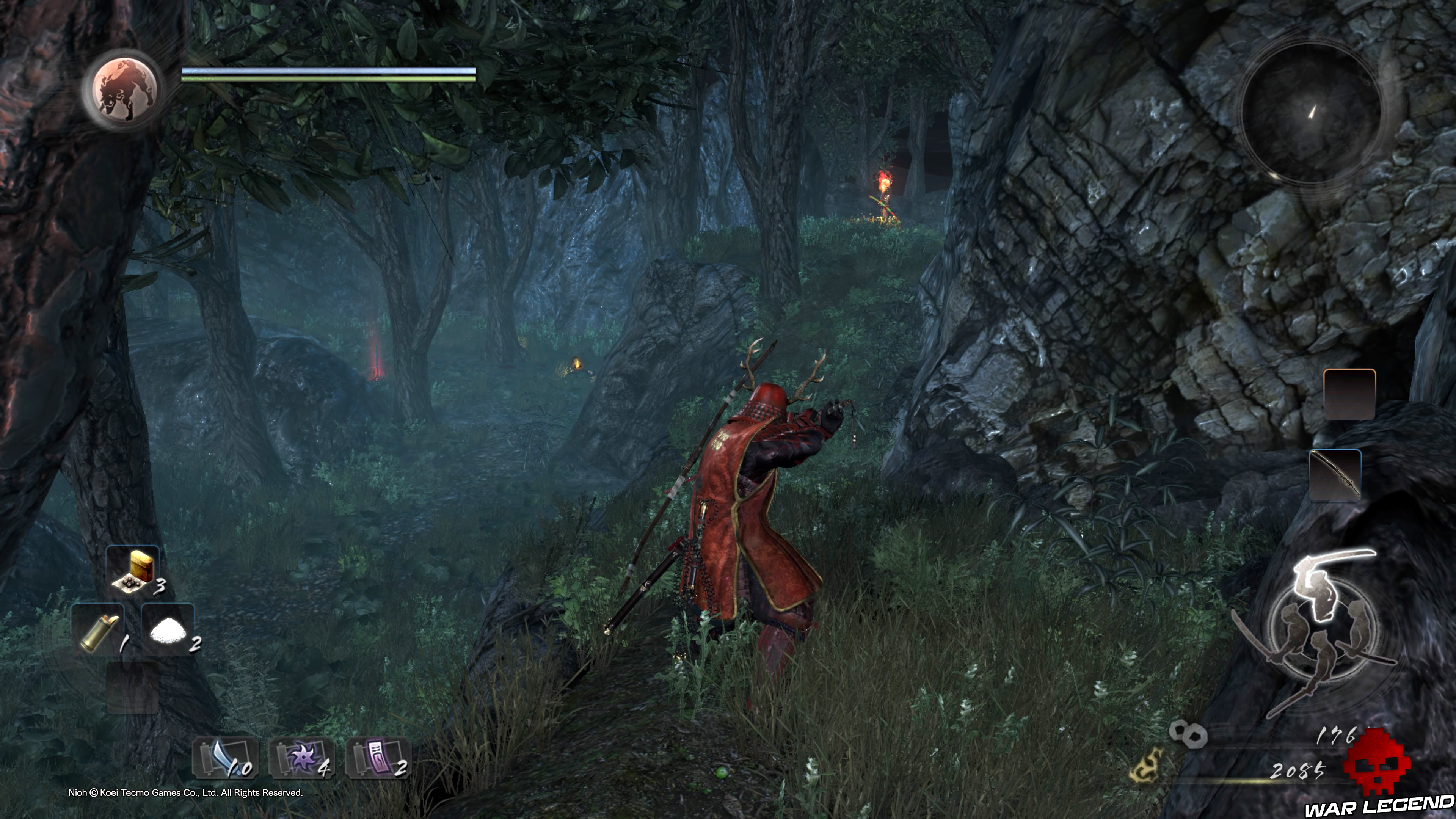 Revenez au chemin, prenez à droite pour monter vers des pierres tombales. Fouillez celle qui se présente devant vous et faites attention à l’ennemi qui va arriver sur votre gauche. Prenez à droite au croisement et grimpez la petite butte de terre – regardez bien derrière le gros arbre pour trouver un Kodama – pour arriver au niveau d’un brasero et d’ennemis supplémentaires. Tuez-les, récupérez l' »Arc long Yumi » et les flèches puis prenez le petit chemin entre deux roches, côté brasero.