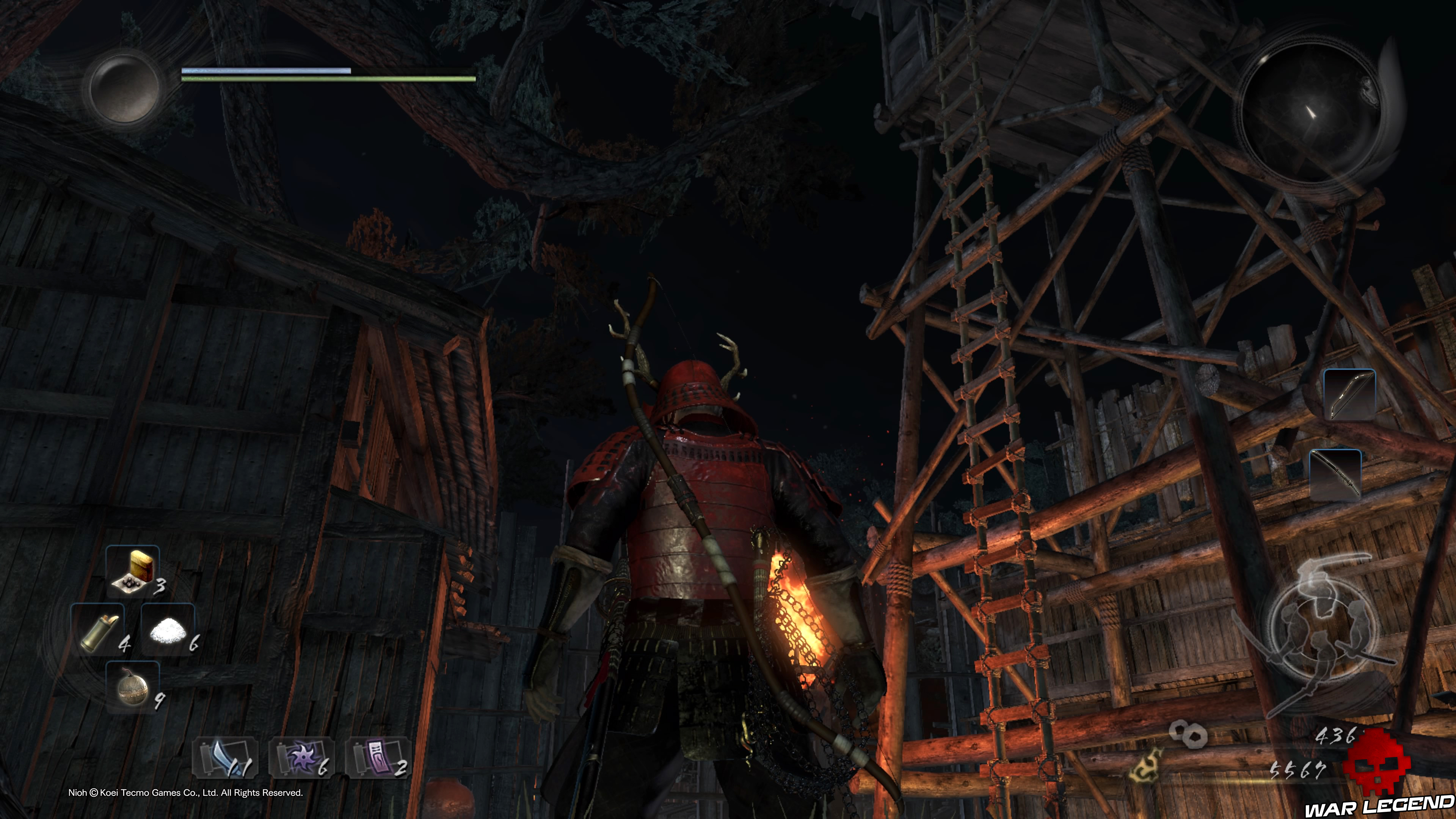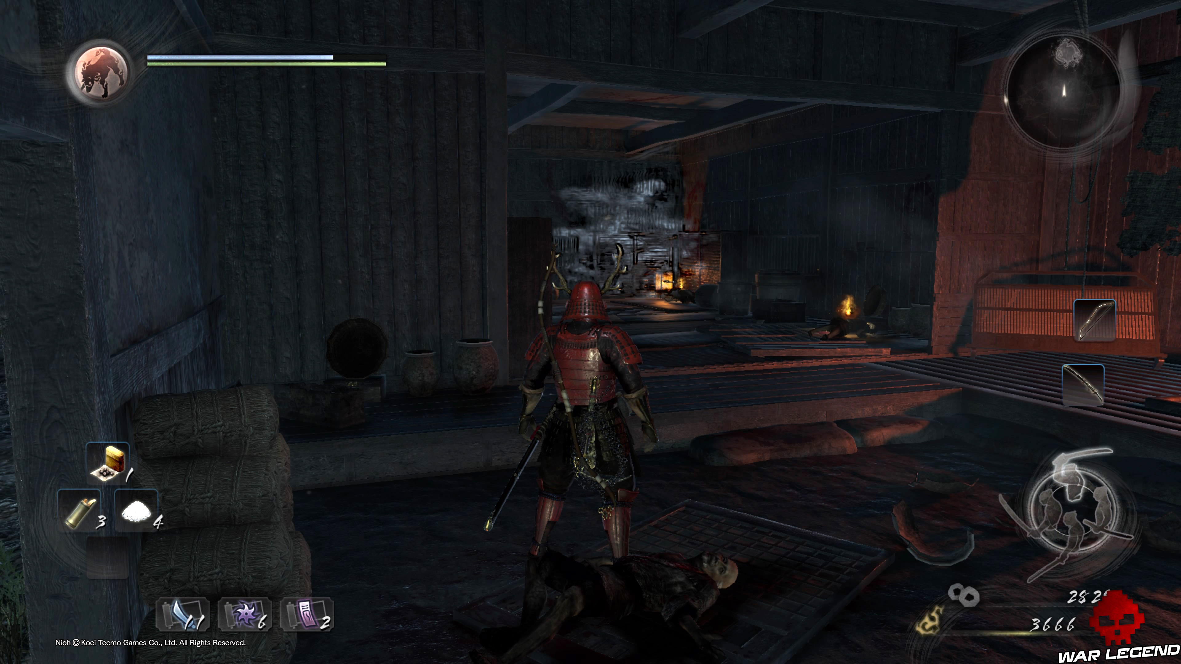Tirez ensuite sur le guerrier au fond pour l’attirer puis éliminez-le à l’écart de son compère. Enfin, zigouille le dernier clampin. Vous pouvez maintenant récupérer le « Bizen-den Tachi » sur le corps. Finissez de faire le tour de la maison, longez la palissade pour trouver un passage sur la droite vers un corps, revenez sur vos pas, avant de repasser la palissade, longez la par la droite pour trouver un Kodoma, puis revenez au niveau de la demeure, tuez le garde qui patrouille devant la bâtisse et entrez dans la dépendance sur la gauche. Tuez l’adversaire et récupérez le « Do » de chef de guerre, le « Kabuto » qui va avec, le « Kote » de baroudeur, l' »Amulette de voyage », les deux « Kayaku-dama » et « Talismans balises ». Entrez maintenant dans la maison et préparez-vous à affronter un Yokai.