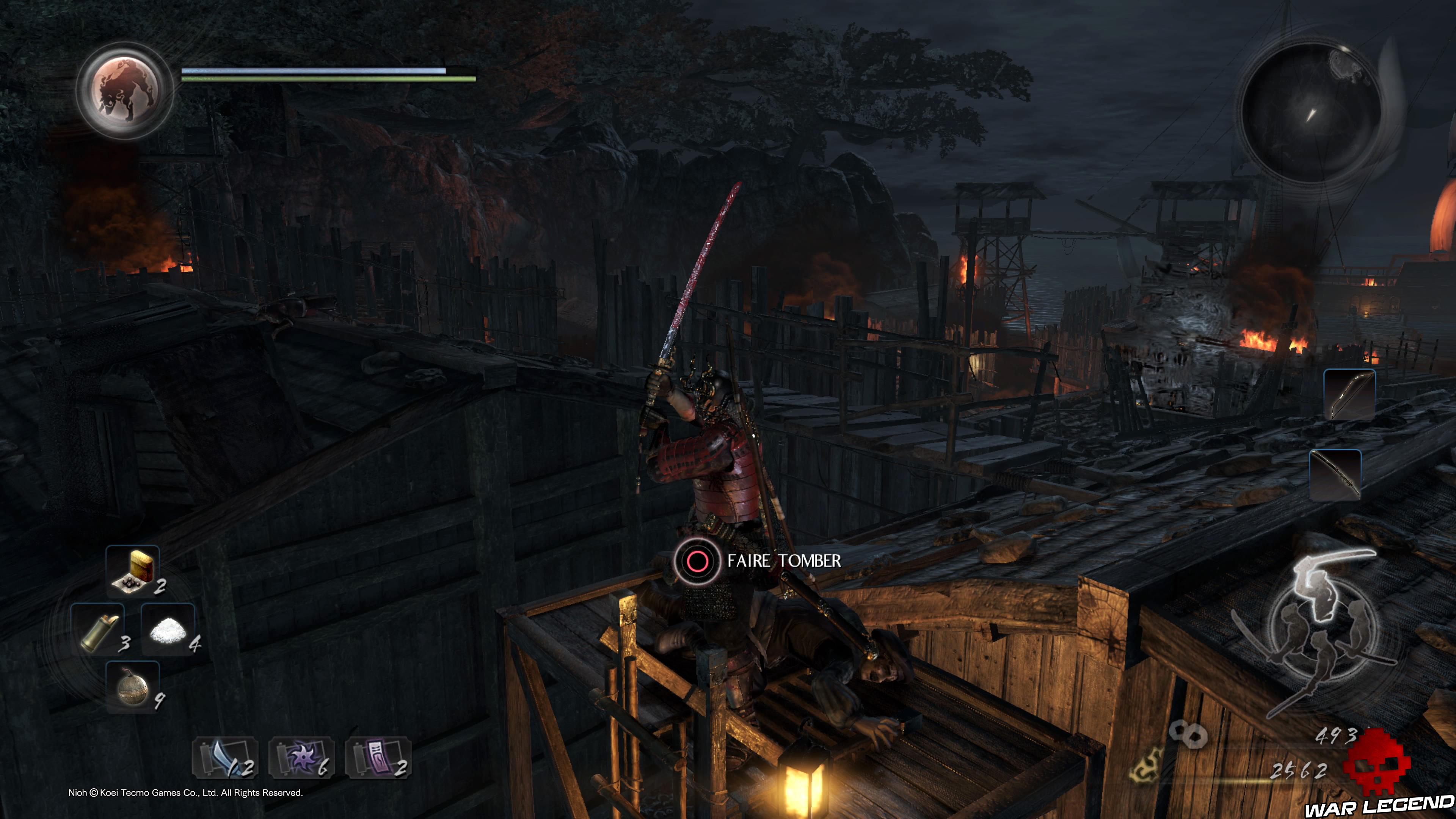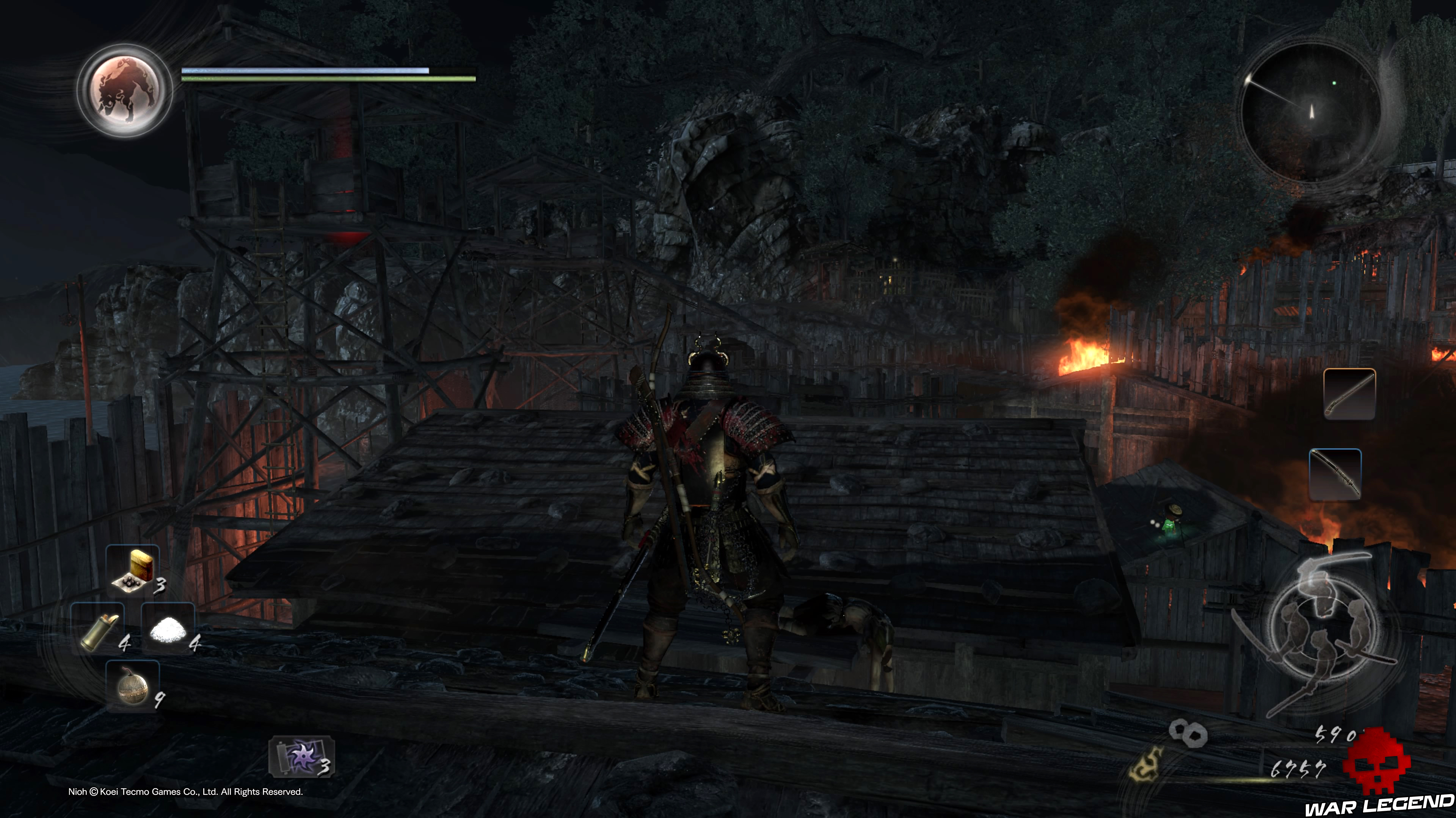 Allez tuer le garde en-dessous, puis continuez et prenez la première à droite pour tuer un guerrier près d’un puits. Regardez sur les toits et éliminez l’archer que vous trouver. Prenez à droite, là où les flammes ravagent un chemin et tuez le Yokai qui apparaît. Attention, il est plus rapide que son prédécesseur car il utilise un double katana. Revenez maintenant sur vos pas et grimpez l’échelle pour passer sur les toits.N’avancez pas trop vite après le pont : une partie du toit est enfoncée et vous passerez au travers si vous marchez dessus. Le problème, c’est que des ennemis attendent en dessous pour vous faire la peau.