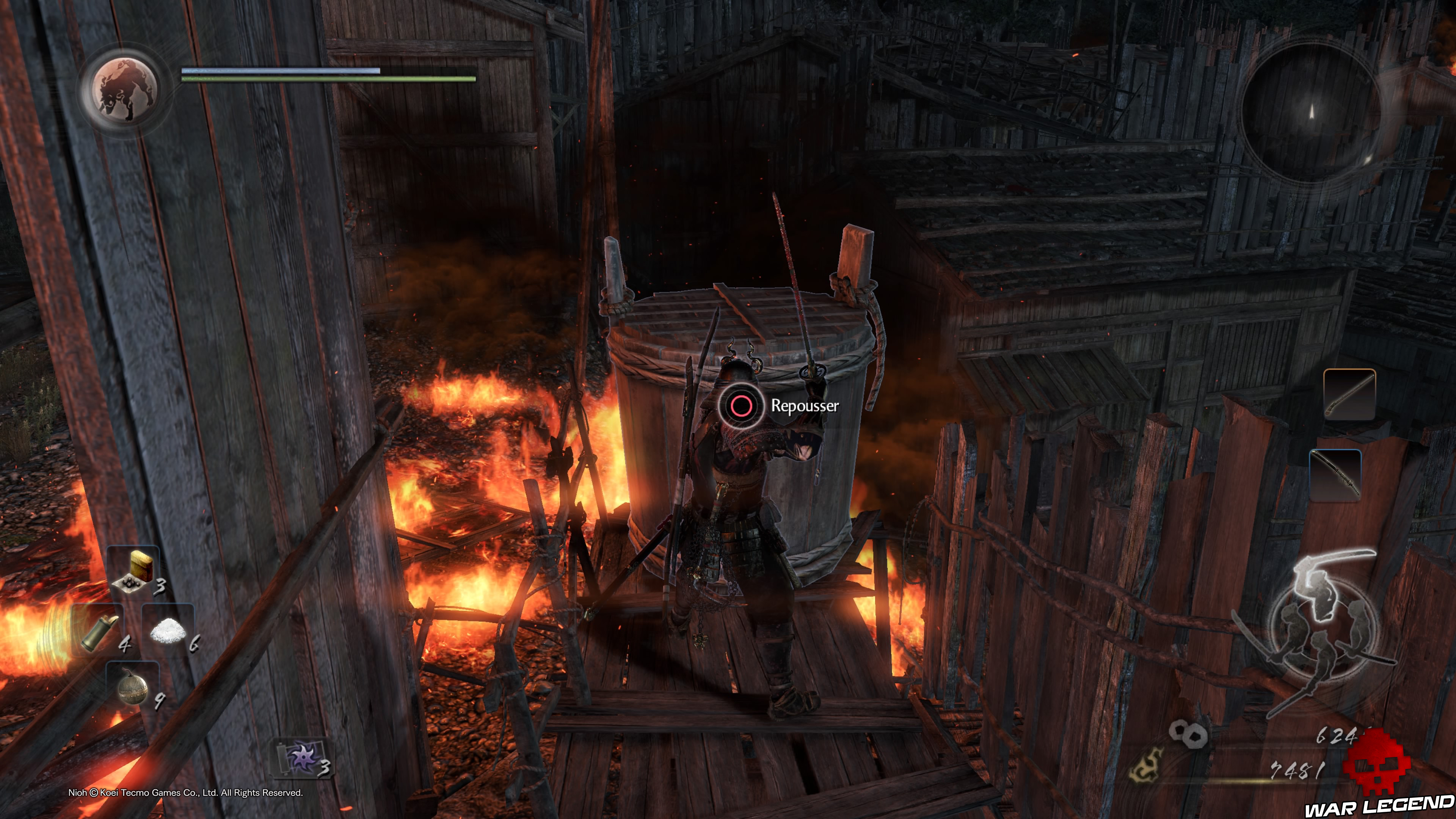 Sautez derrière le Kodoma et montez à l’échelle pour aller renverser un gros tonneau d’eau et ainsi libérer un nouveau raccourci. Vous pouvez maintenant revenir sur la plage, retournez sur la pente et vous laisser tomber sur le toit du deuxième bâtiment pour y avoir accès et affronter un Yokai.