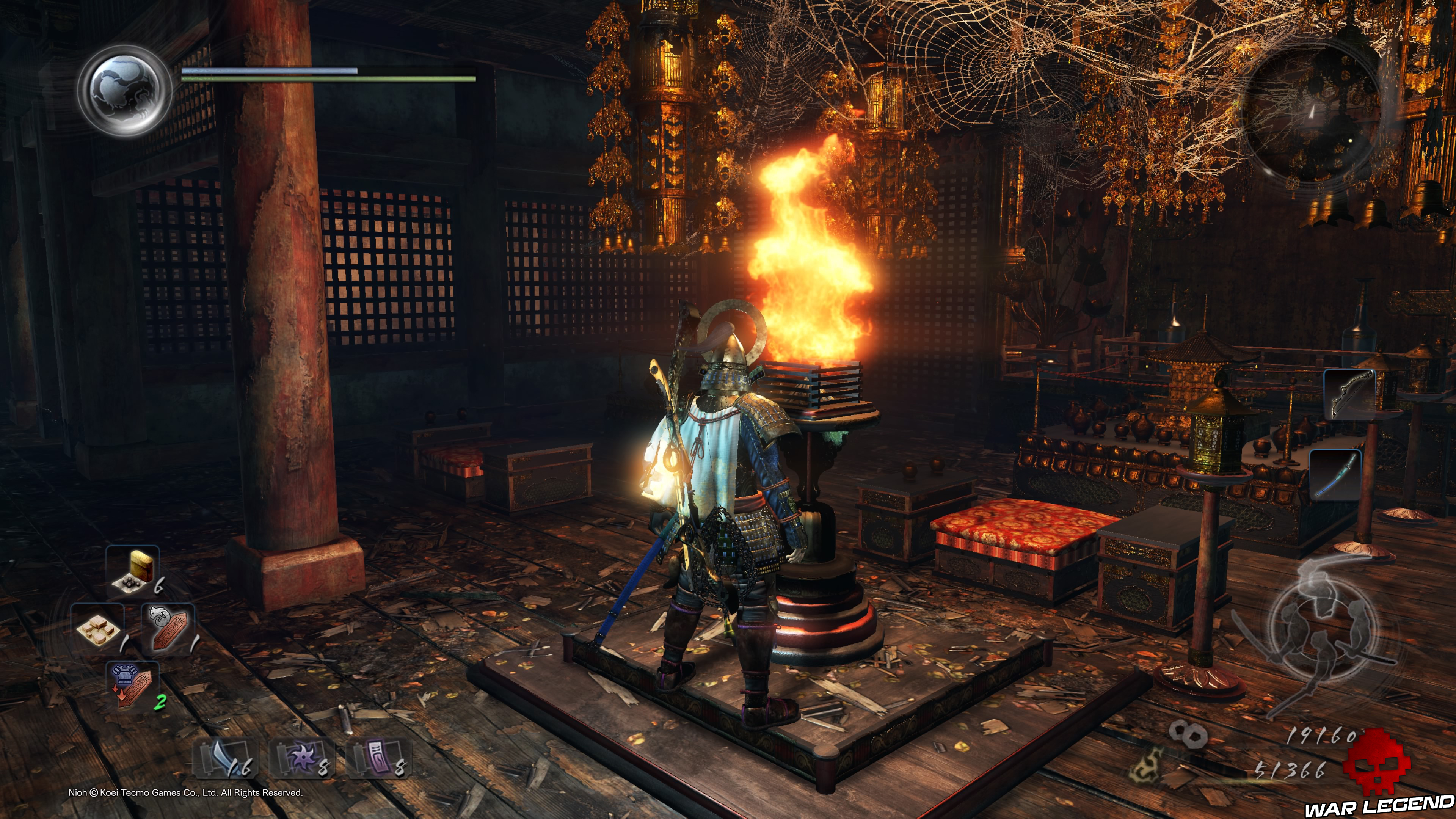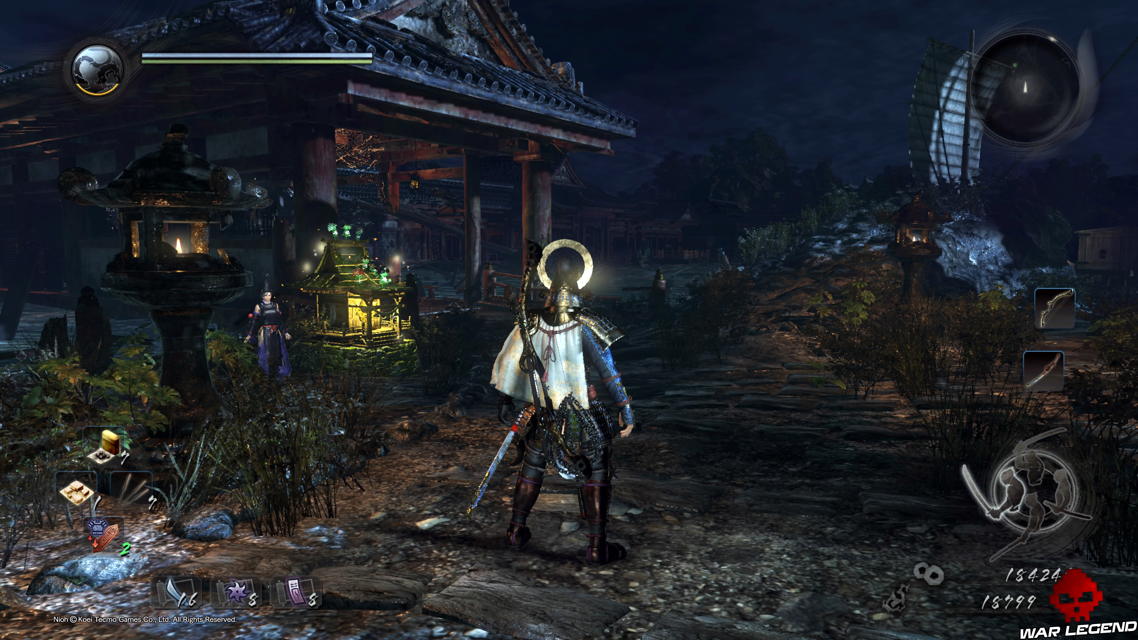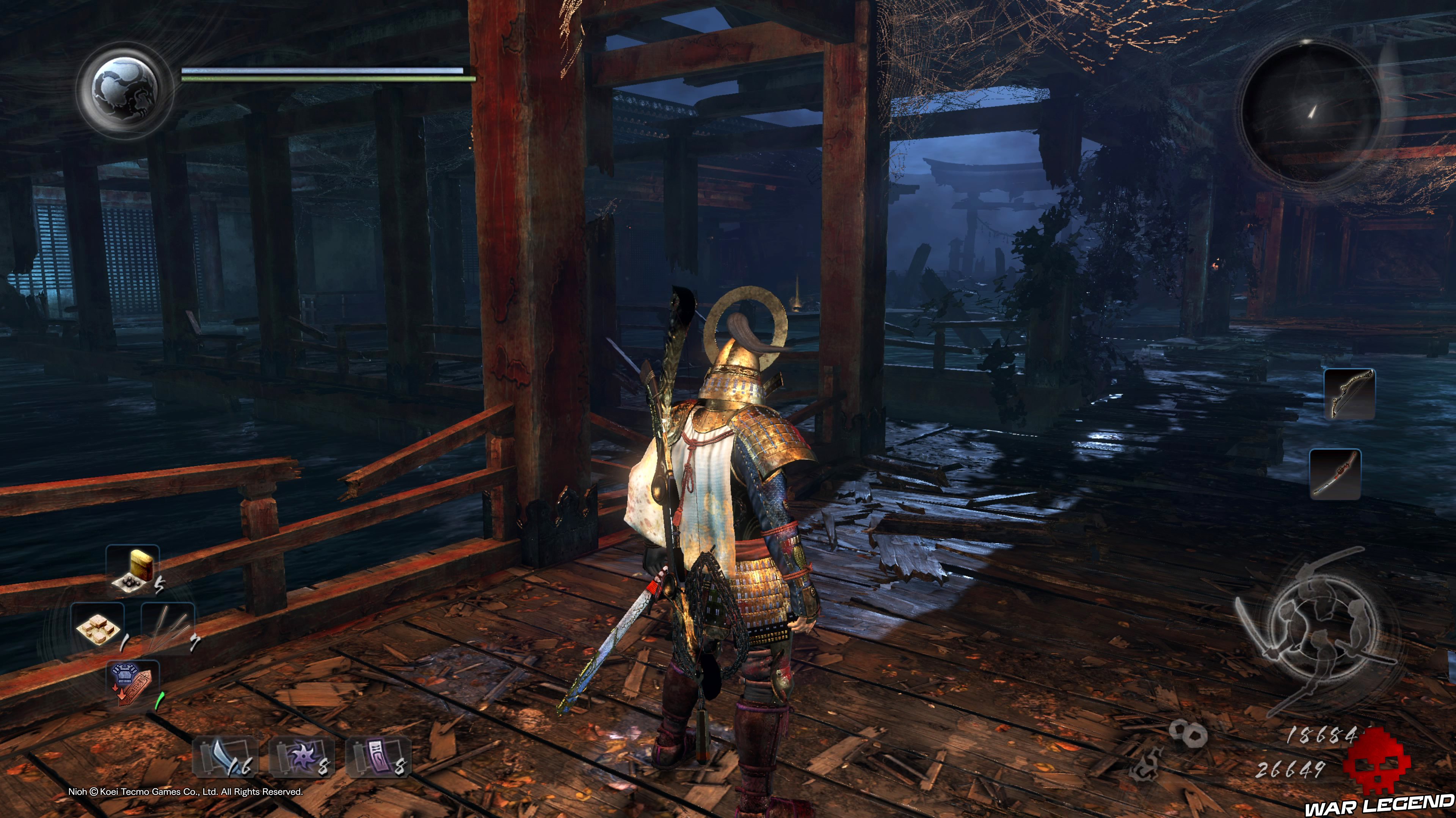 Prenez maintenant le seul chemin disponible pour récupérer un Suneate de Baroudeur, trois Sels et un Kote de chef de guerre. Prenez la porte pour revenir dans le temple situé derrière feu le Nurikabe. Retournez justement là où vous l’avez tué et allez tout droit pour monter des escaliers – juste avant, à droite des escaliers, deux blobs vous attaquent dont un derrière les caisses à droite. Ouvrez le coffre derrière les caisses en question pour prendre un Fusil Kunimoto. Revenez à présent à l’escalier. Dans un trou sur la gauche, derrière des débris, laissez-vous tomber pour aller récupérer un Kodama. Continuez ensuite en prenez la Pierre à aiguiser sur un cadavre.