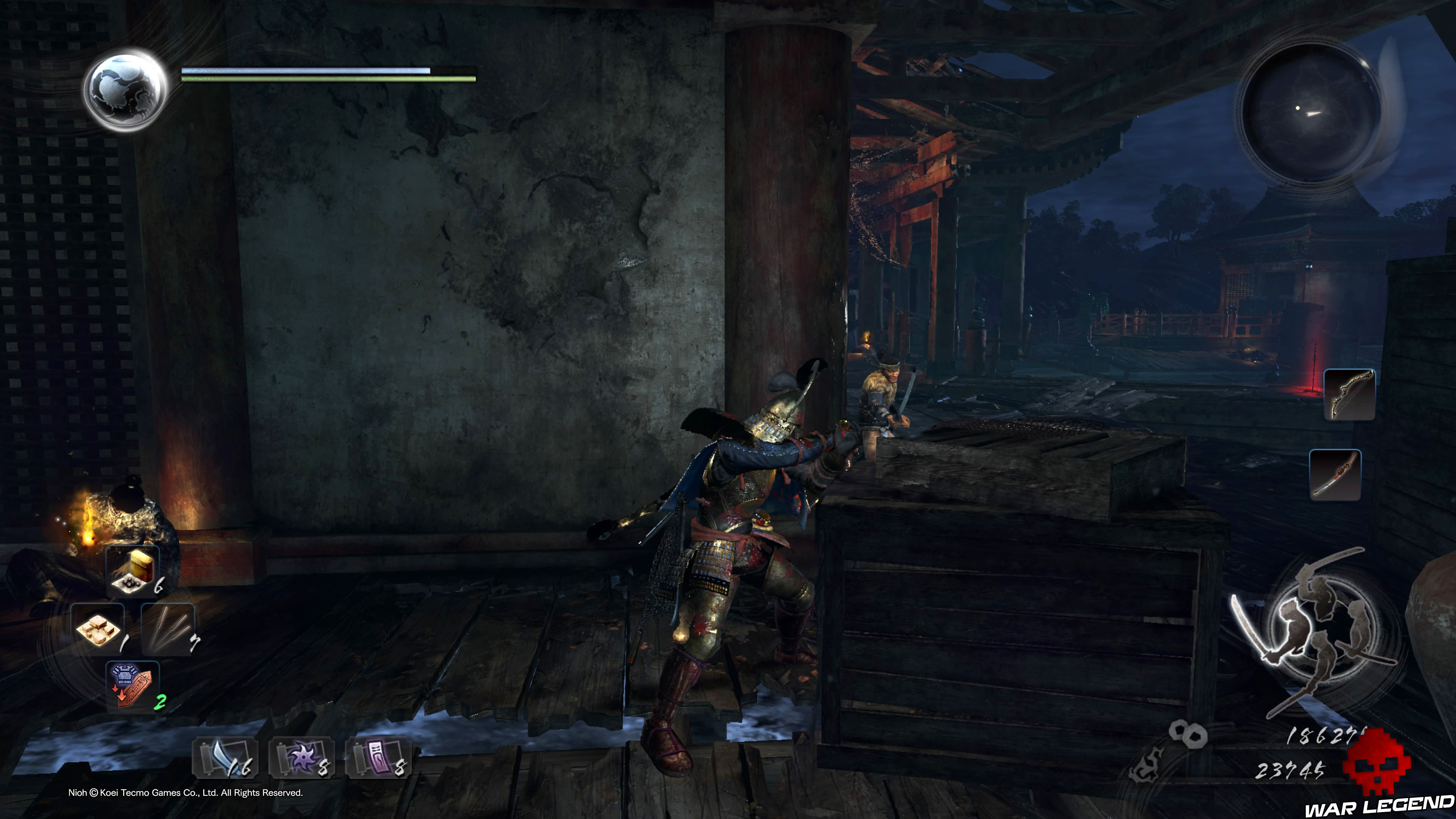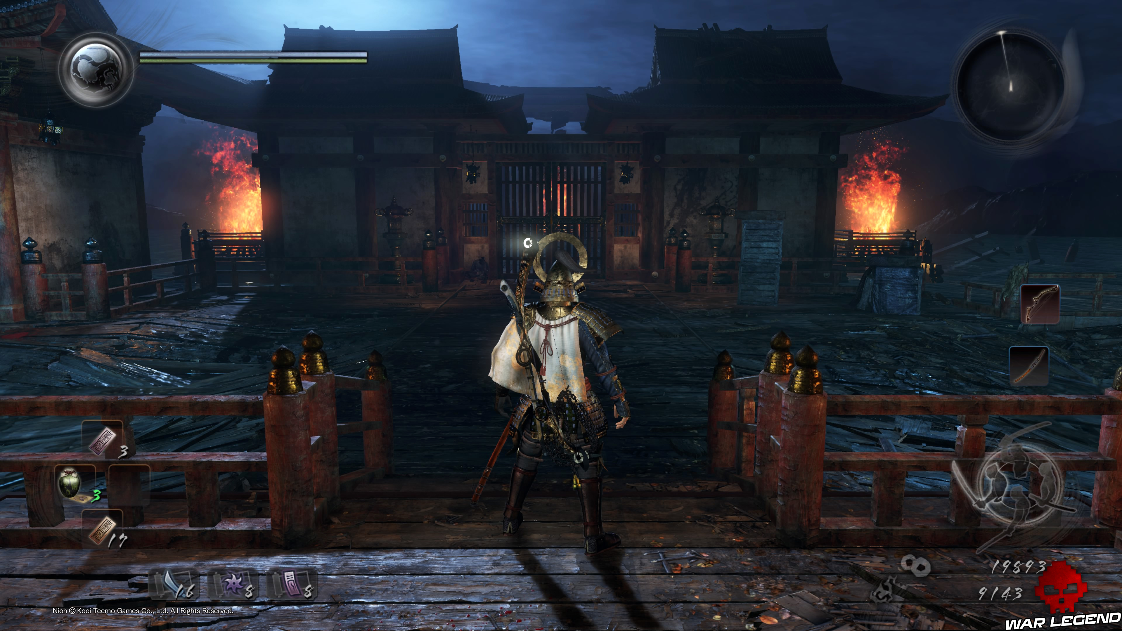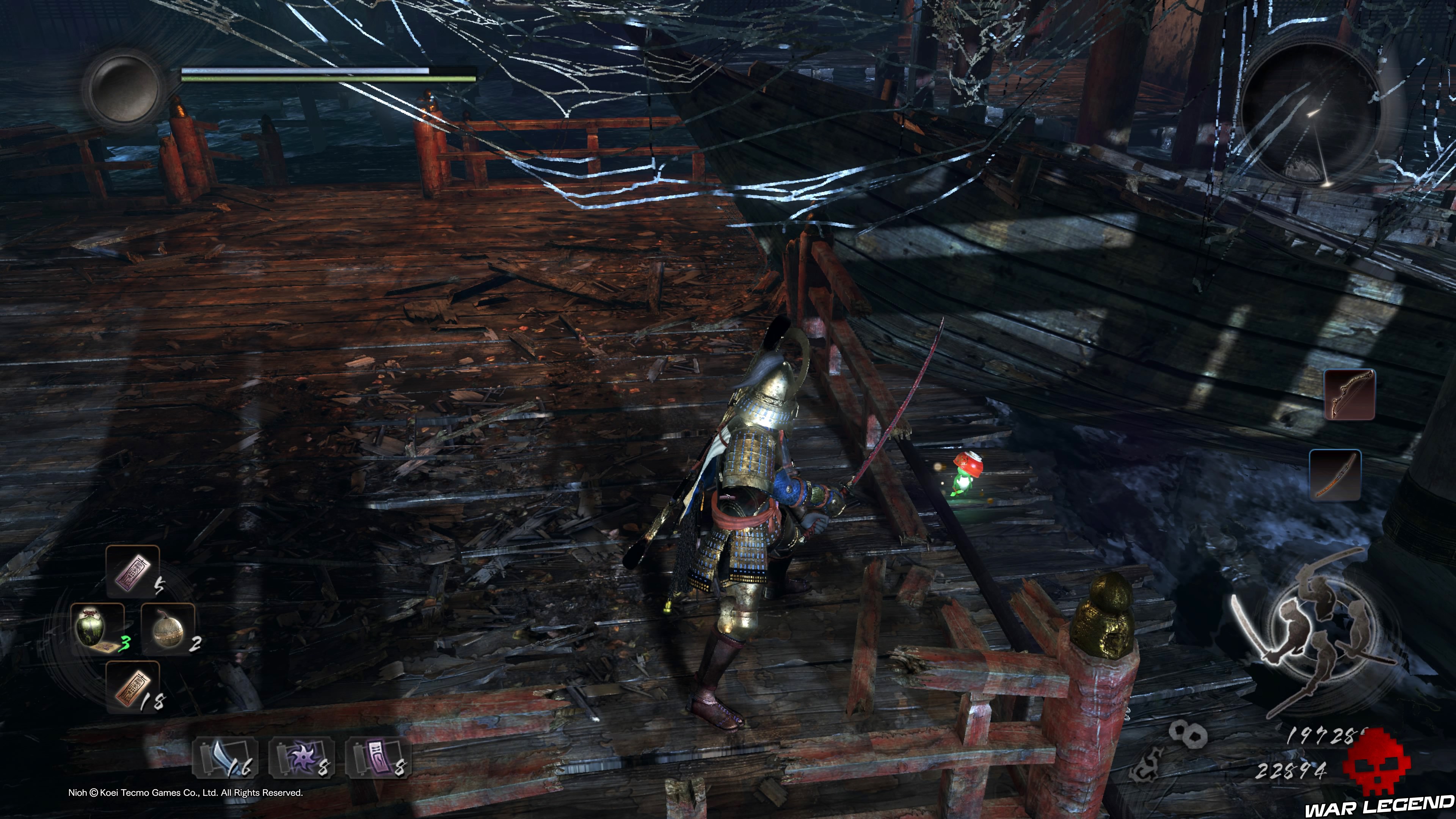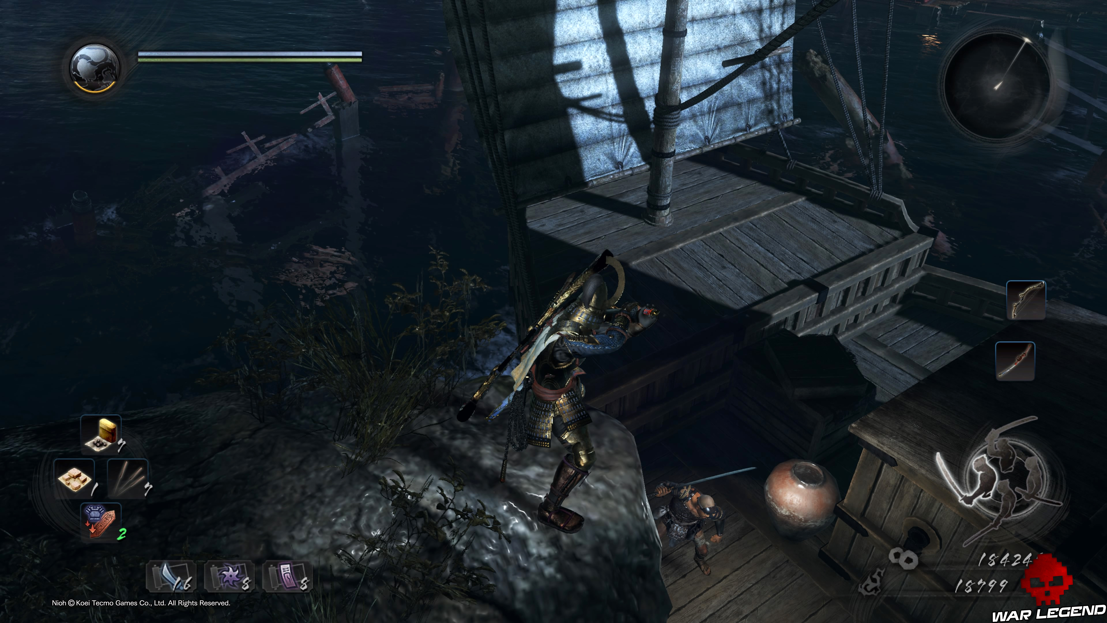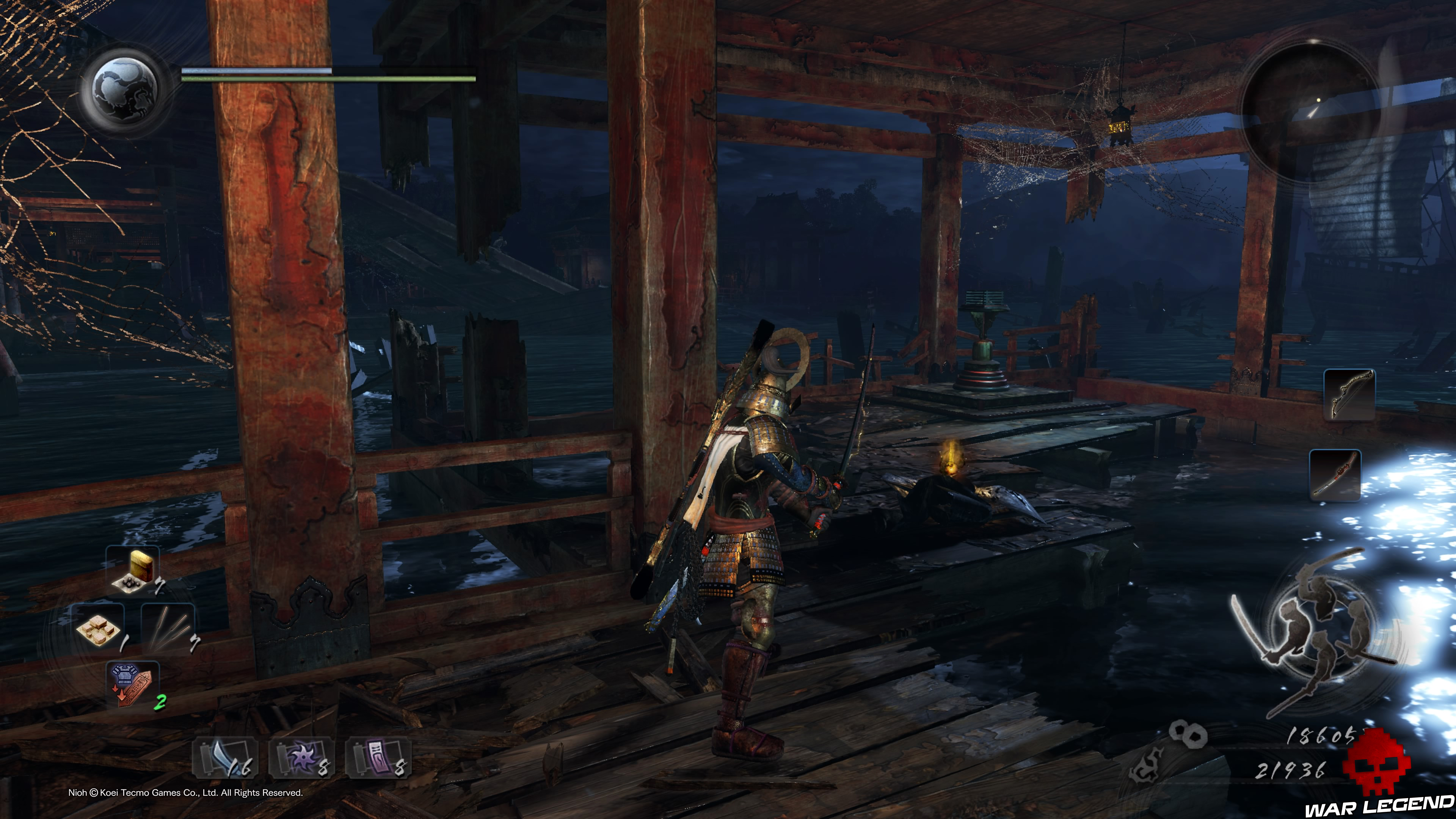 Tuez le Yokai qui apparaît juste après. Continuez, prenez le Kote d’unité embusquée sur le cadavre adossé près de la porte. Allez à droite et, avant de passer par la poutre pour accéder à un coffre, bousillez le blob qui surgit de l’eau. Prenez ensuite les Mèches de jeune ninja et l‘Amulette de feu dans le coffre. Retournez en arrière, entrez dans la petite dépendance en brisant les caisses, tuez le blob et prenez le Talisman de moment et le Pot d’eau Yokai dans le coffre. Sortez, prenez à droite, tuez le blob qui surgit droit devant quand vous allez prendre la Pierre à aiguiser au bout du bateau. Plus loin, un autre cadavre donne deux Sels. Retournez-vous et allez sur votre droite, derrière les caisses. Avancez jusqu’à trouver l’Amulette de voyage puis continuez pour vous laisser tomber sur une plateforme que vous avez visitée un peu plus tôt. Partez à gauche pour aller ouvrir le portail final qui mène au boss.