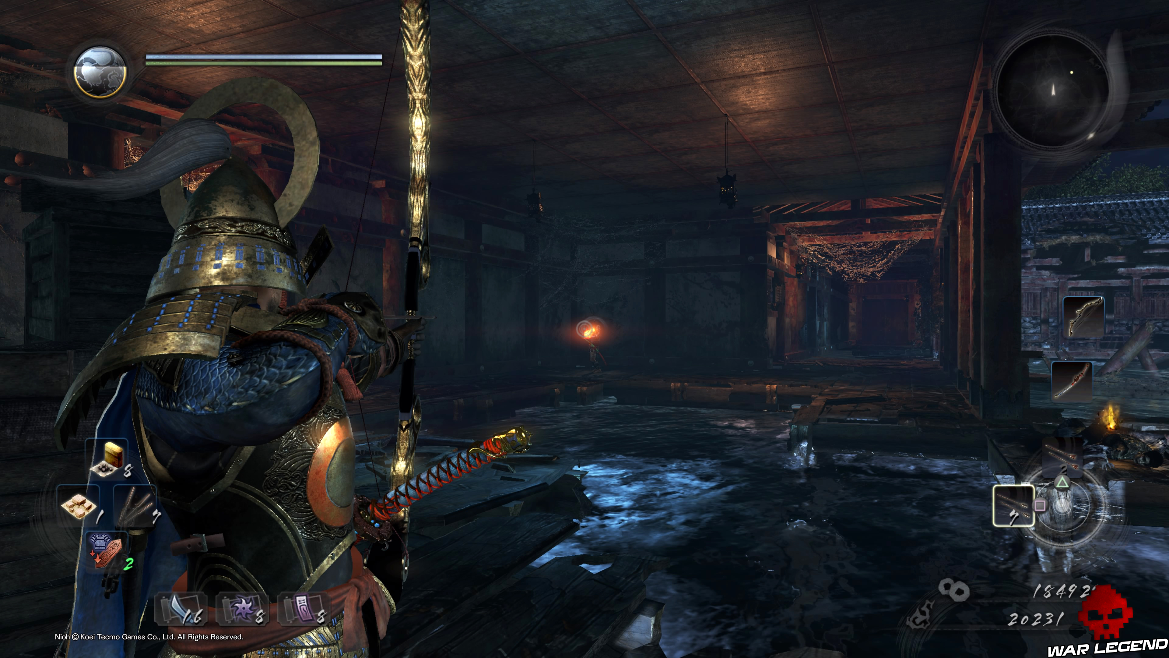 Tuez l’archer et prenez le Hizayoroi de garde ainsi que la Flèche dans le coffre. Sur le pont supérieur, zigouillez un deuxième archer et sautez par le trou à proximité pour éliminer un dernier pirate et récupérer une Eau sacrée. Poursuivez pour revenir à l’autel et continuez en direction du bâtiment. Derrière un vase, vous trouvez trois Flèches sur un cadavre. Quand vous arrivez dans la grande salle, tuez l’archer à l’autre bout.