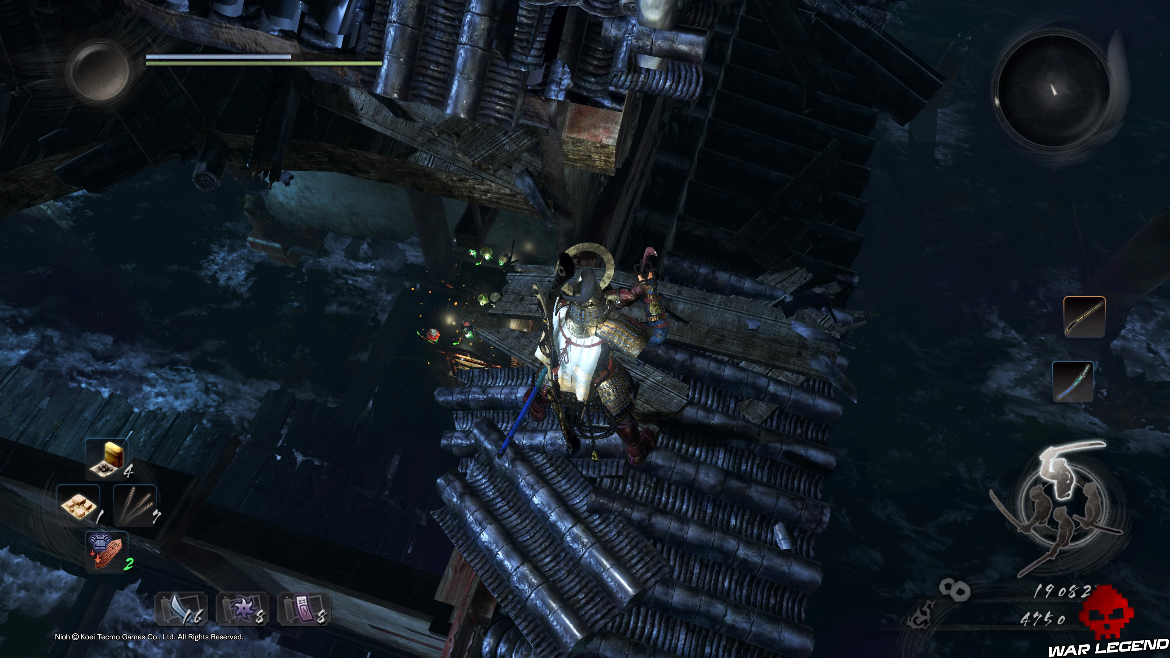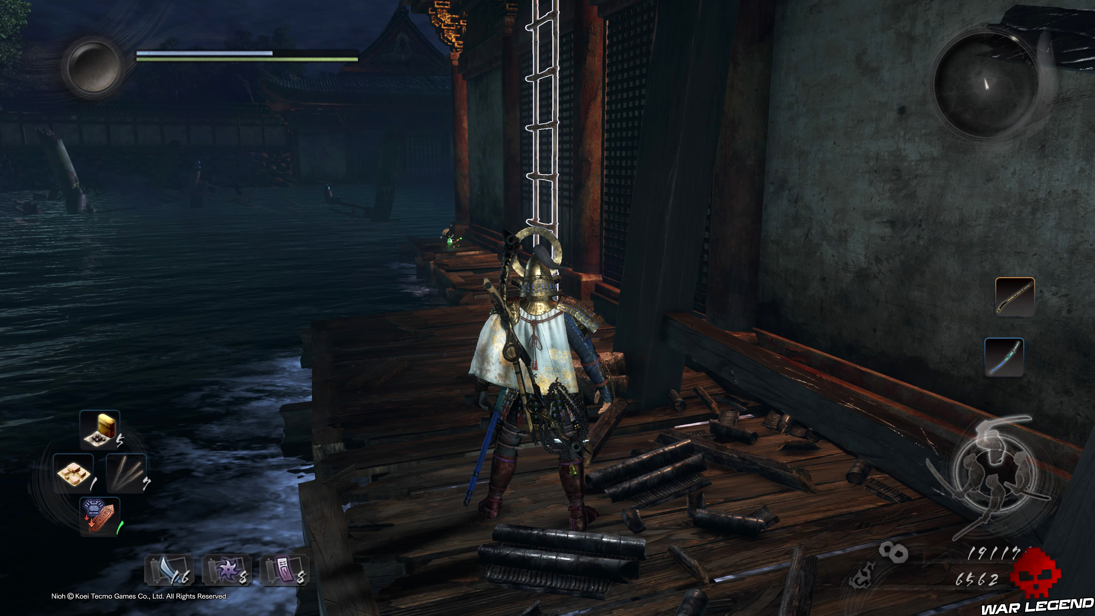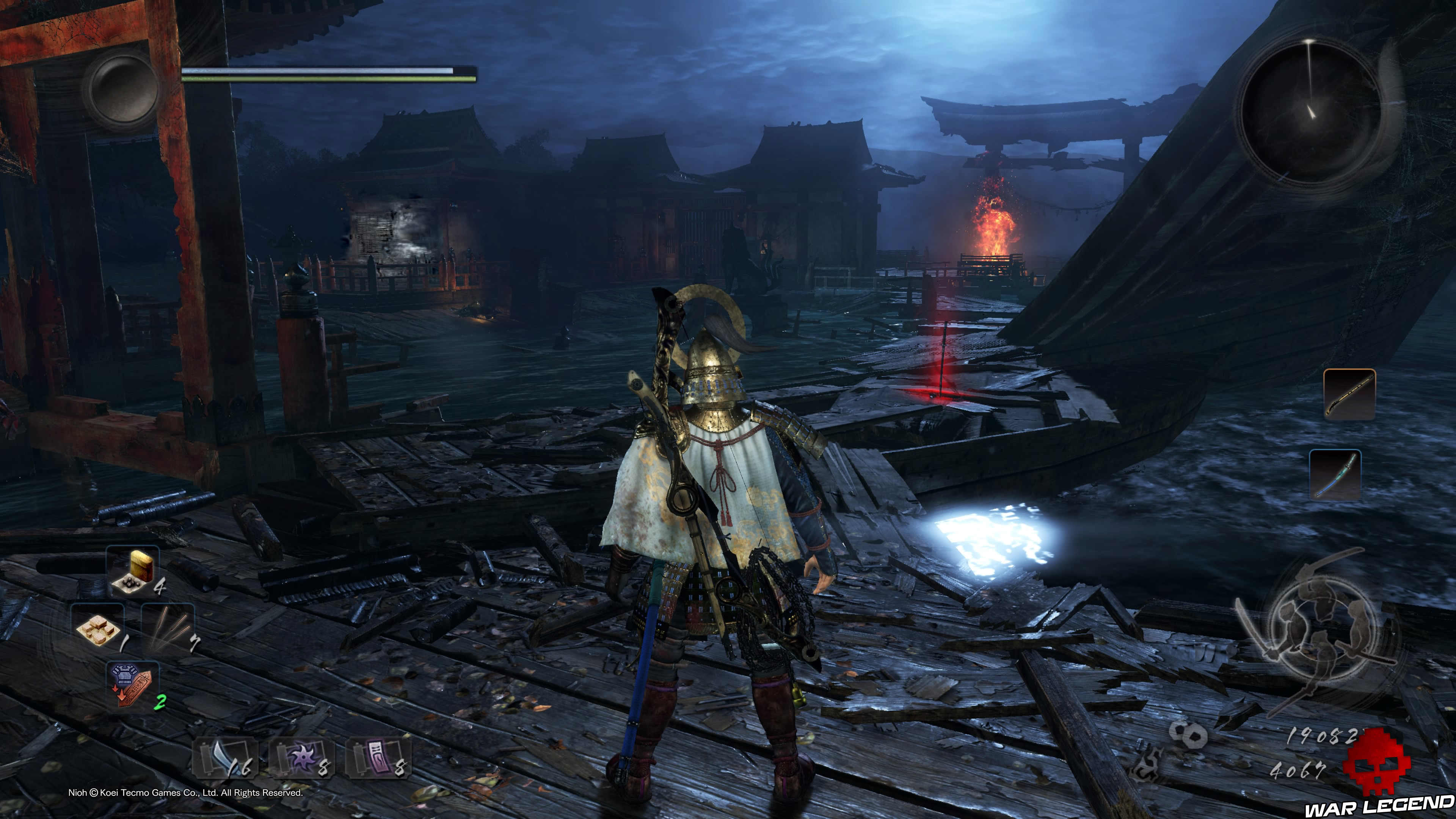 Continuez votre chemin pour aller ouvrir un coffre (Boîte de shinobi et Charme Omomari de l’eau) et tuer un Yokai. Sauvegardez à l’autel puis contournez ce qu’il reste du bâtiment par la gauche pour obtenir un Eau sacrée. Revenez à l’autel, contournez cette fois-ci par la droite et montez à l’échelle pour vous retrouver sur les toits. Descendez à l’échelle que vous trouvez pour tuer un Yokai et allumer un dernier fanal. Remontez l’échelle, continuez. Sur une poutre, vous trouvez une Arquebuse sur un cadavre. Éliminez le guerrier squelette, puis le second, plus gros, et sautez sur la plateforme à proximité. Fouillez le corps que vous trouvez pour prendre un Kayaku-dama et un Talisman balise puis récupérez le Kodama à gauche de la pente en bois. Montez ensuite cette pente. Allez tout à gauche pour prendre un Kuniyuki Taima puis retournez-vous. Dirigez-vous vers le Yokai pour l’occire puis prenez le Charme Omamori de foudre et le Hakama de Suikan de mage Onmyo. Revenez sur vos pas, jusque sur la coque de bateau où vous étiez un instant plus tôt. Regardez en contrebas sur la droite pour trouver un blob. Tuez-le et récupérez la Kodama à proximité.