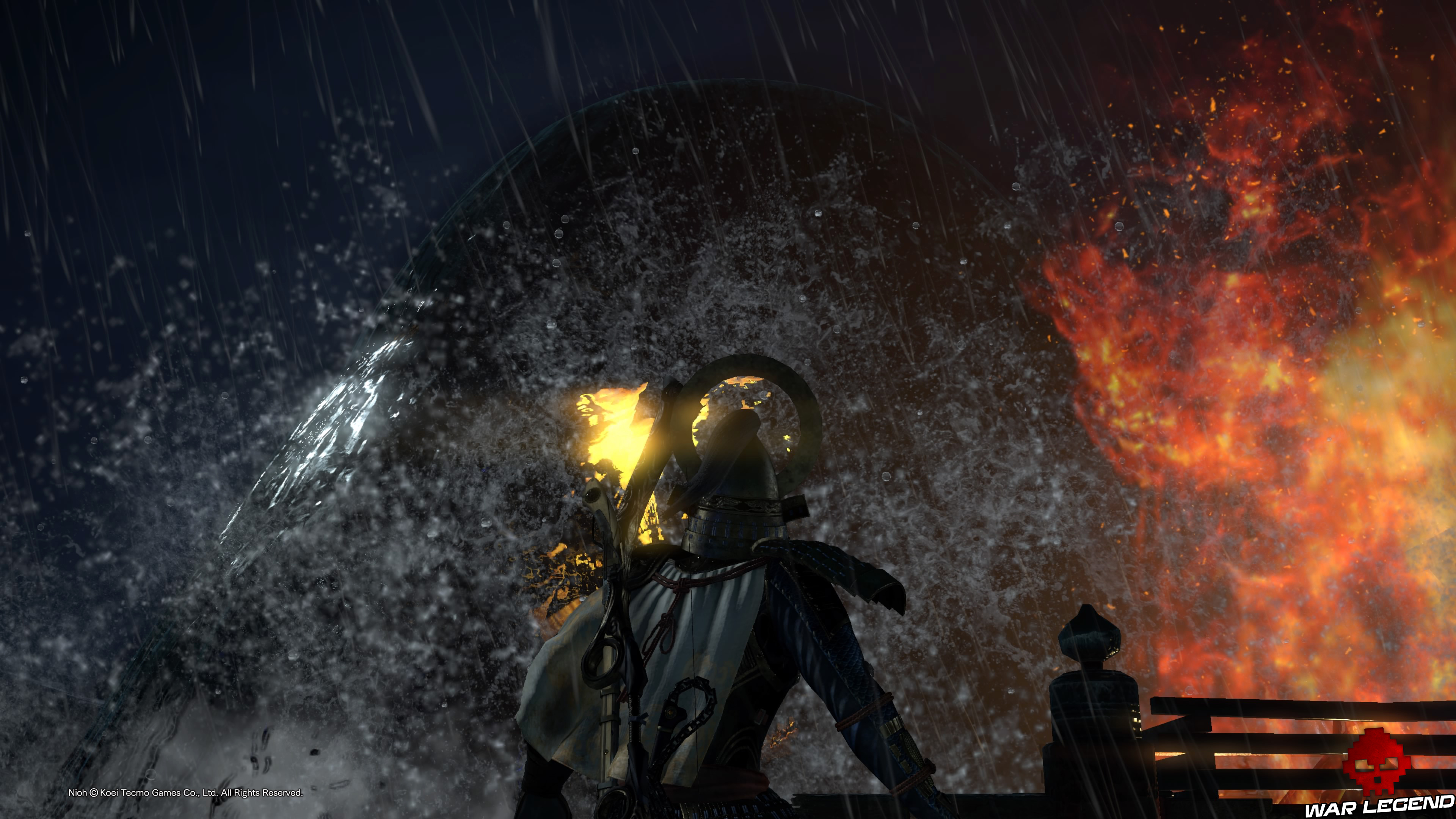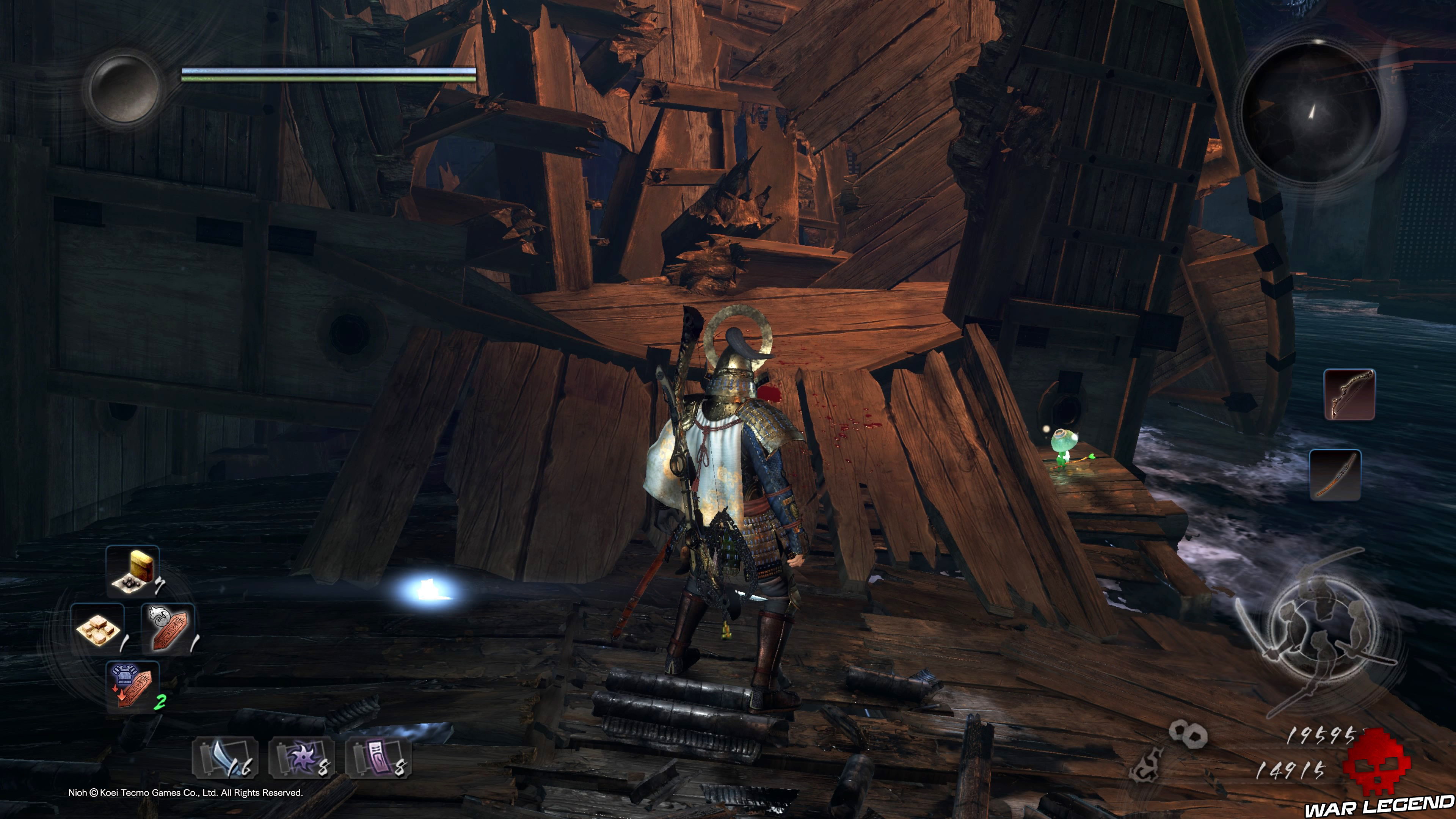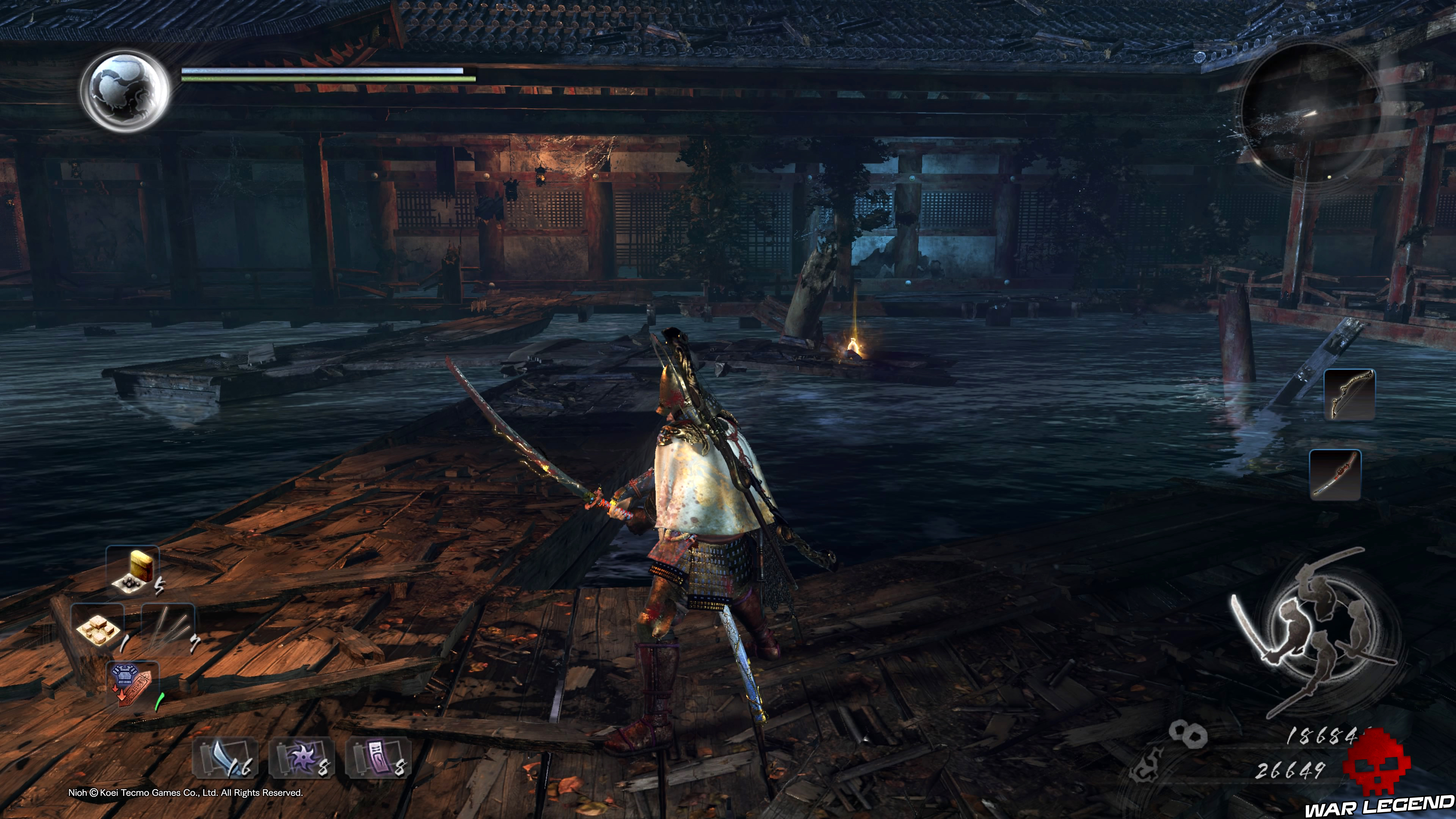 Continuez votre chemin pour aller ouvrir un coffre (Boîte de shinobi et Charme Omomari de l’eau) et tuer un Yokai. Sauvegardez à l’autel puis contournez ce qu’il reste du bâtiment par la gauche pour obtenir un Eau sacrée. Revenez à l’autel, contournez cette fois-ci par la droite et montez à l’échelle pour vous retrouver sur les toits. Descendez à l’échelle que vous trouvez pour tuer un Yokai et allumer un dernier fanal. Remontez l’échelle, continuez. Sur une poutre, vous trouvez une Arquebuse sur un cadavre. Éliminez le guerrier squelette, puis le second, plus gros, et sautez sur la plateforme à proximité. Fouillez le corps que vous trouvez pour prendre un Kayaku-dama et un Talisman balise puis récupérez le Kodama à gauche de la pente en bois. Montez ensuite cette pente. Allez tout à gauche pour prendre un Kuniyuki Taima puis retournez-vous. Dirigez-vous vers le Yokai pour l’occire puis prenez le Charme Omamori de foudre et le Hakama de Suikan de mage Onmyo. Revenez sur vos pas, jusque sur la coque de bateau où vous étiez un instant plus tôt. Regardez en contrebas sur la droite pour trouver un blob. Tuez-le et récupérez la Kodama à proximité.