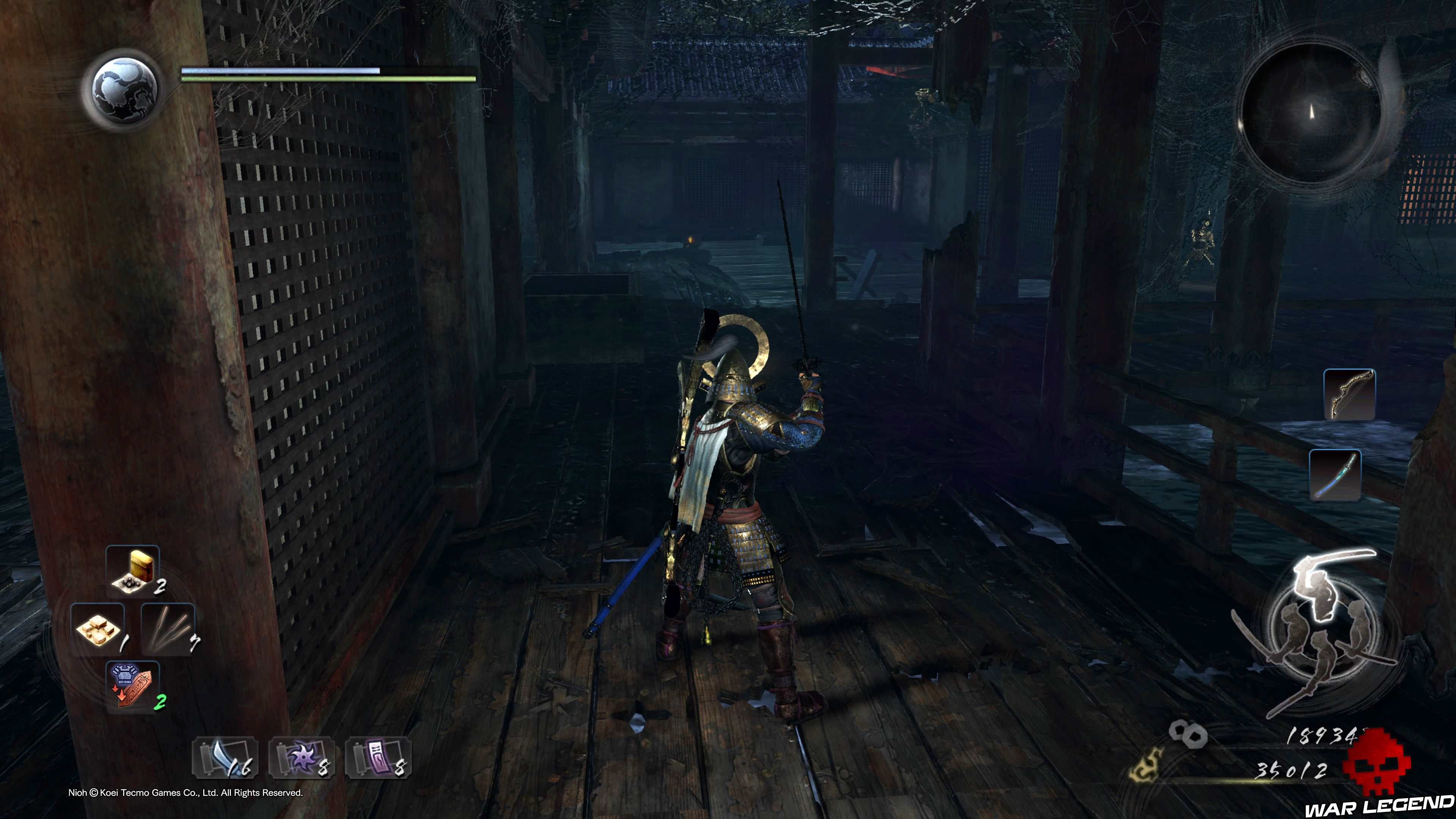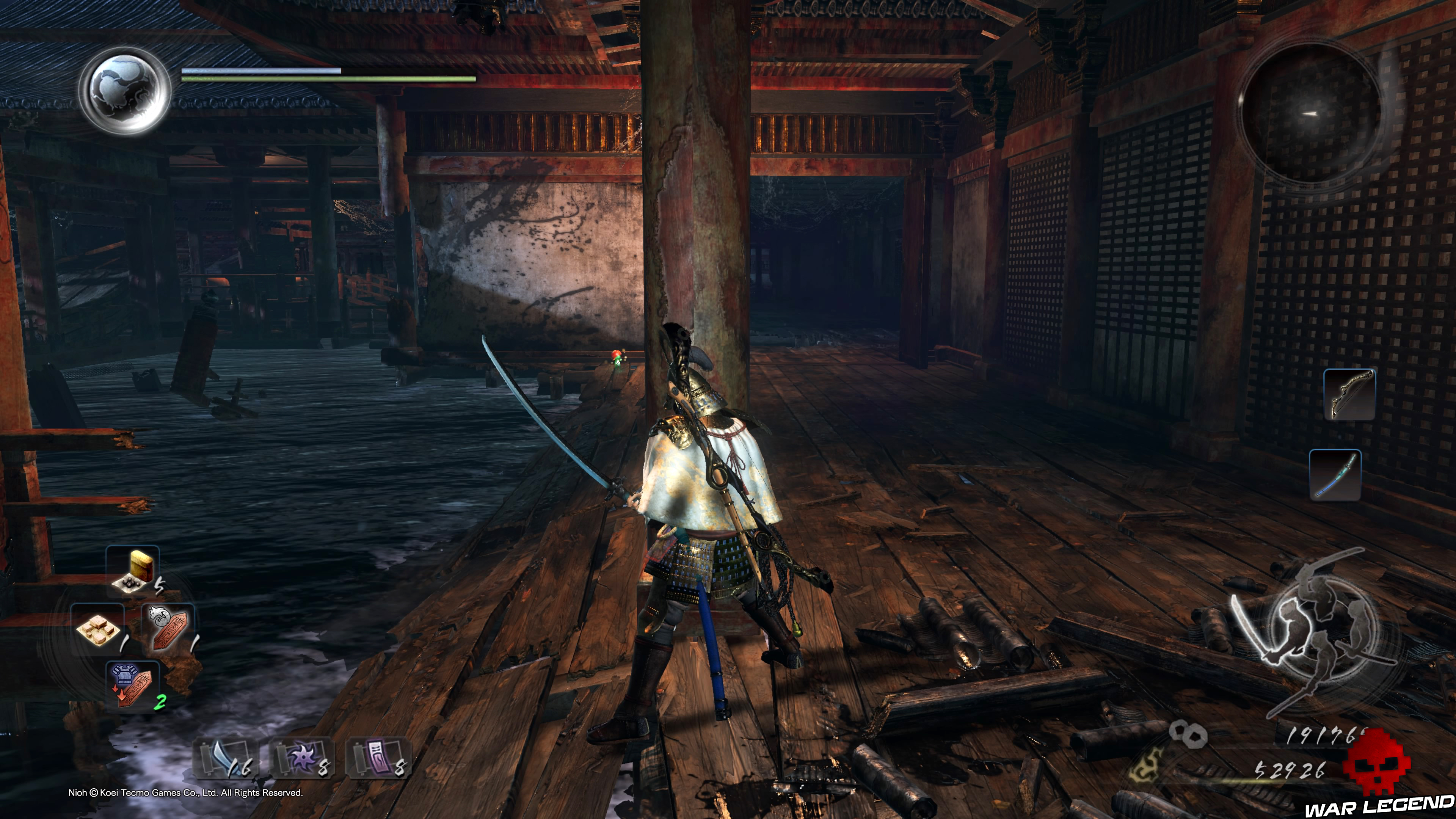 Montez à présent à l’étage et suivez le chemin en tuant les guerriers squelettes et en évitant les trous. Prenez le Hakama des Habits Yamabushi puis passez par le petit passage qui fend la toiture en deux. Prenez alors à gauche et allez à la rencontre d’un Yokai, que vous tuez pour descendre à l’échelle à proximité et trouver un Kodama.