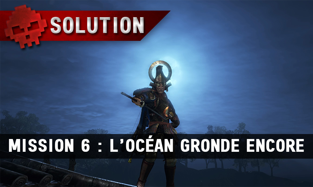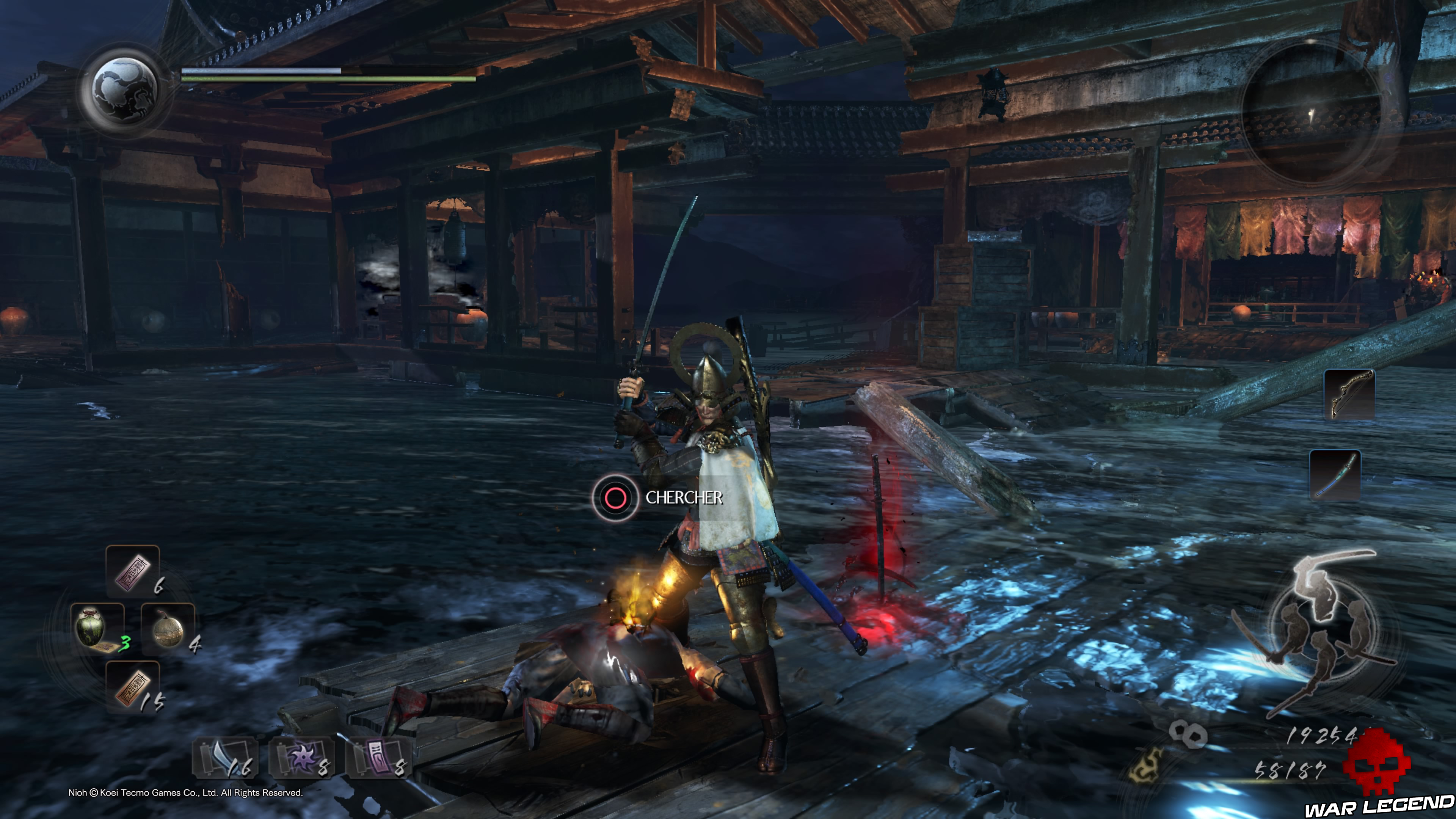 Avancez ensuite jusqu’au corps que vous apercevez mais faites gaffe à l’archer sur la gauche, par-delà l’eau. Prenez le Masque de Hyottoko sur le corps et poursuivez sur la droite, en terrain dégagé, pour tuer un garde en armure et son compère à la lance.