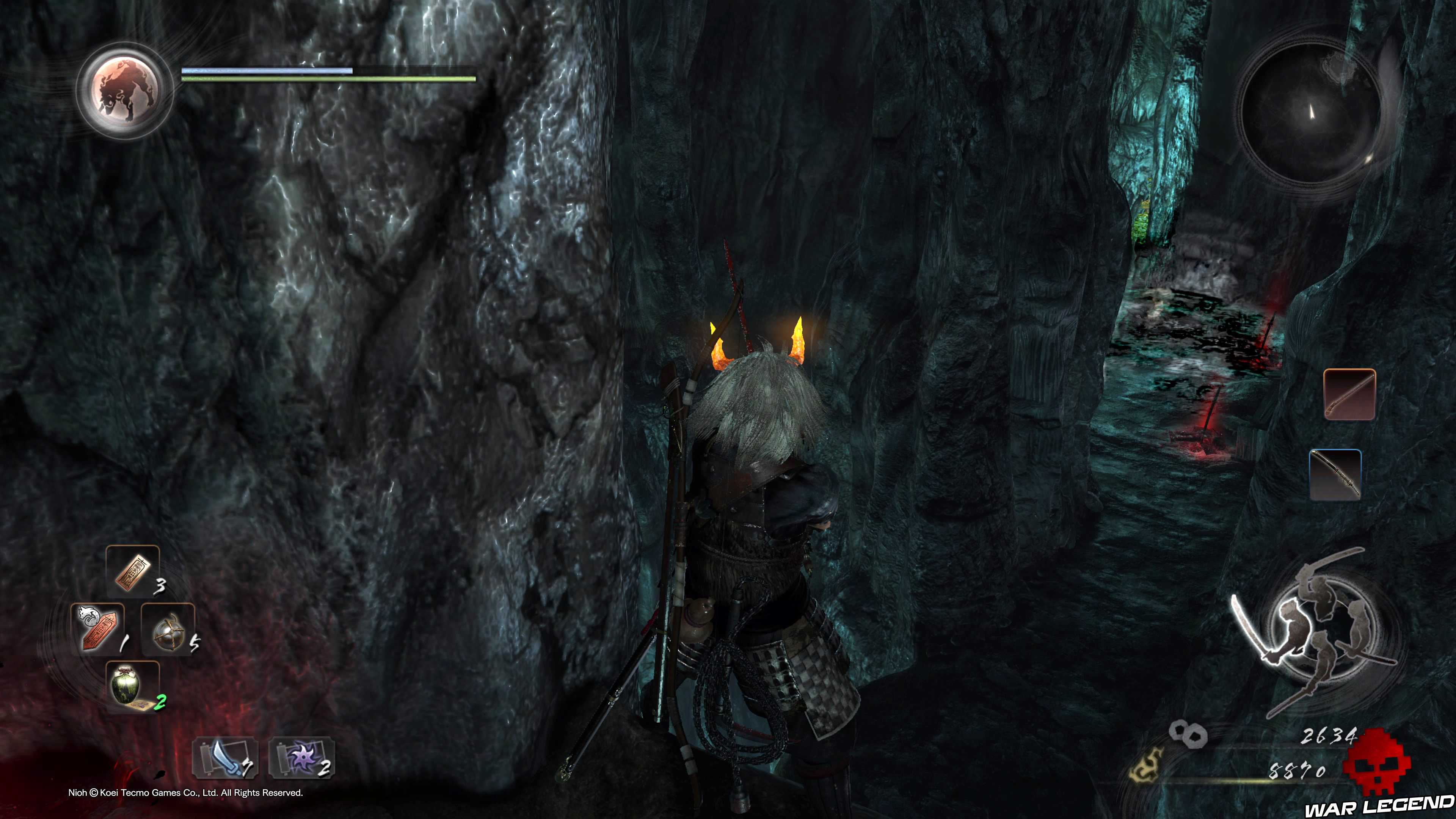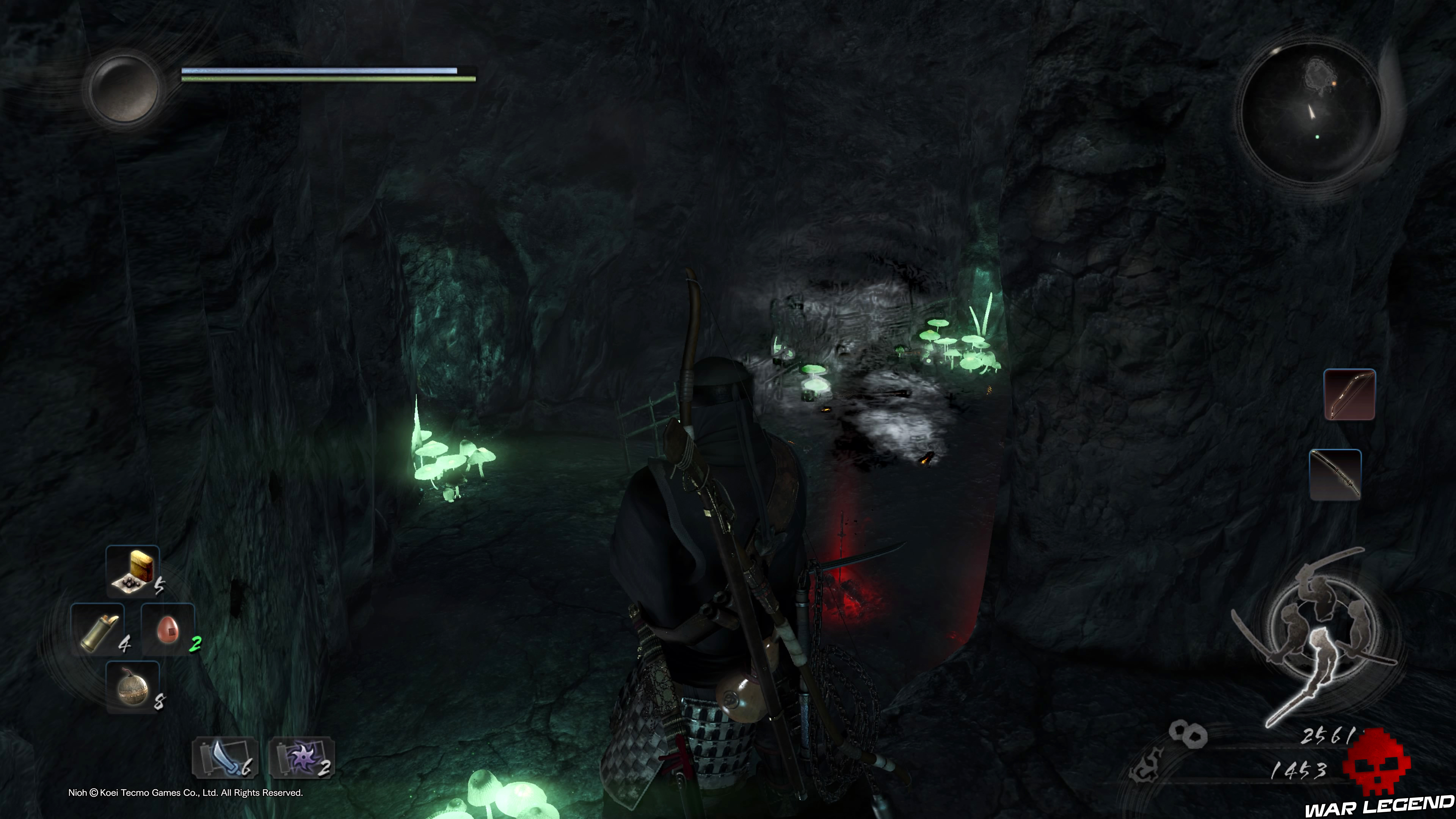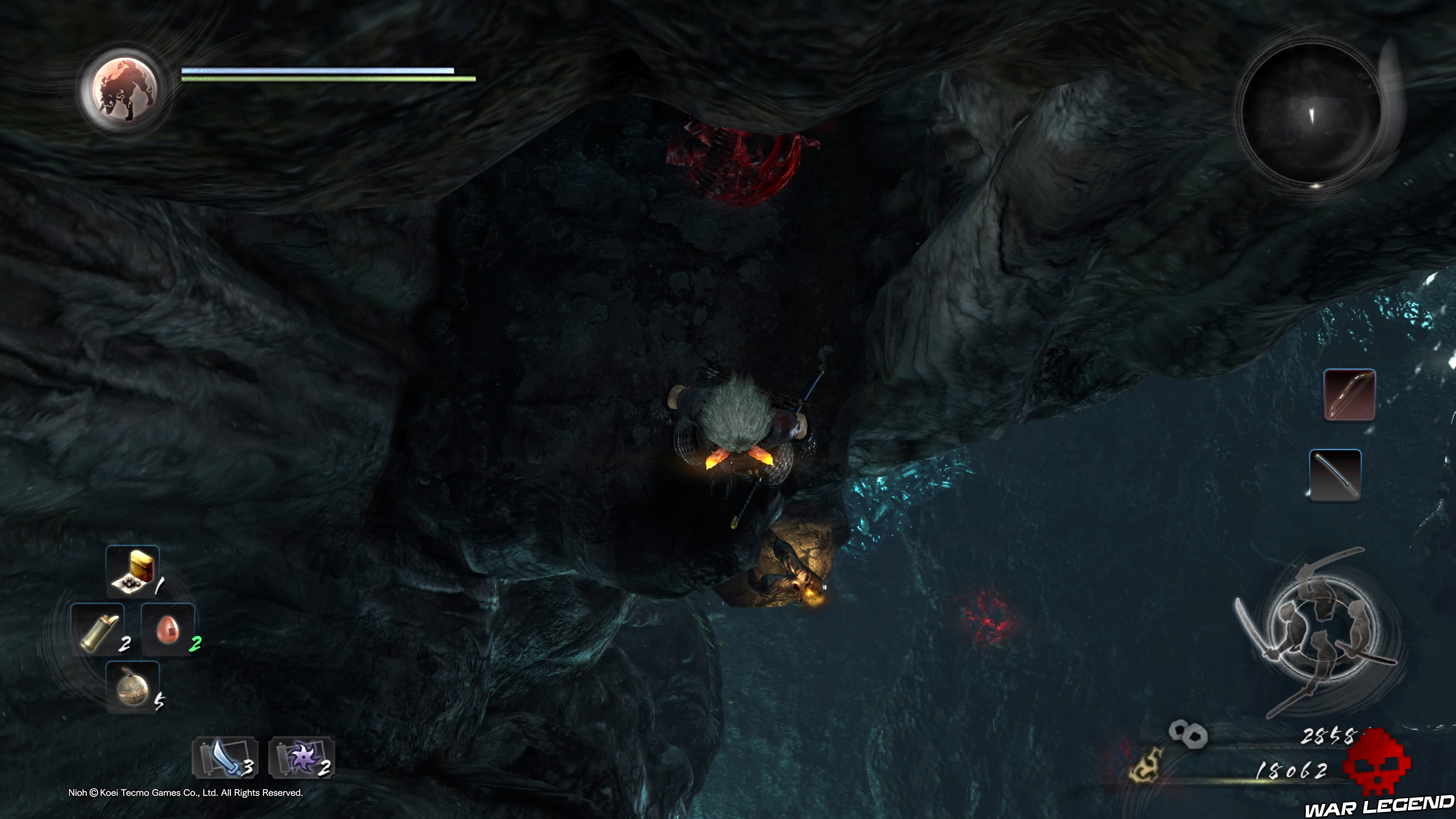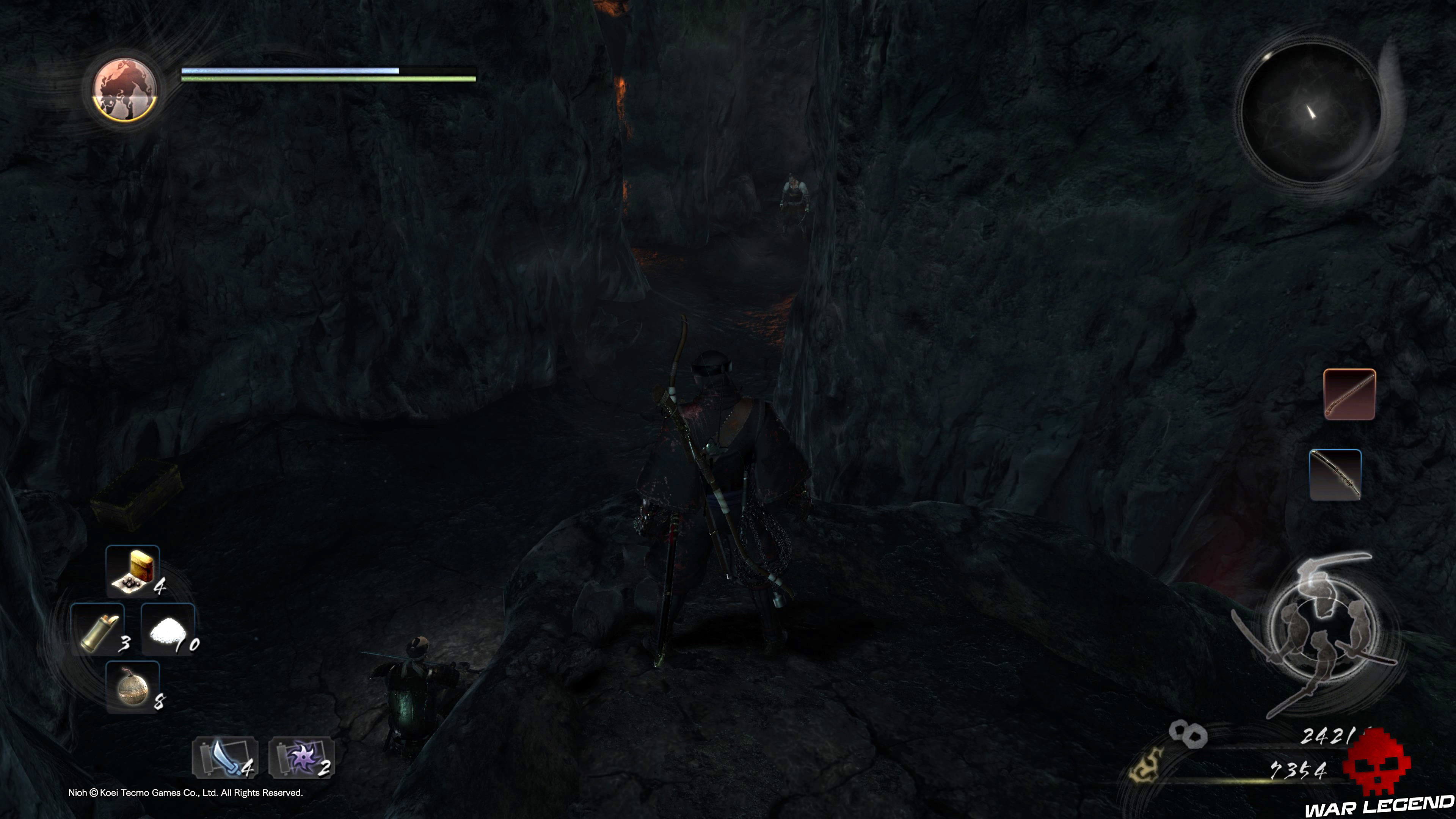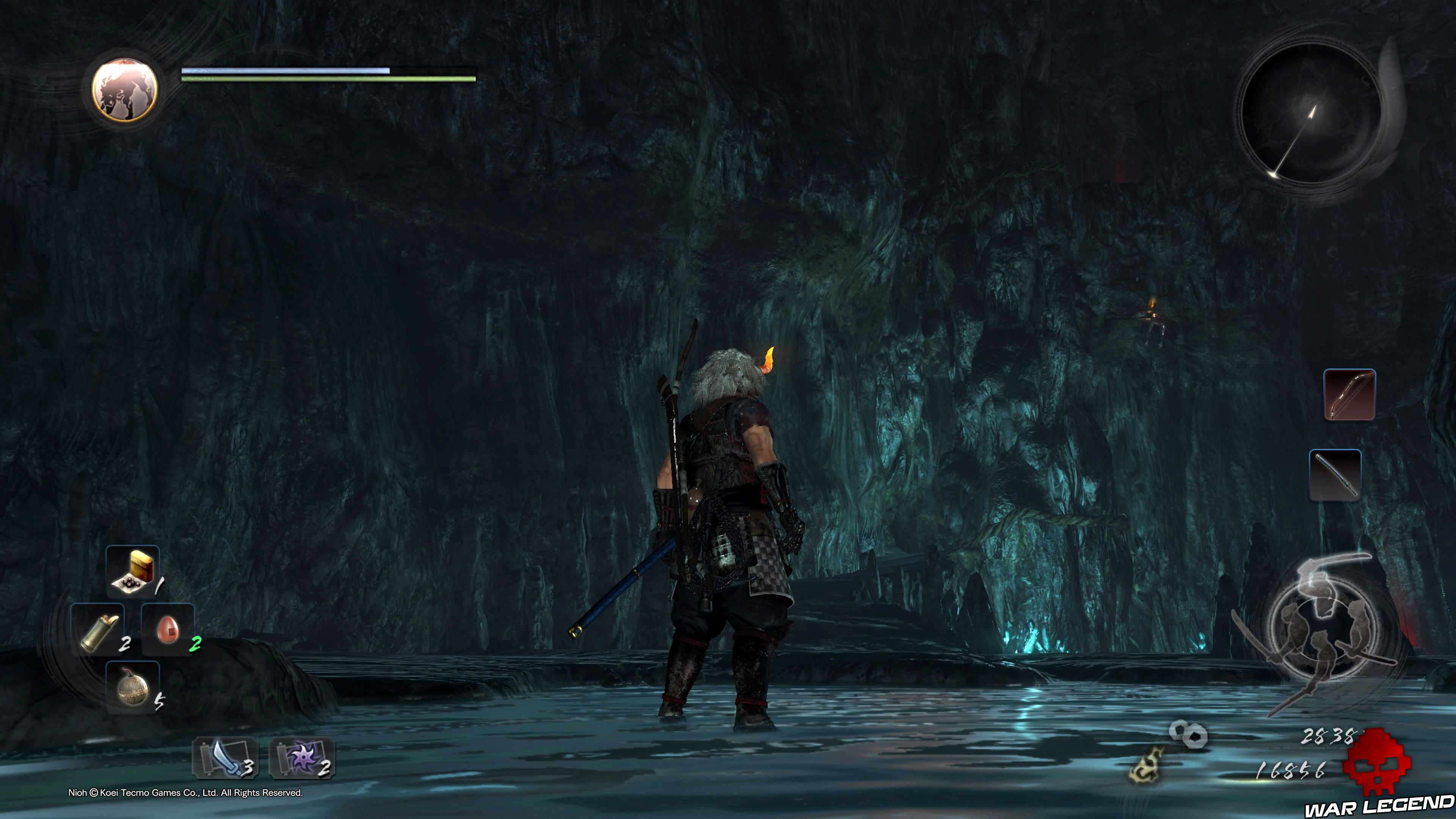 Descendez dans le tunnel. Dans la grotte qui surgit, un ennemi arrive en face et l’autre par la droite. Tuez -les puis visitez l’alcôve sur la droite pour trouver un coffre contenant deux Pots d’eau Yokai et trois Flèches. Continuez à descendre pour arriver à l’air libre. Attention, un ennemi va tenter de vous surprendre par la gauche. Montrez-lui de quel bois vous vous chauffez (note, n’hésitez pas à faire usage du décor, Nioh vous permet de précipiter vos adversaires dans le vide).