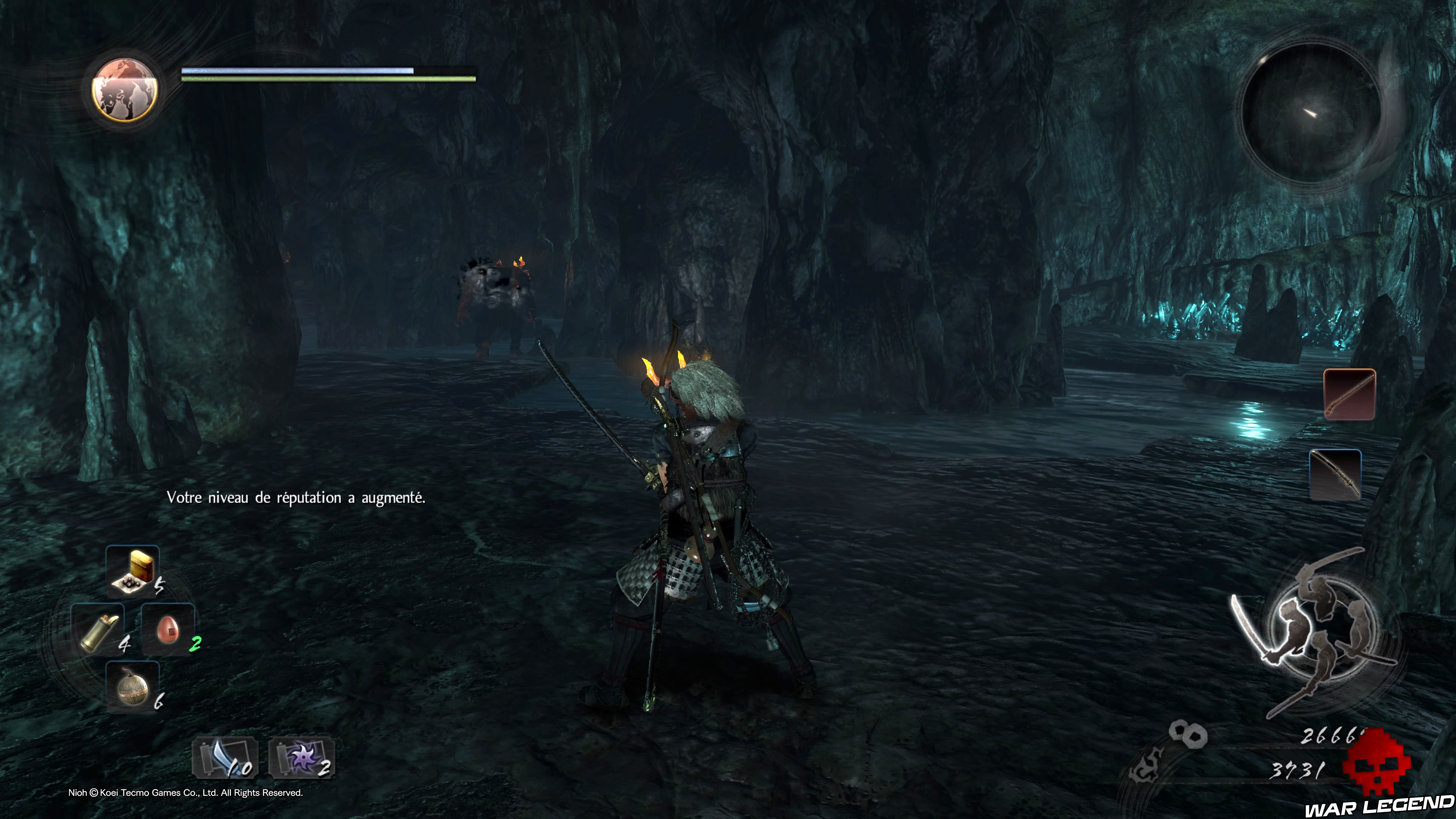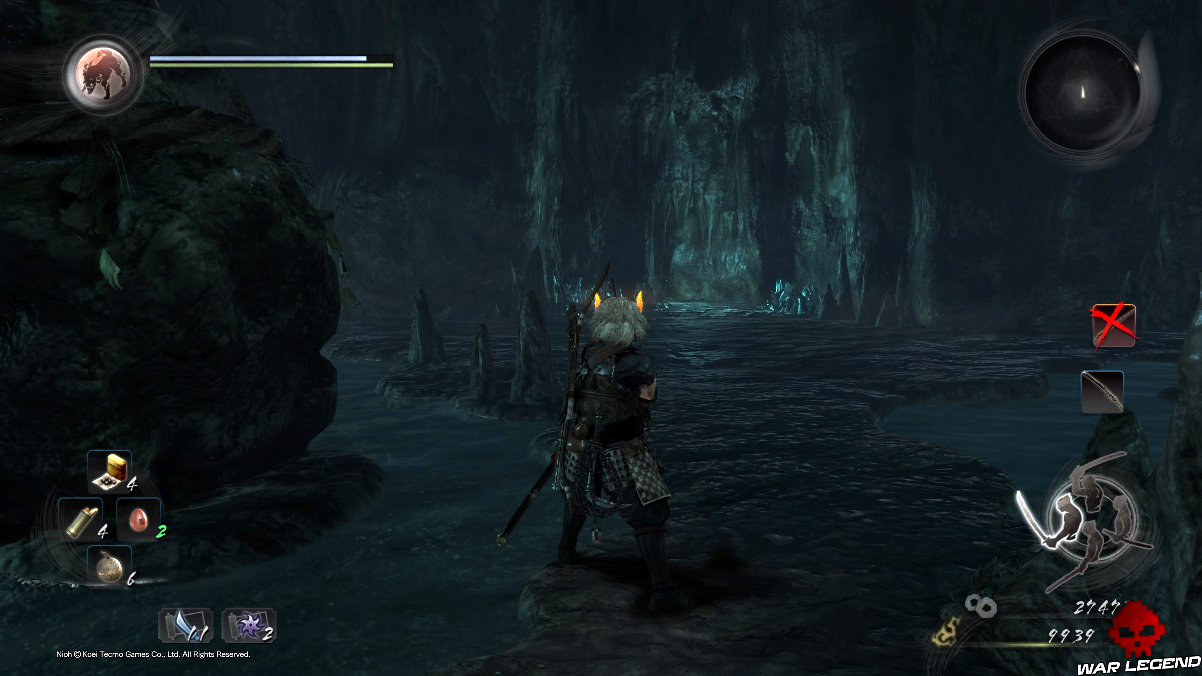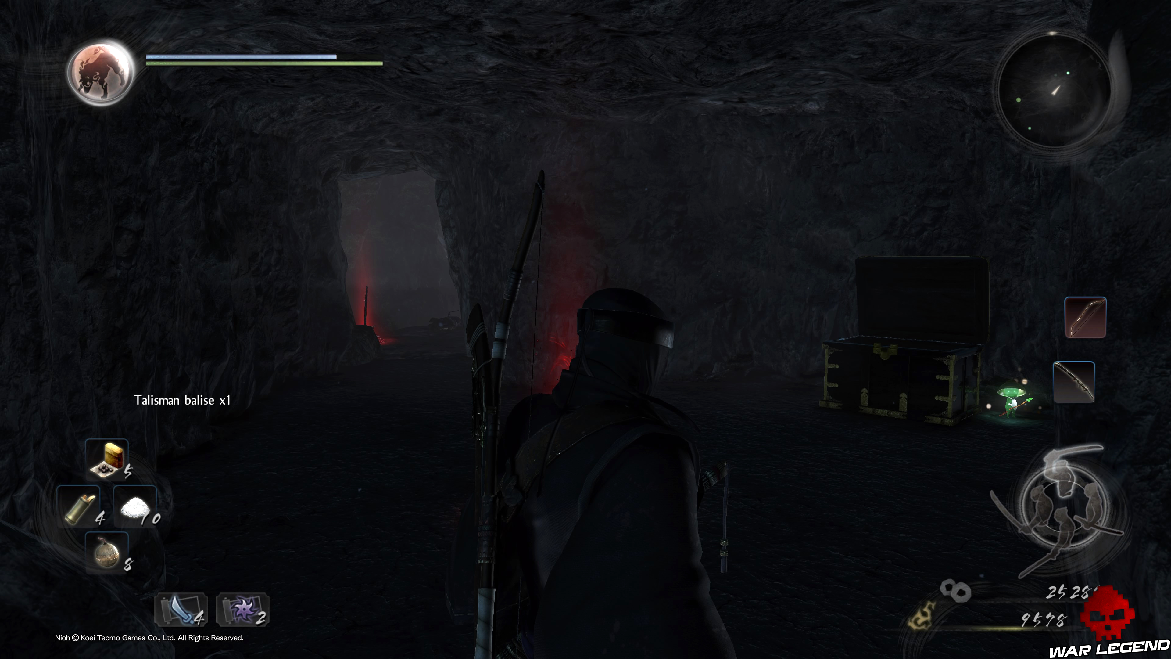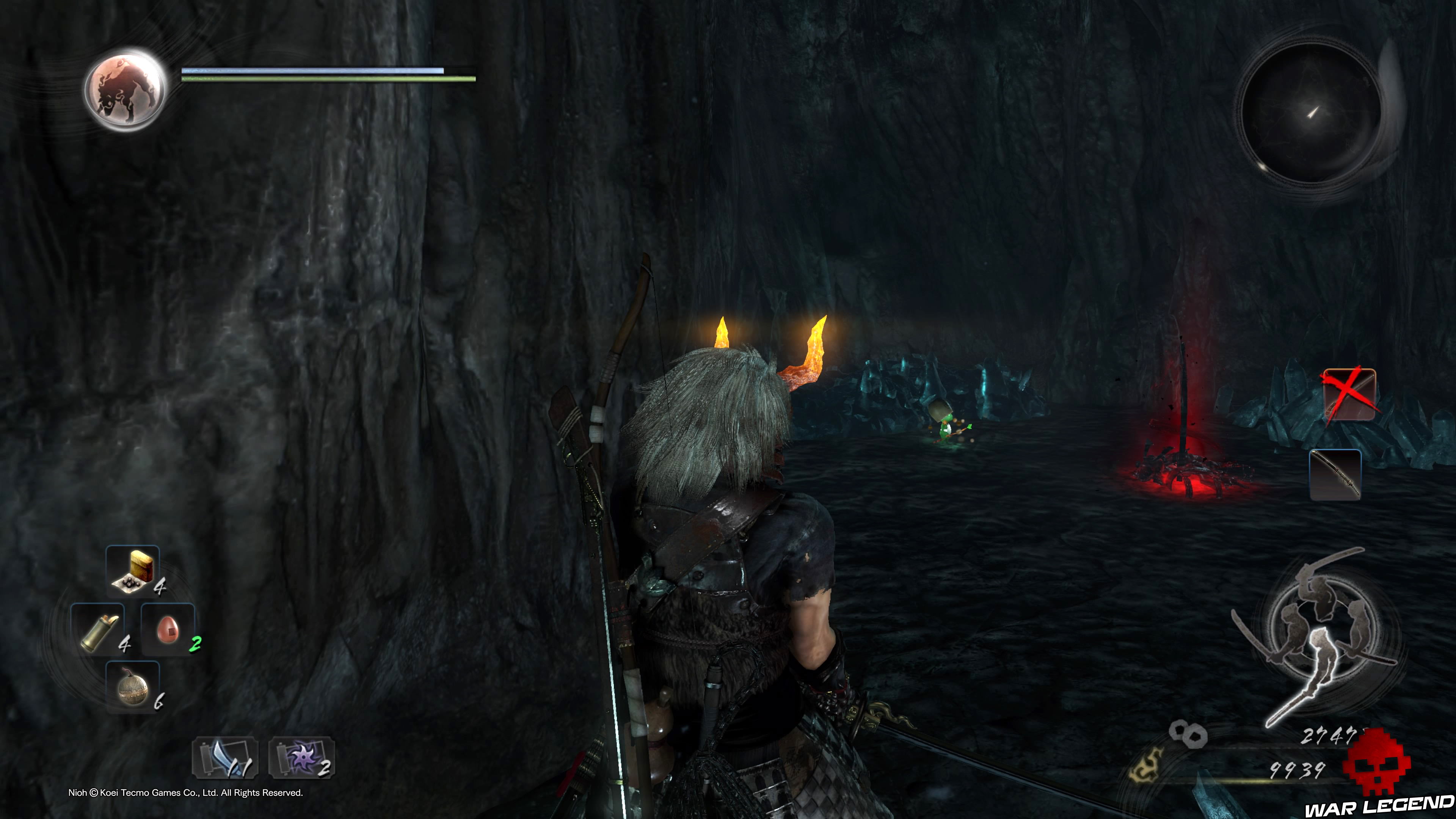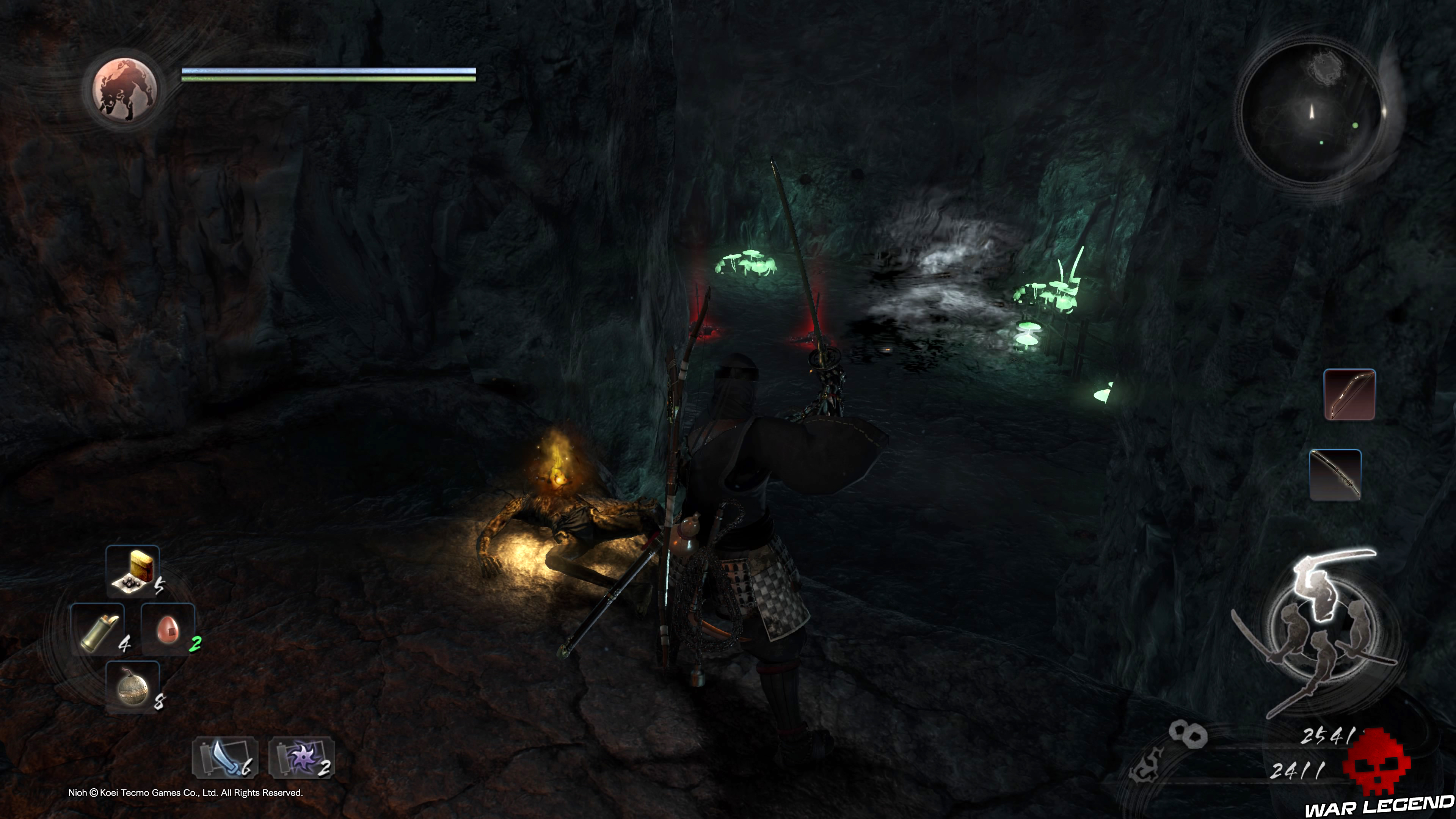 Descendez dans le tunnel. Dans la grotte qui surgit, un ennemi arrive en face et l’autre par la droite. Tuez -les puis visitez l’alcôve sur la droite pour trouver un coffre contenant deux Pots d’eau Yokai et trois Flèches. Continuez à descendre pour arriver à l’air libre. Attention, un ennemi va tenter de vous surprendre par la gauche. Montrez-lui de quel bois vous vous chauffez (note, n’hésitez pas à faire usage du décor, Nioh vous permet de précipiter vos adversaires dans le vide).