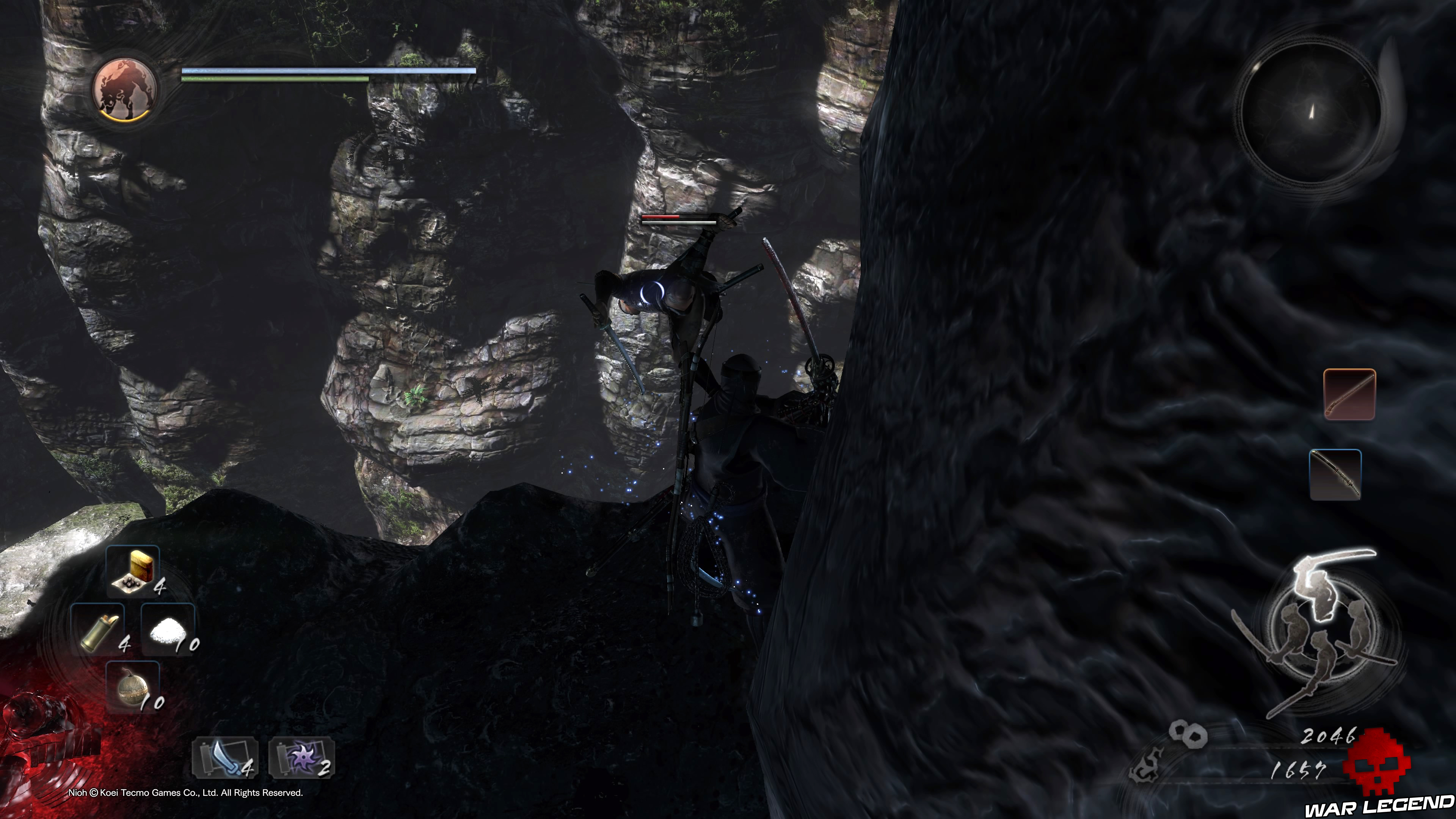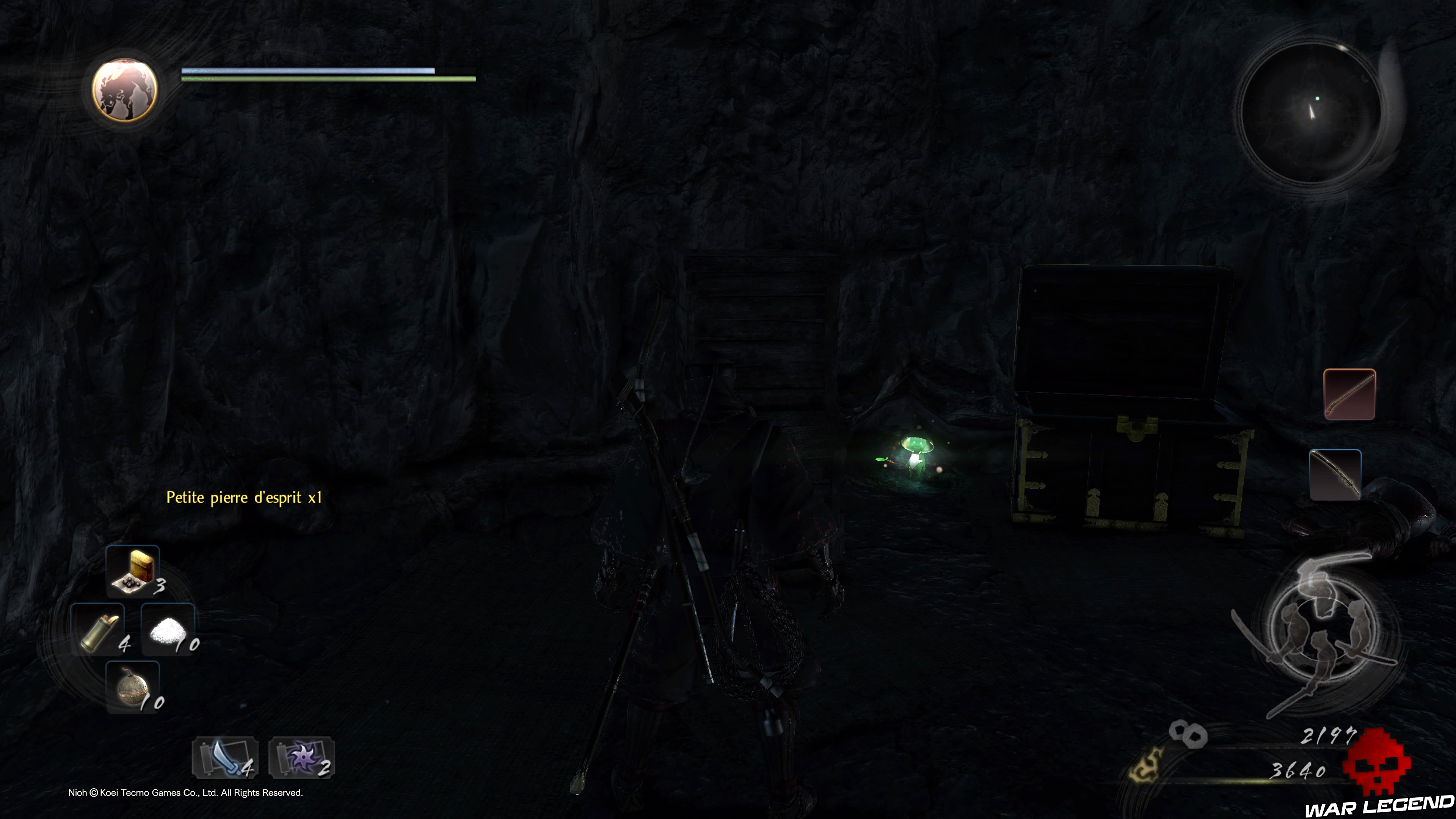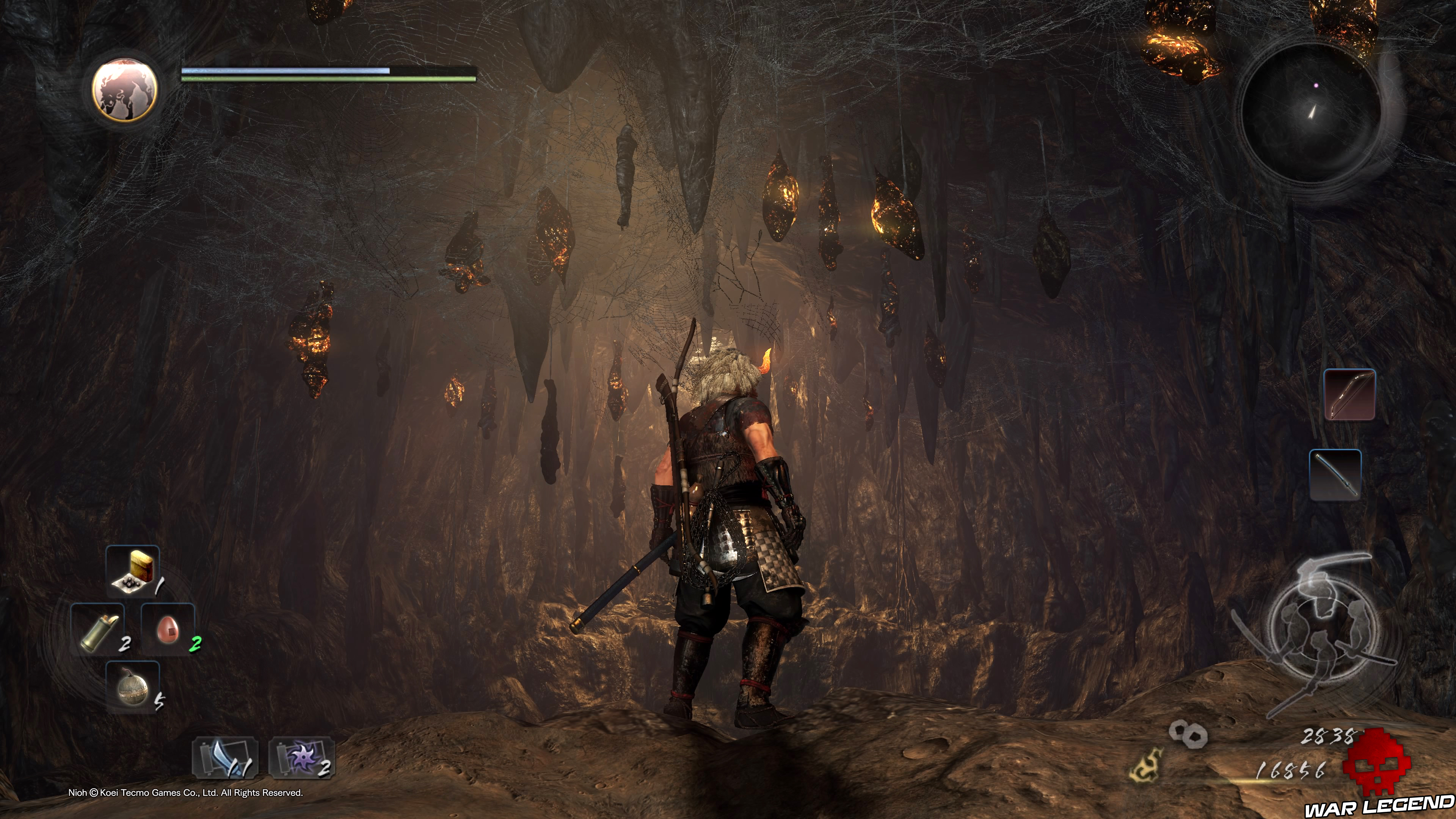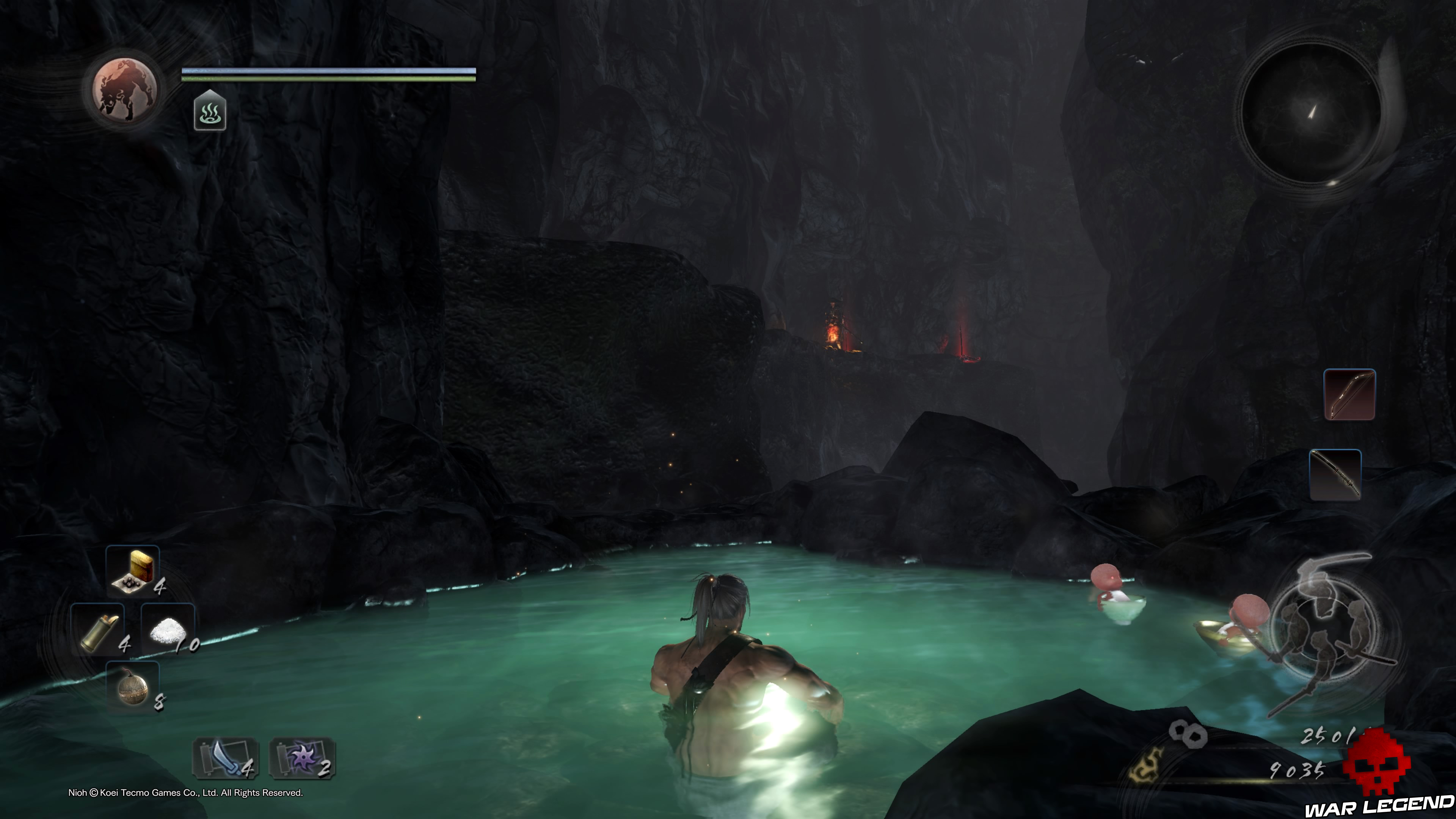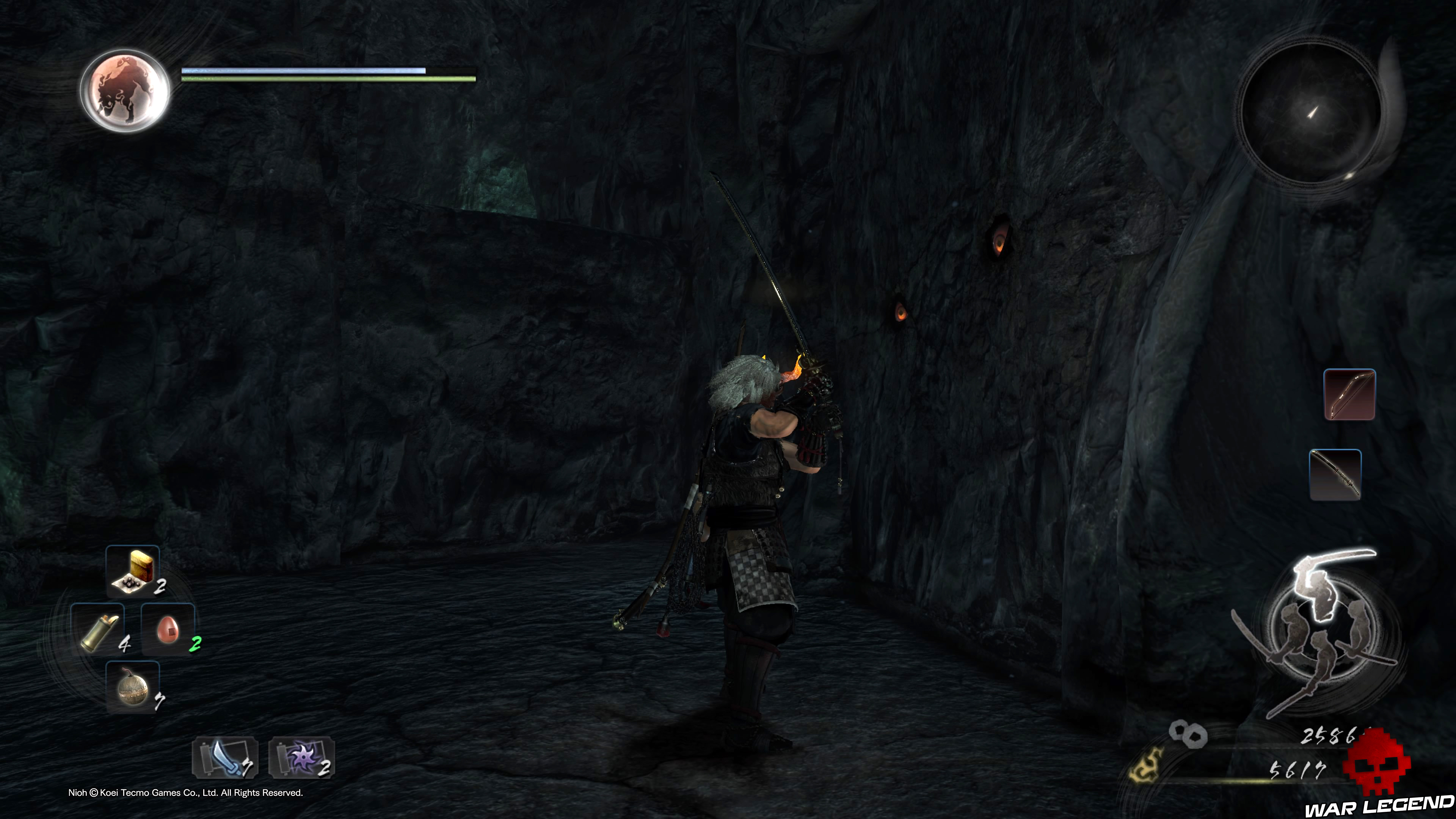 Descendez dans le tunnel. Dans la grotte qui surgit, un ennemi arrive en face et l’autre par la droite. Tuez -les puis visitez l’alcôve sur la droite pour trouver un coffre contenant deux Pots d’eau Yokai et trois Flèches. Continuez à descendre pour arriver à l’air libre. Attention, un ennemi va tenter de vous surprendre par la gauche. Montrez-lui de quel bois vous vous chauffez (note, n’hésitez pas à faire usage du décor, Nioh vous permet de précipiter vos adversaires dans le vide).