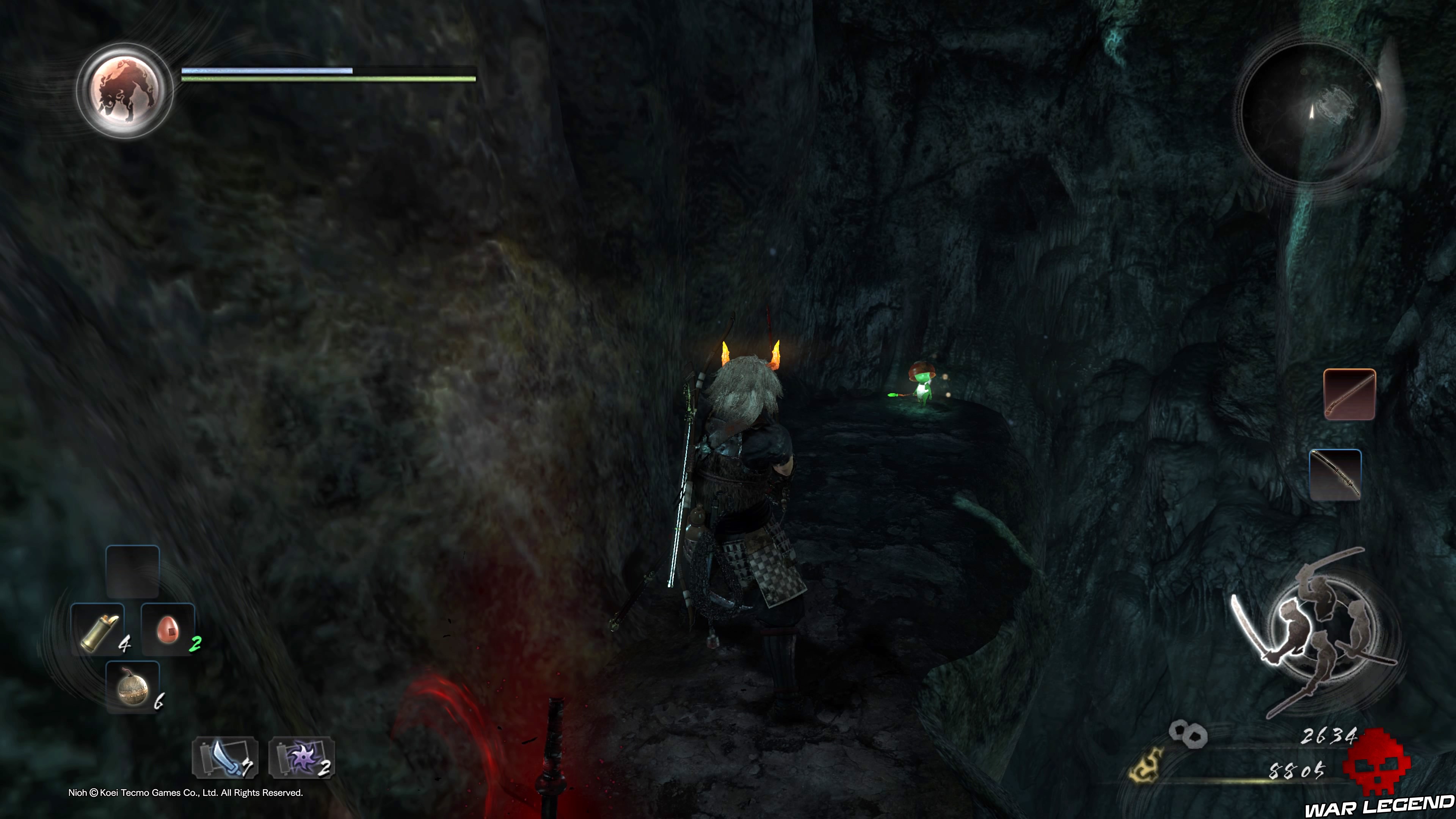 Allez-y, tuez le mort-vivant que vous trouvez, pillez le cadavre pour avoir des Mèches de jeune ninja et une Boîte de shinobi. Plus loin, un nouveau corps renfermant une Petite pierre d’esprit. Au moment de sortir de la grotte, mettez-vous en garde pour vous protéger des chauve-souris. Éliminez le squelette sur la gauche et le Yokai sur la droite. Pillez le cadavre (Waraji d’Habits d’archer, Brosse sacrée). Laissez-vous tomber en contrebas vers une autre corps contenant une Lance jumonji d’écuyer.