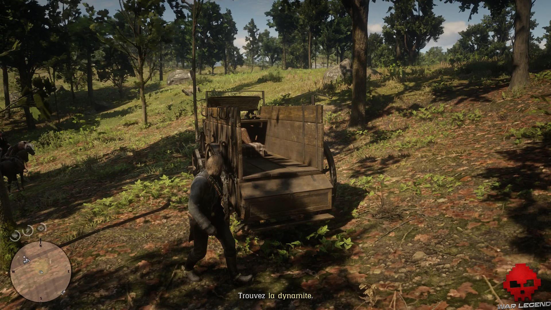 Chevauchez puis suivez Marston jusqu’au chariot chargé de dynamite. Montez à l’arrière et interagissez avec la caisse pour récupérer les explosifs.