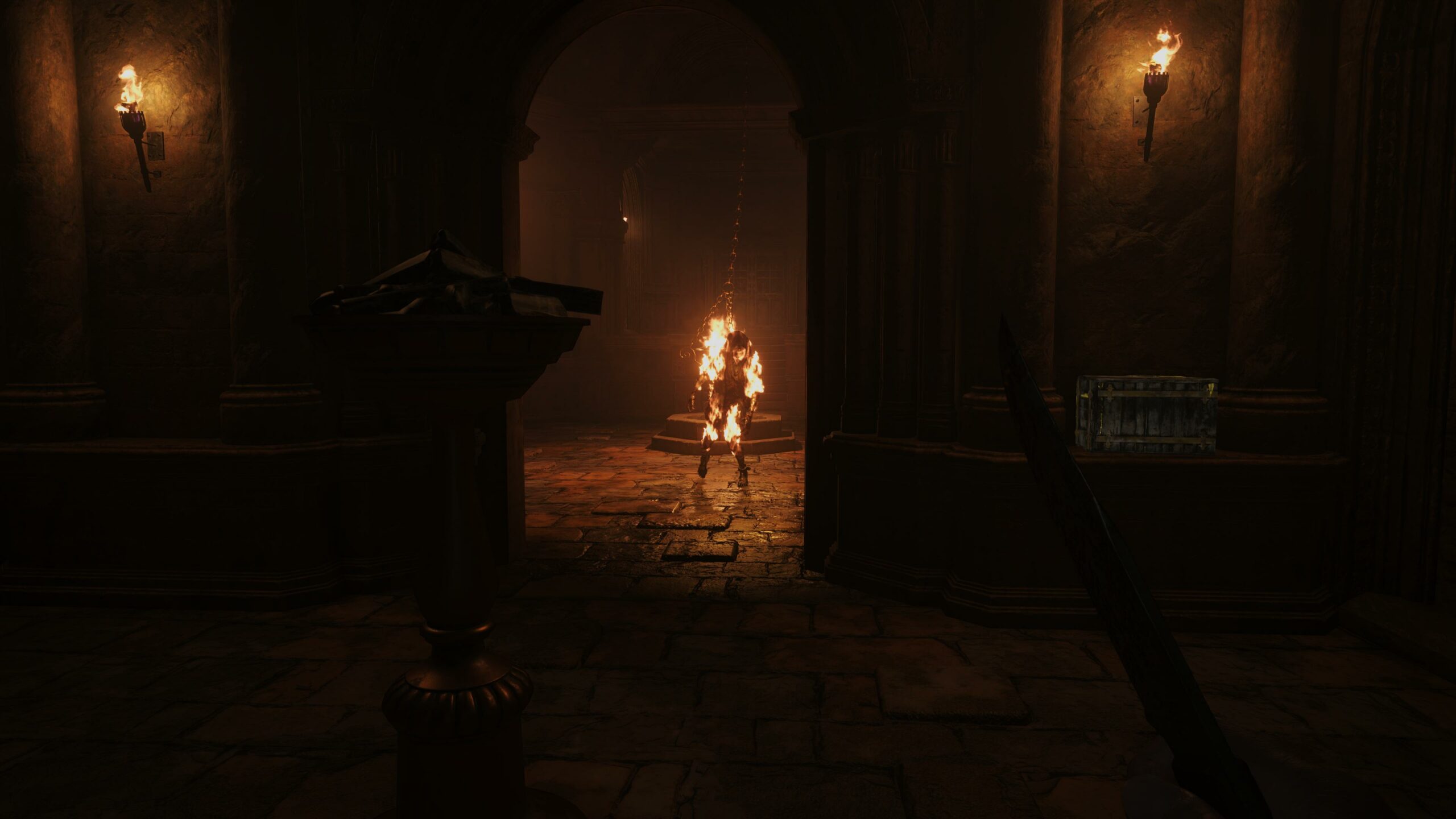 Revenez sur vos pas, traversez le pont et allez ouvrir la double porte droit devant en haut des marches. Vous allez débouler dans une salle où un feu attend au centre.