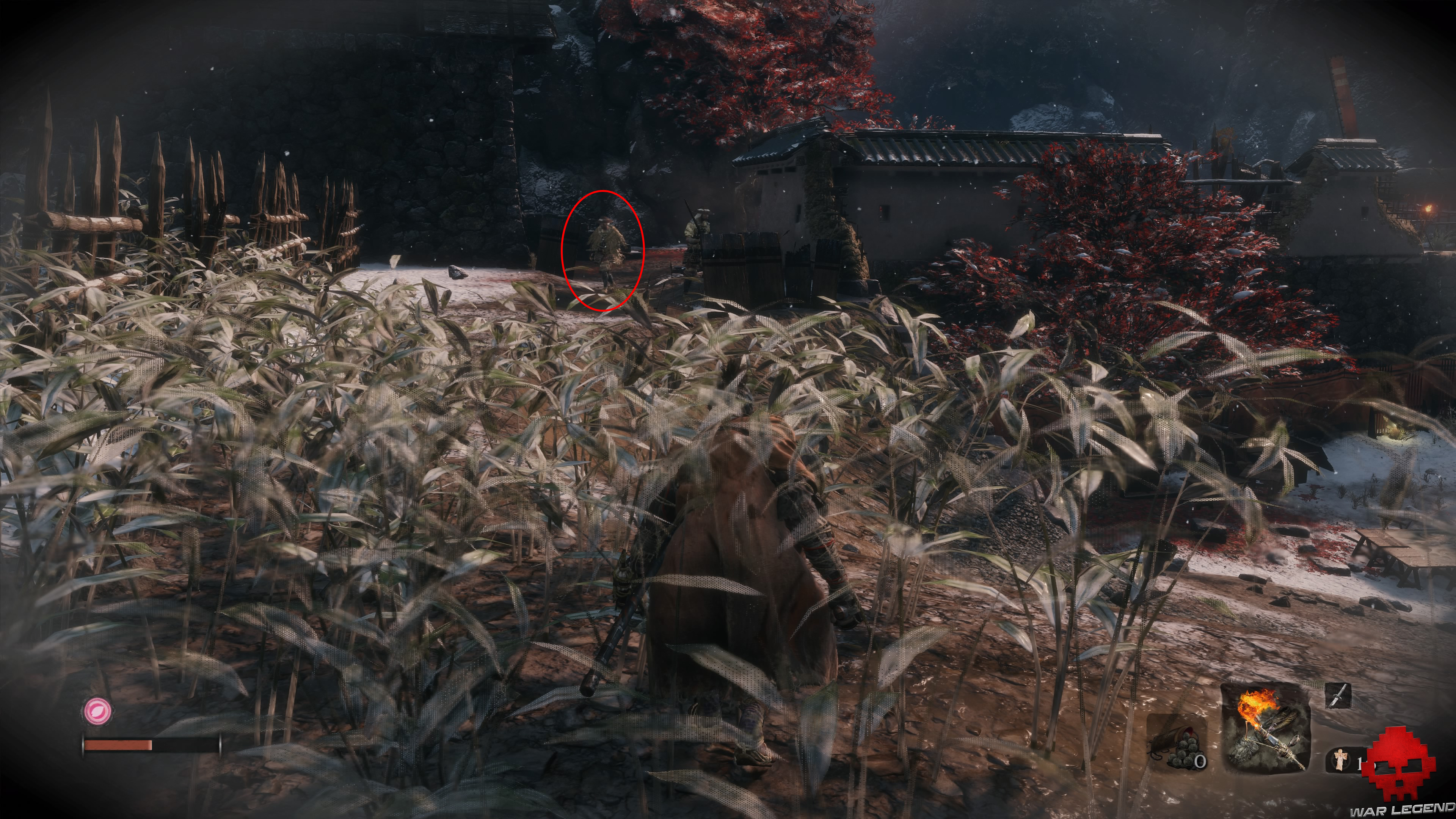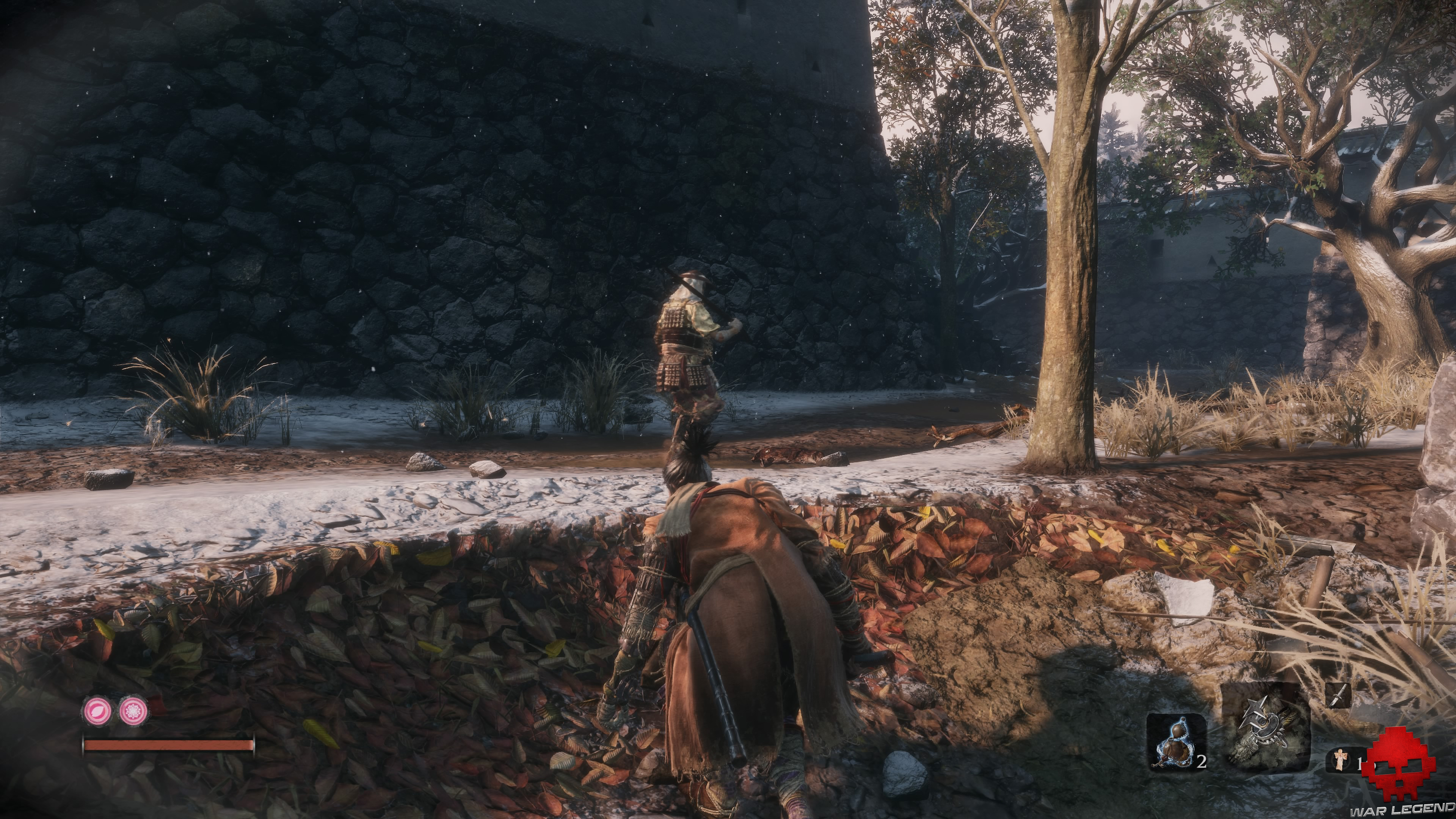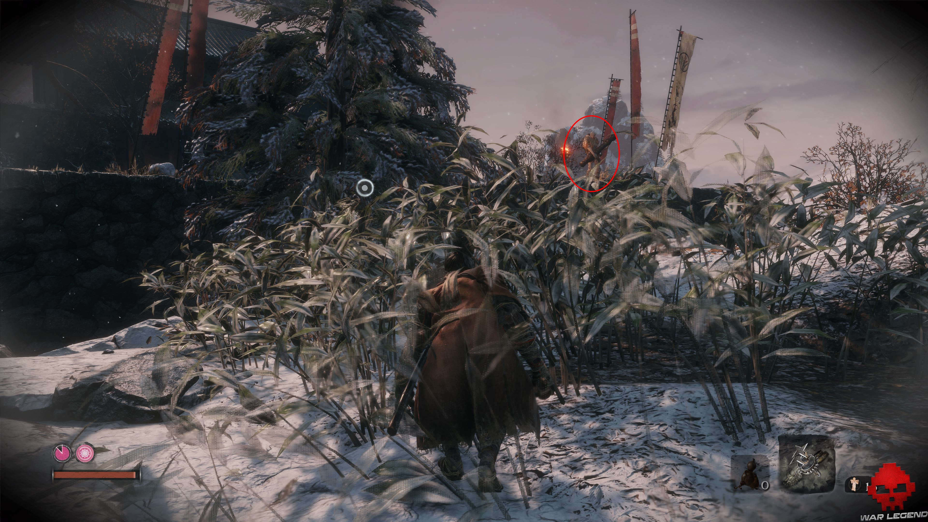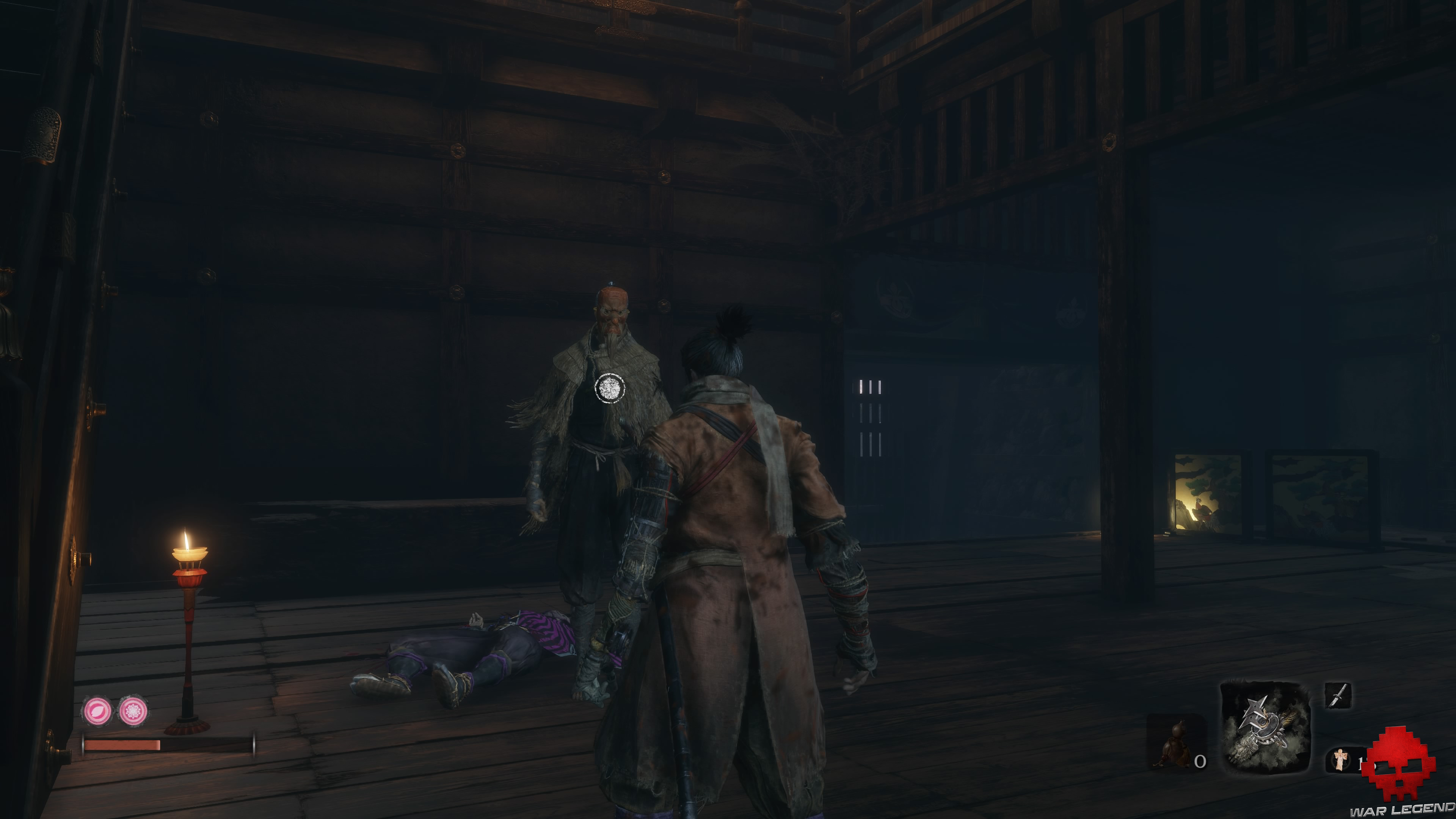 Contournez-le pour gagner un coup mortel gratuit contre-lui puis finissez-le pour obtenir une Perle de chapelet qui vous permettra, lorsque vous en aurez 4, d’améliorer votre vitalité ainsi que votre posture. Attention contre cet adversaire, s’il se met à générer une aura grisâtre, c’est qu’il va recharger sa posture – lancez-lui un shuriken ou attaquez-le.