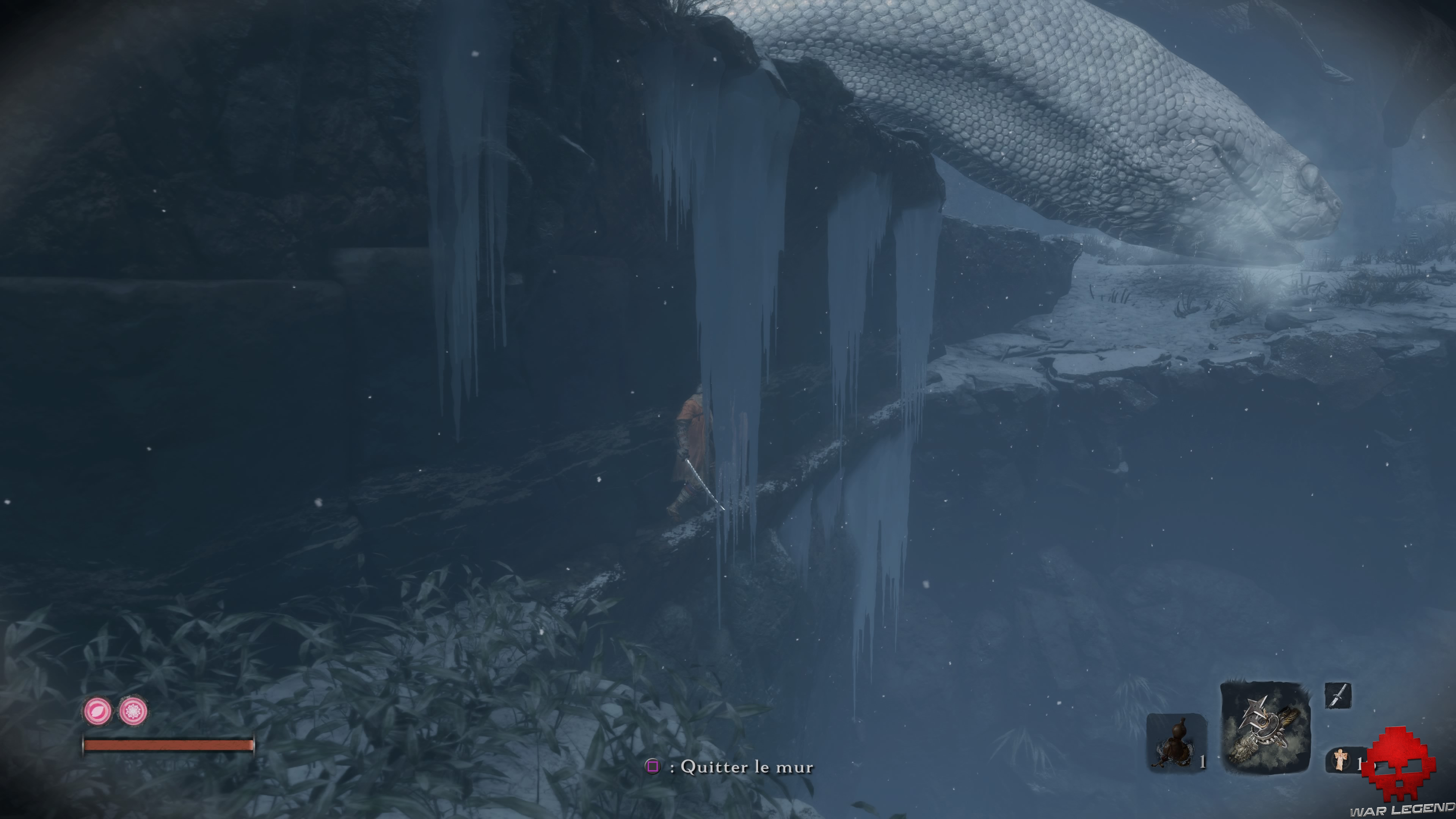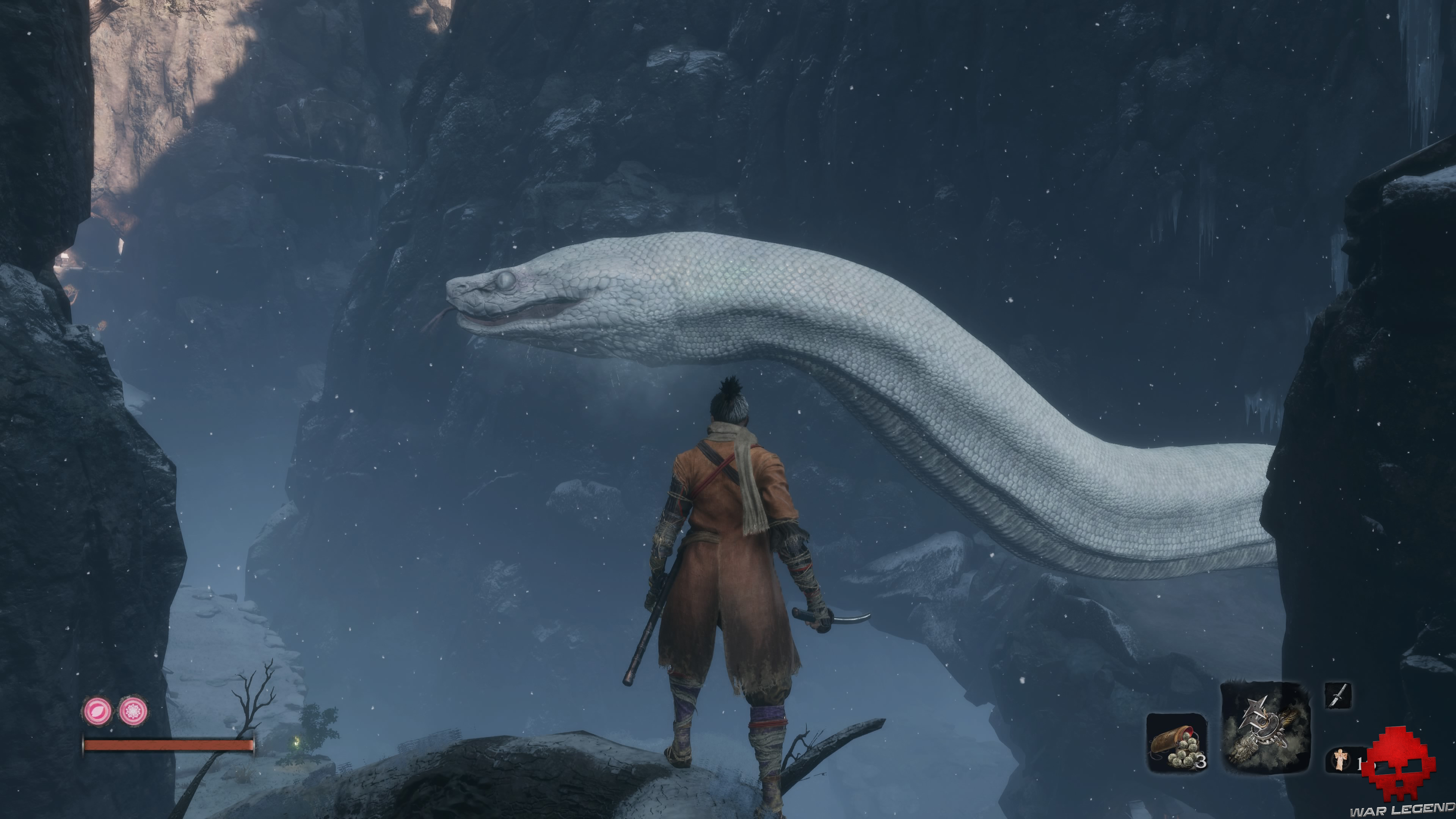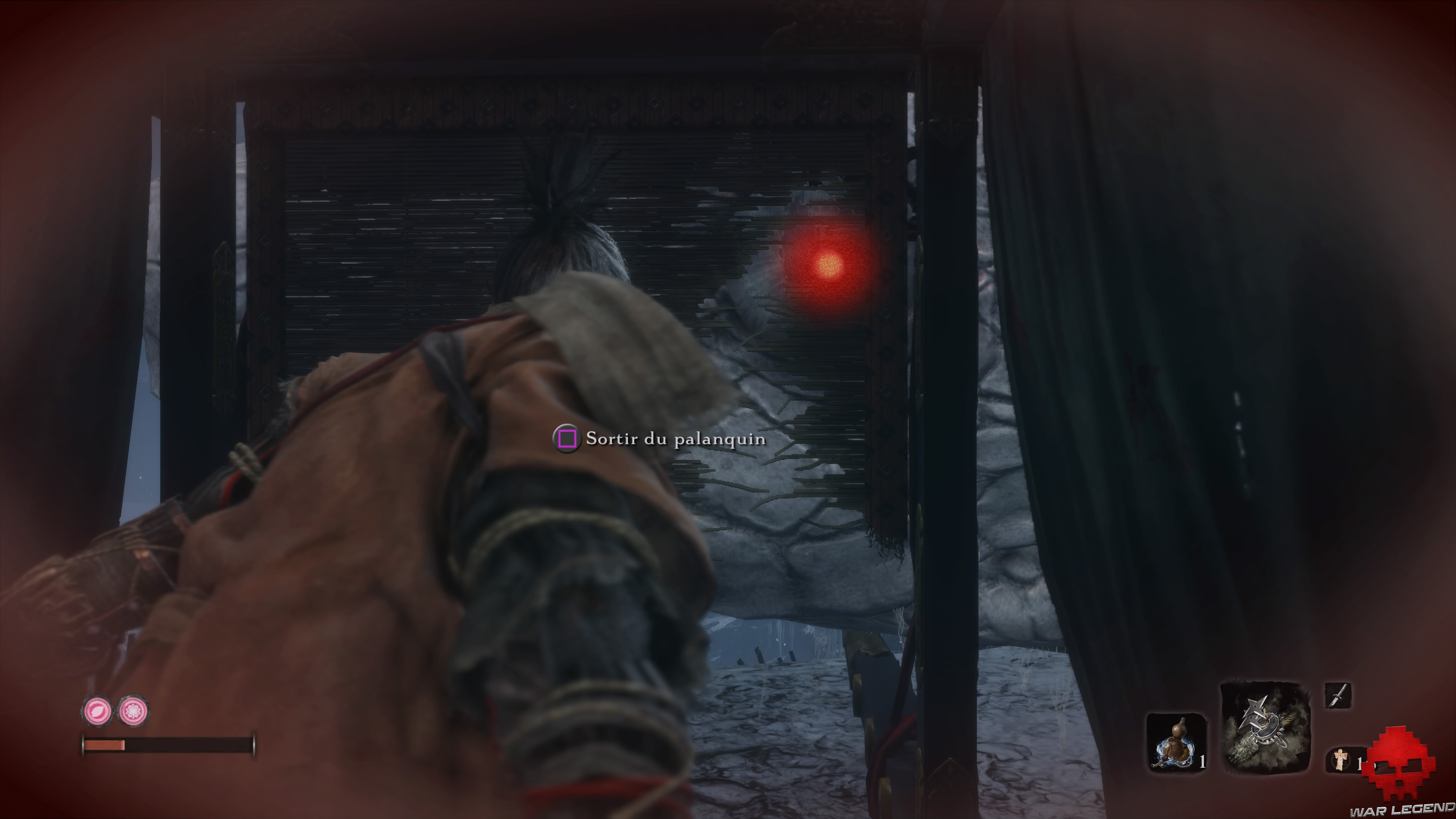 Lorsque vous arrivez à la dernière surface gelée, c’est l’inverse : attendez que le serpent tourne la tête à gauche pour sortir de votre cachette. Entrez immédiatement dans le palanquin juste à côté. Dès que le serpent d’approche, enfoncez-lui votre katana dans l’œil.