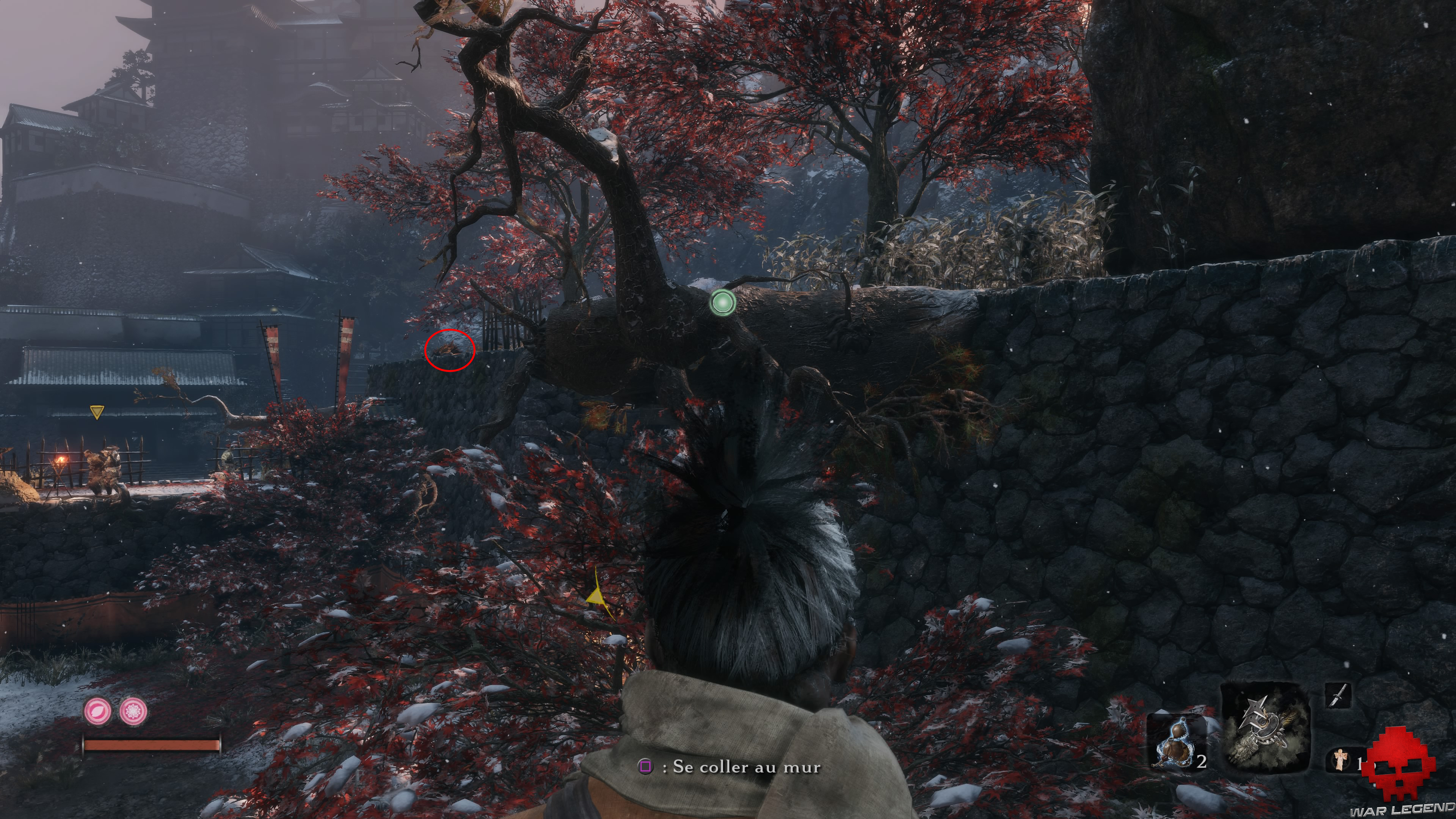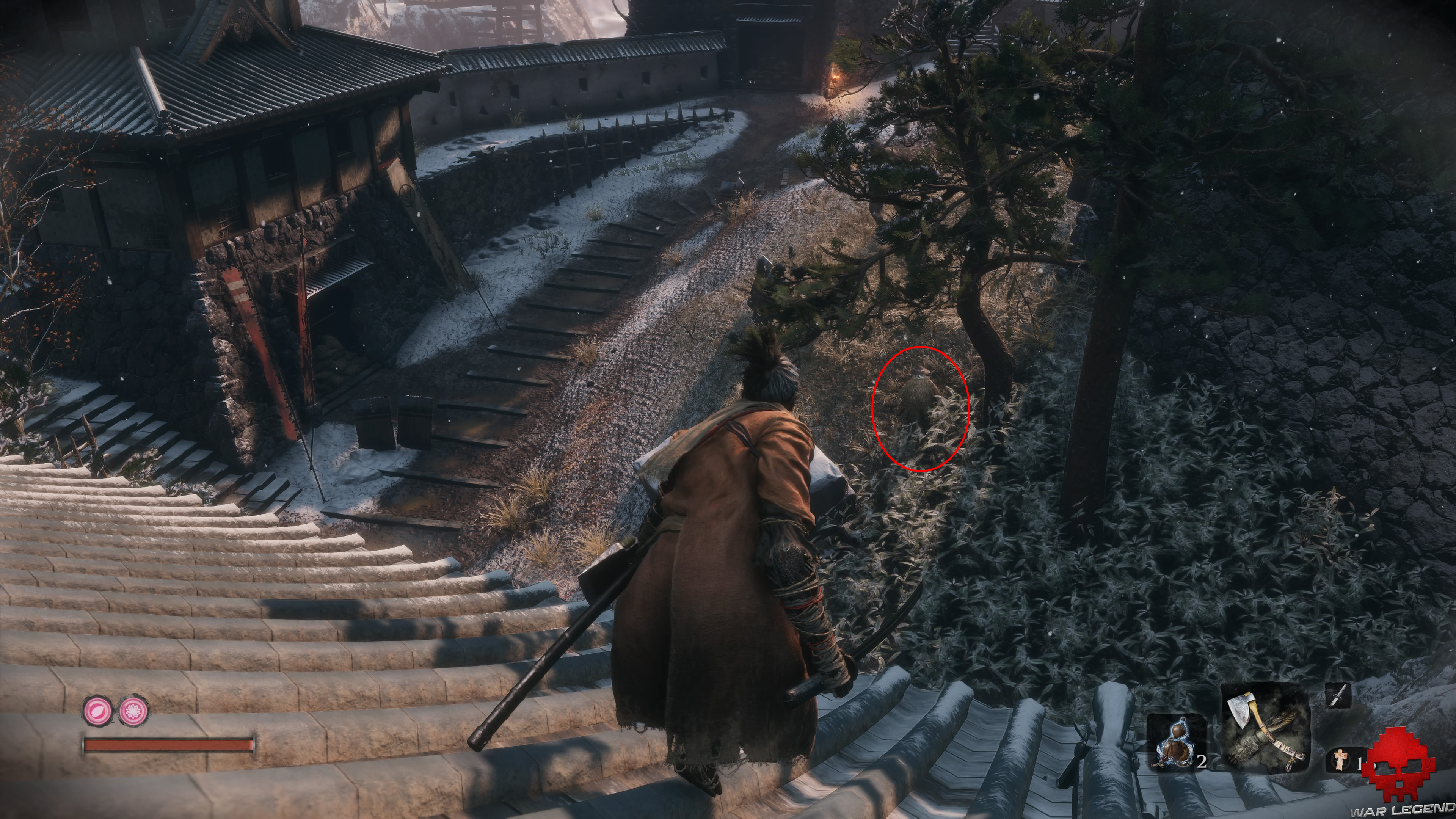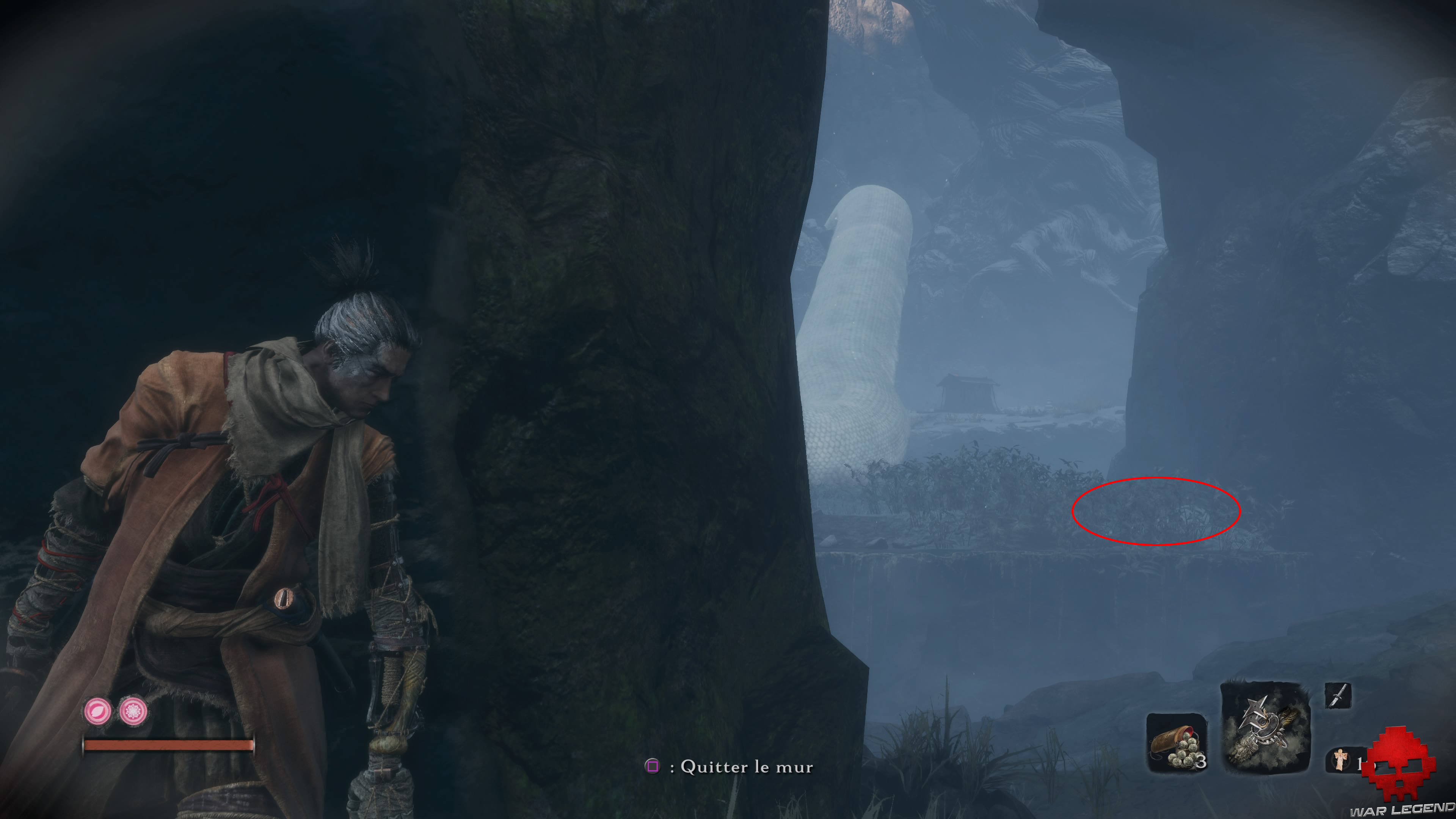Non loin de ce dernier, vous trouvez un Éclat de porcelaine, permettant d’attirer l’attention de l’ennemi dans une direction en le jetant. Ils sont cons, ces gardes, ça marche à chaque fois. Avancez-vous ensuite au bord du précipice, en face de l’ouverture dans le mur, et regardez en bas. Vous allez constater qu’un petite escarpement est visible, laissez-vous tomber et vous trouverez un Sucre d’Ako dans une grotte.