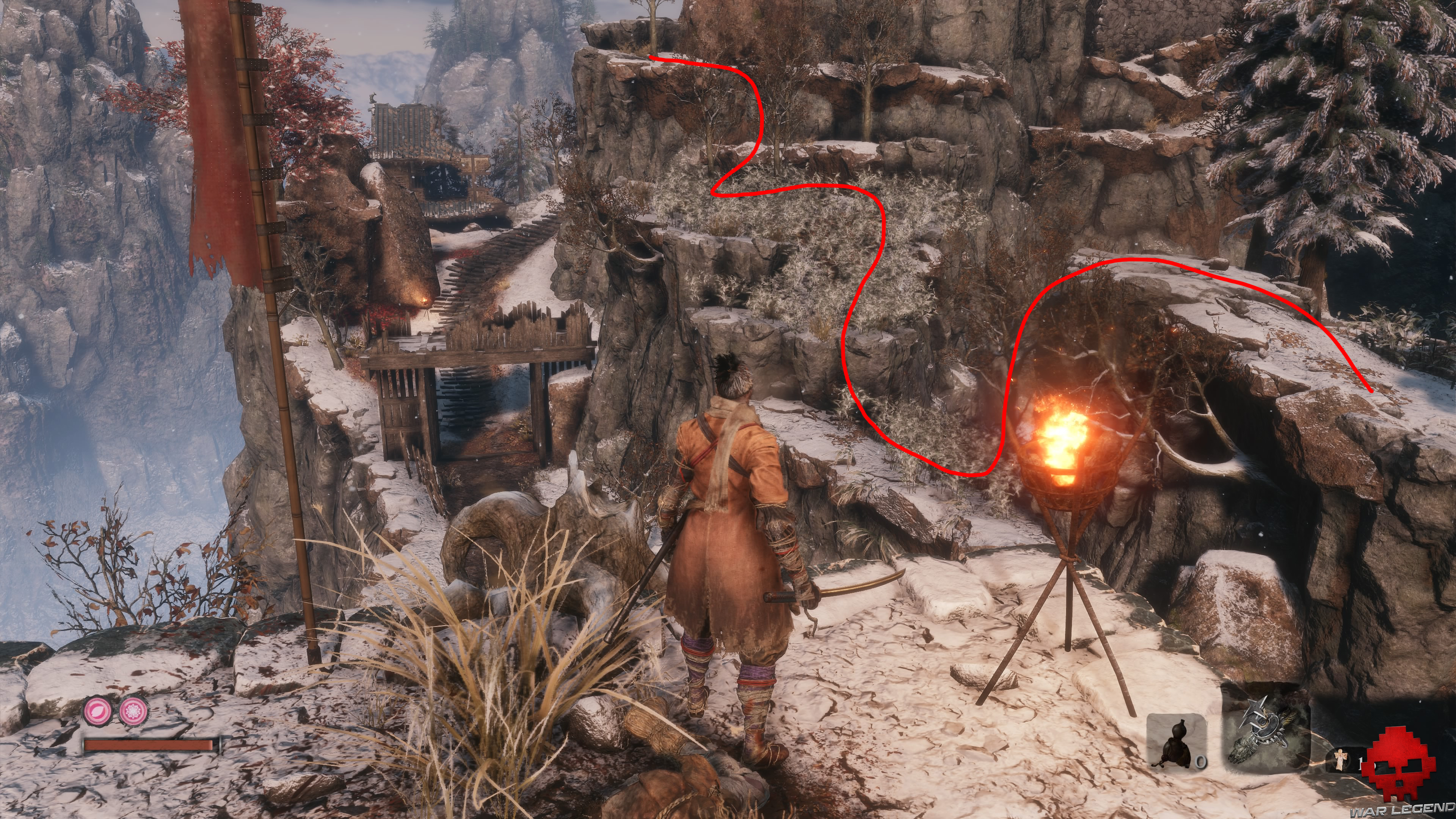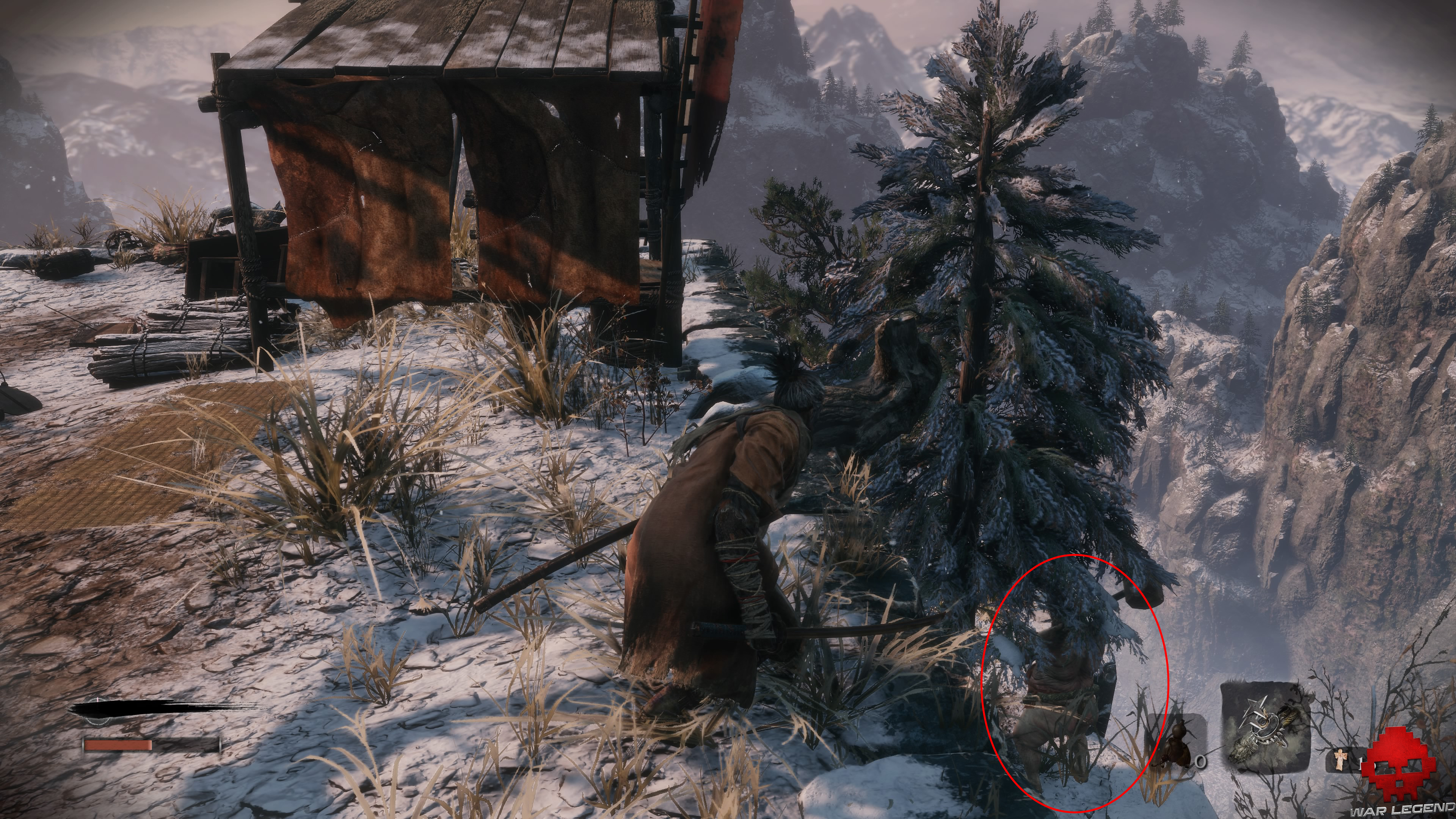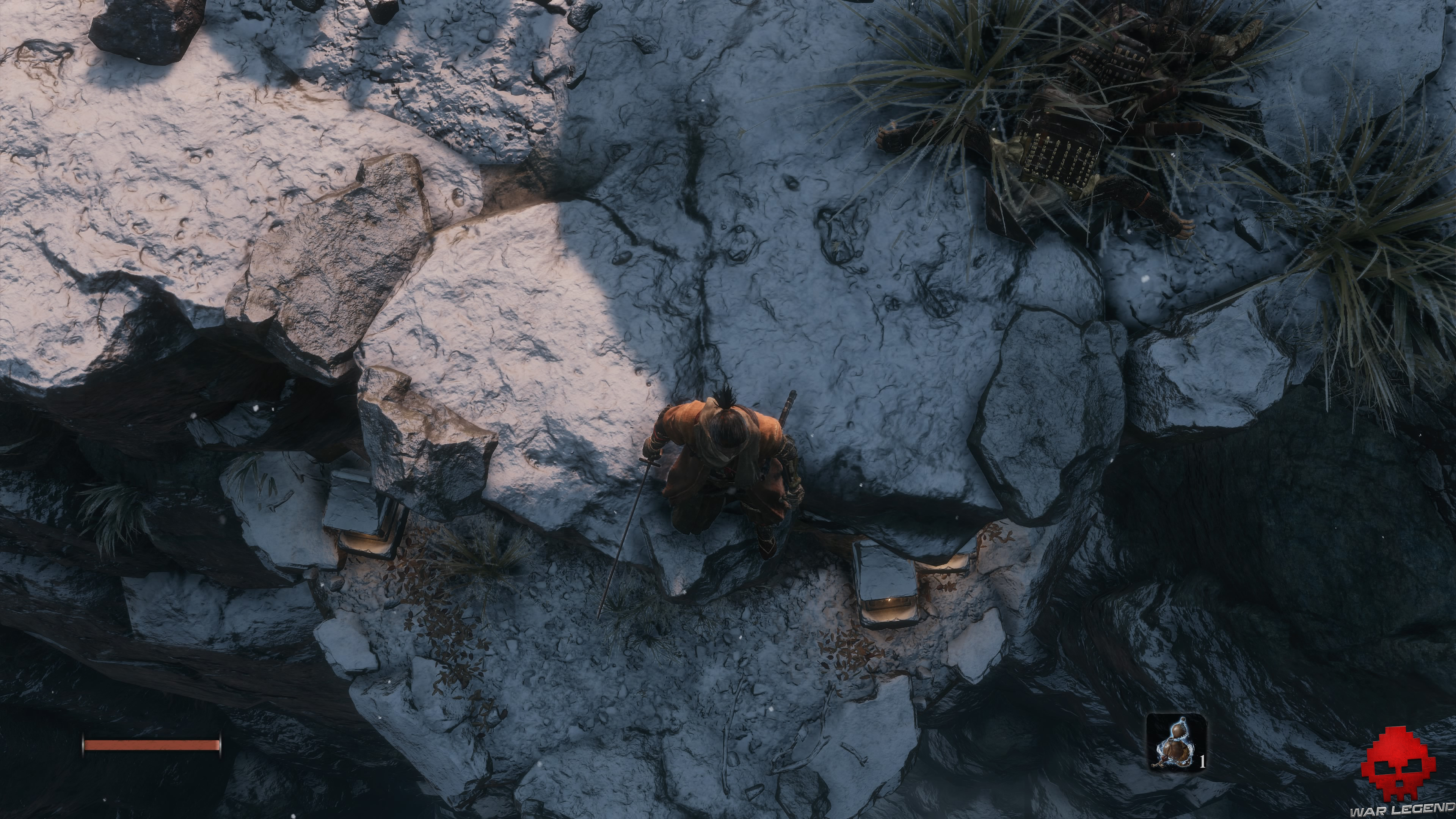 Non loin de ce dernier, vous trouvez un Éclat de porcelaine, permettant d’attirer l’attention de l’ennemi dans une direction en le jetant. Ils sont cons, ces gardes, ça marche à chaque fois. Avancez-vous ensuite au bord du précipice, en face de l’ouverture dans le mur, et regardez en bas. Vous allez constater qu’un petite escarpement est visible, laissez-vous tomber et vous trouverez un Sucre d’Ako dans une grotte.