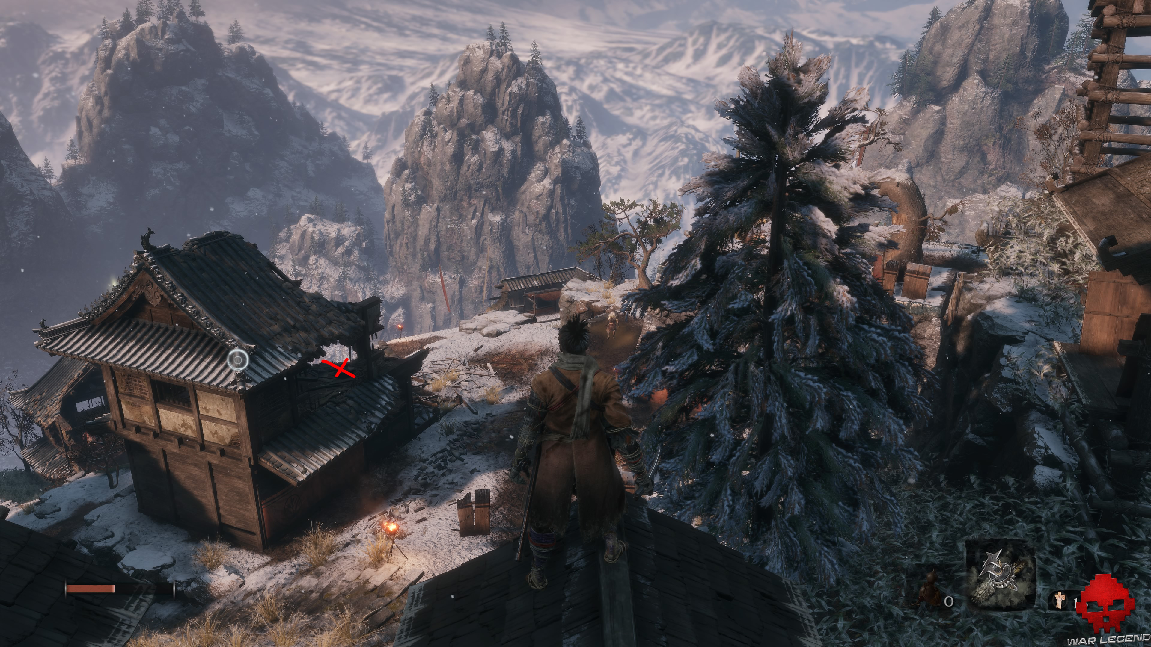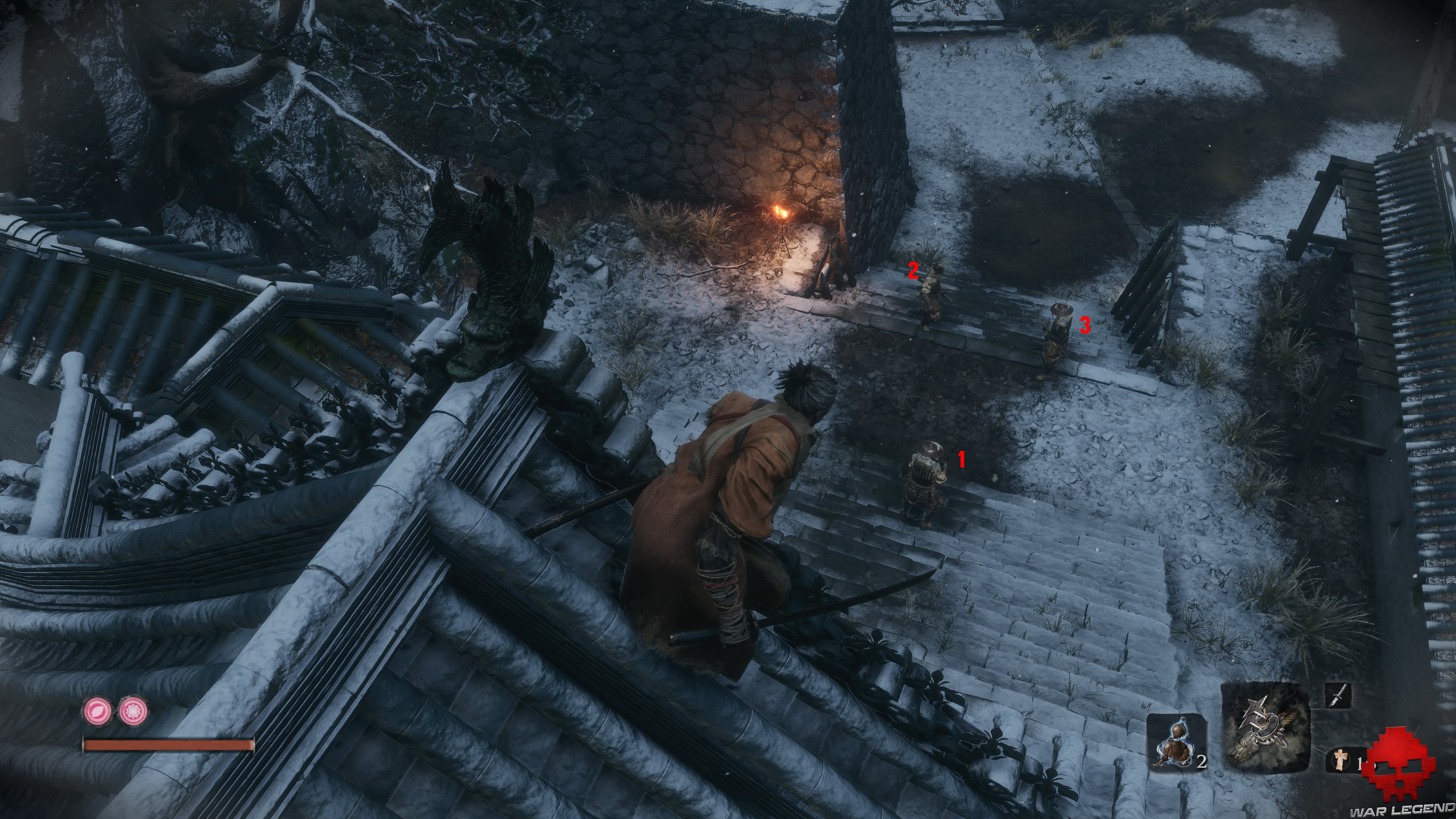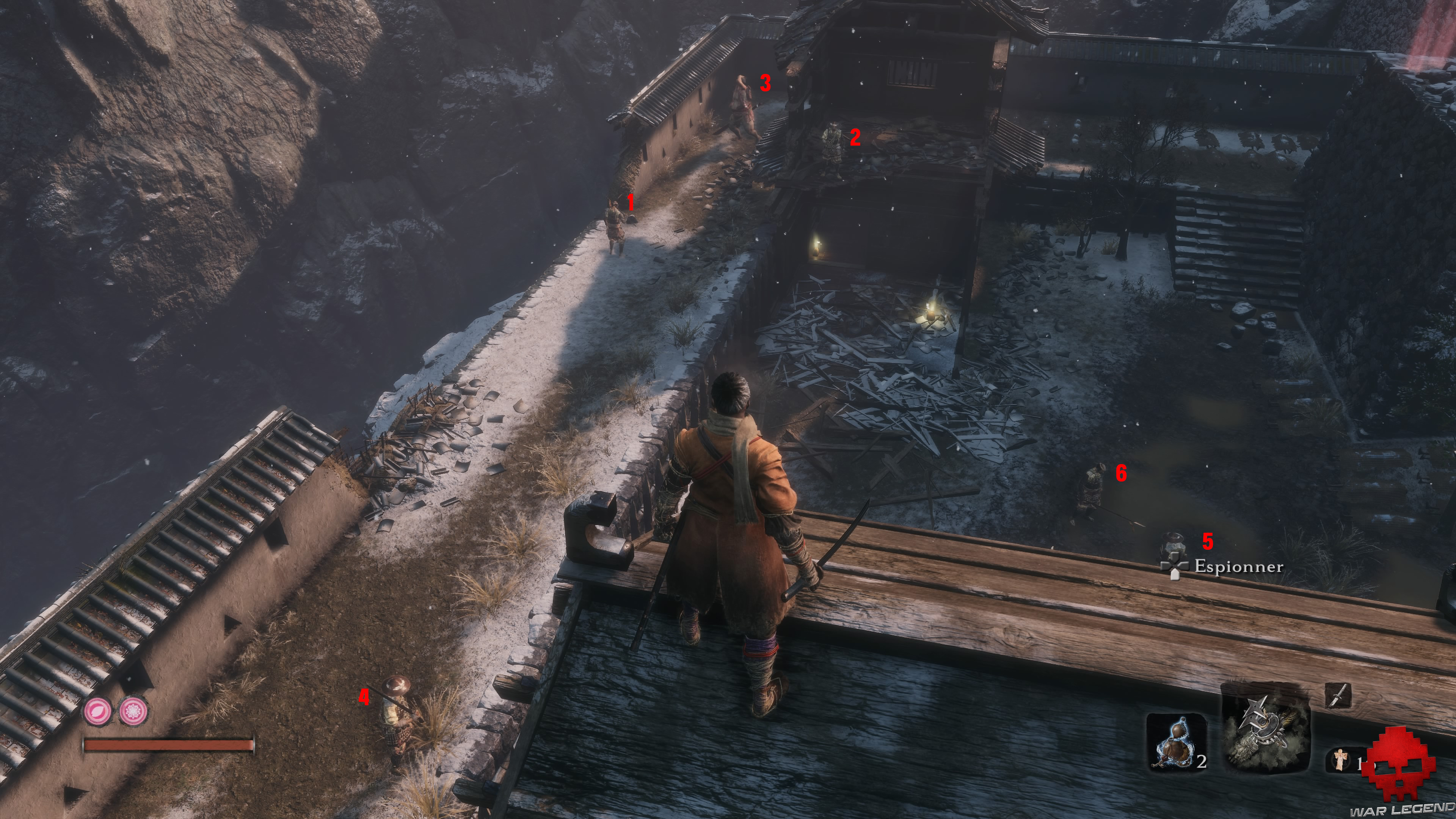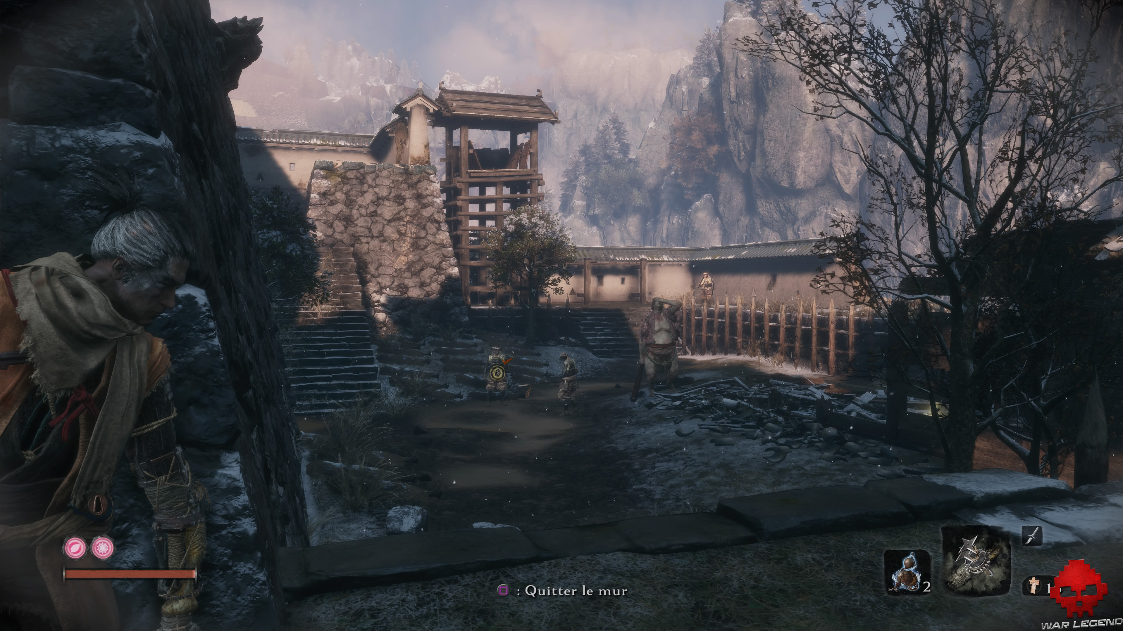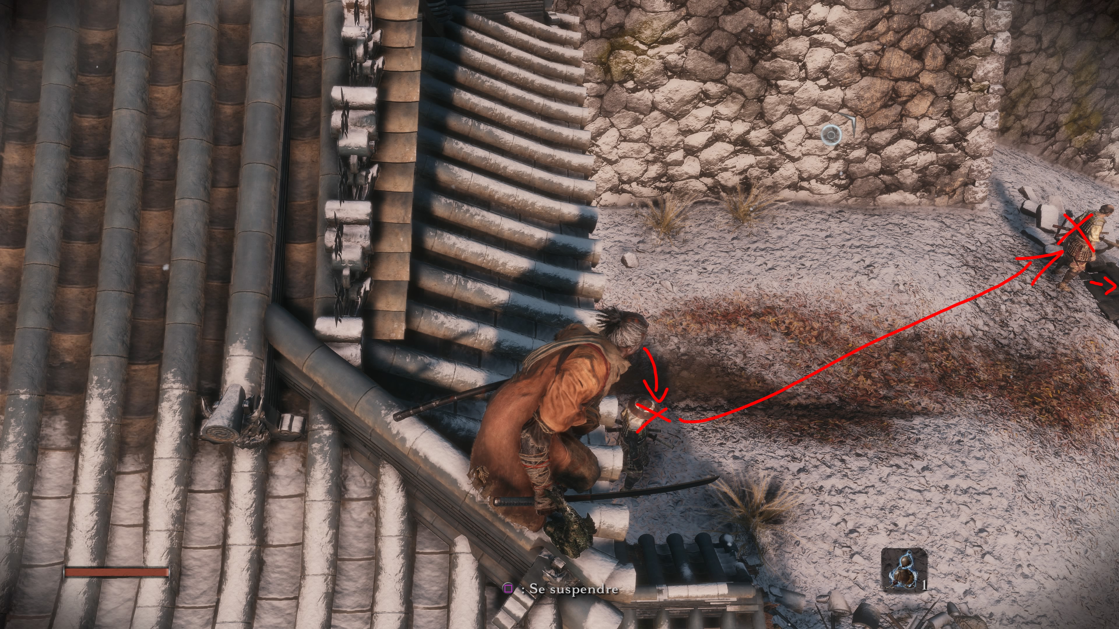 Redescendez à l’idole, puis encore d’un niveau et longez la muraille sur la droite. Ramassez un Sucre d’Ako. Levez les yeux et sautez pour vous suspendre à l’endroit où la muraille est cassée. Un ennemi vient régulièrement inspecter le contrebas, éliminez-le discrètement. Montez ensuite en faisant attention au balourd très lent qui déboule par la gauche, puis grimpez à l’étage de la bâtisse à moitié démolie pour tuer le fusilier posté là.