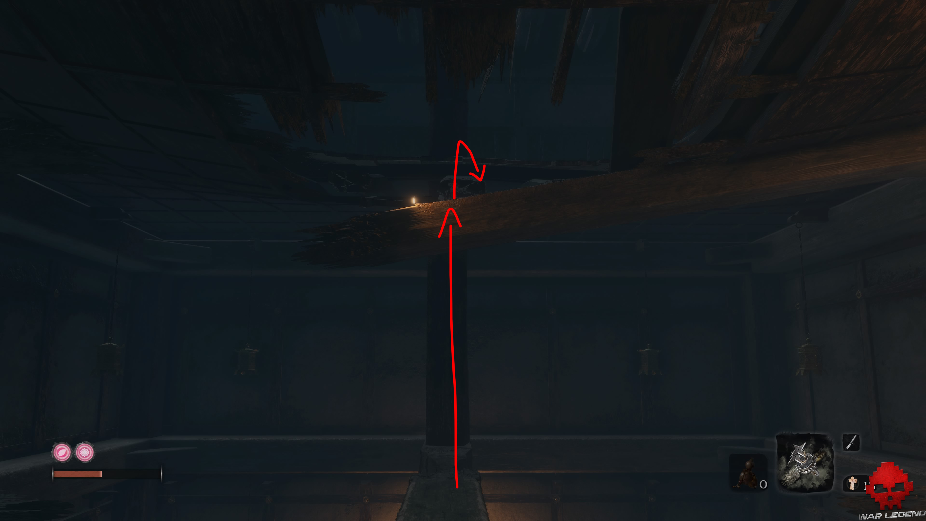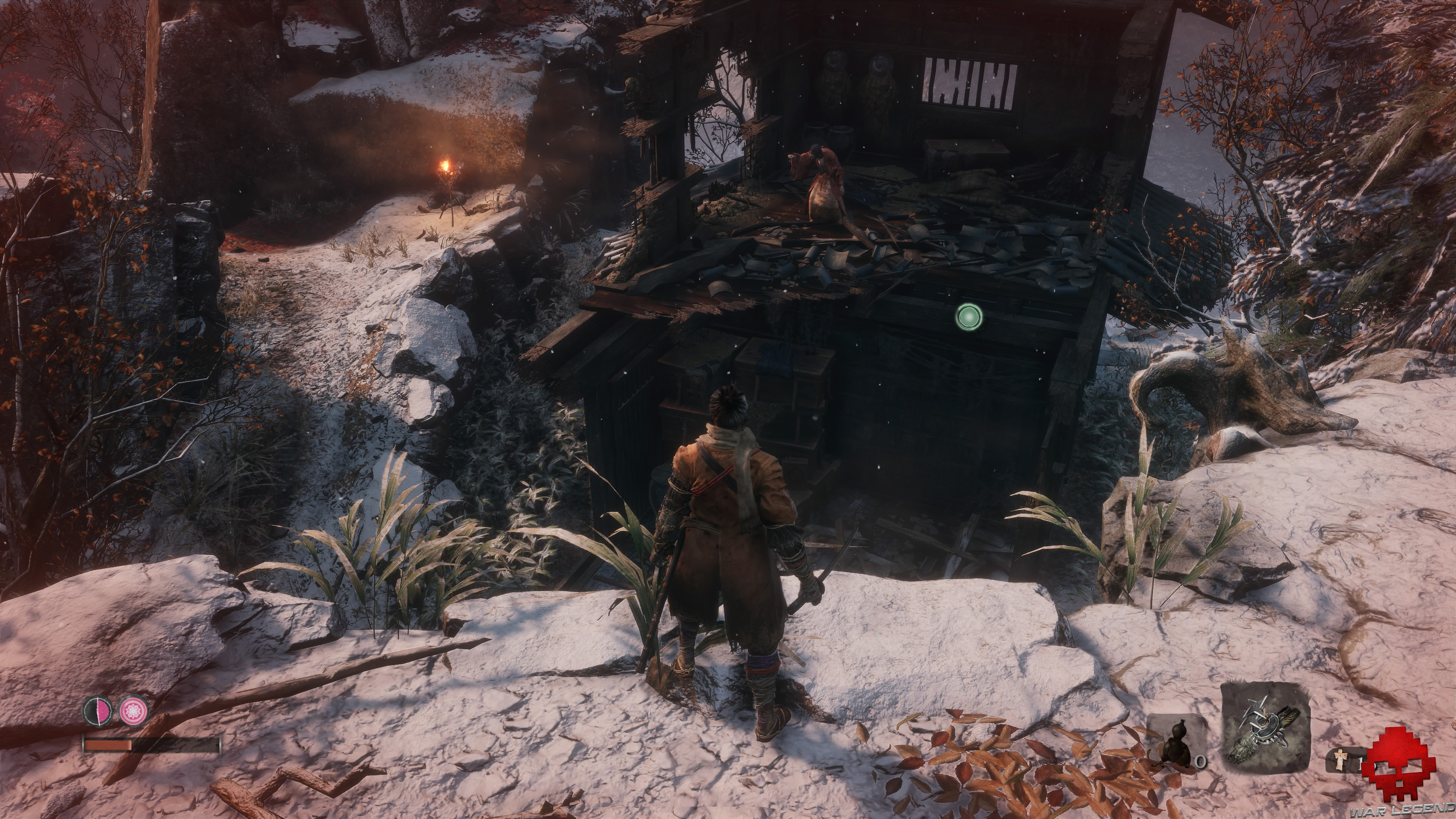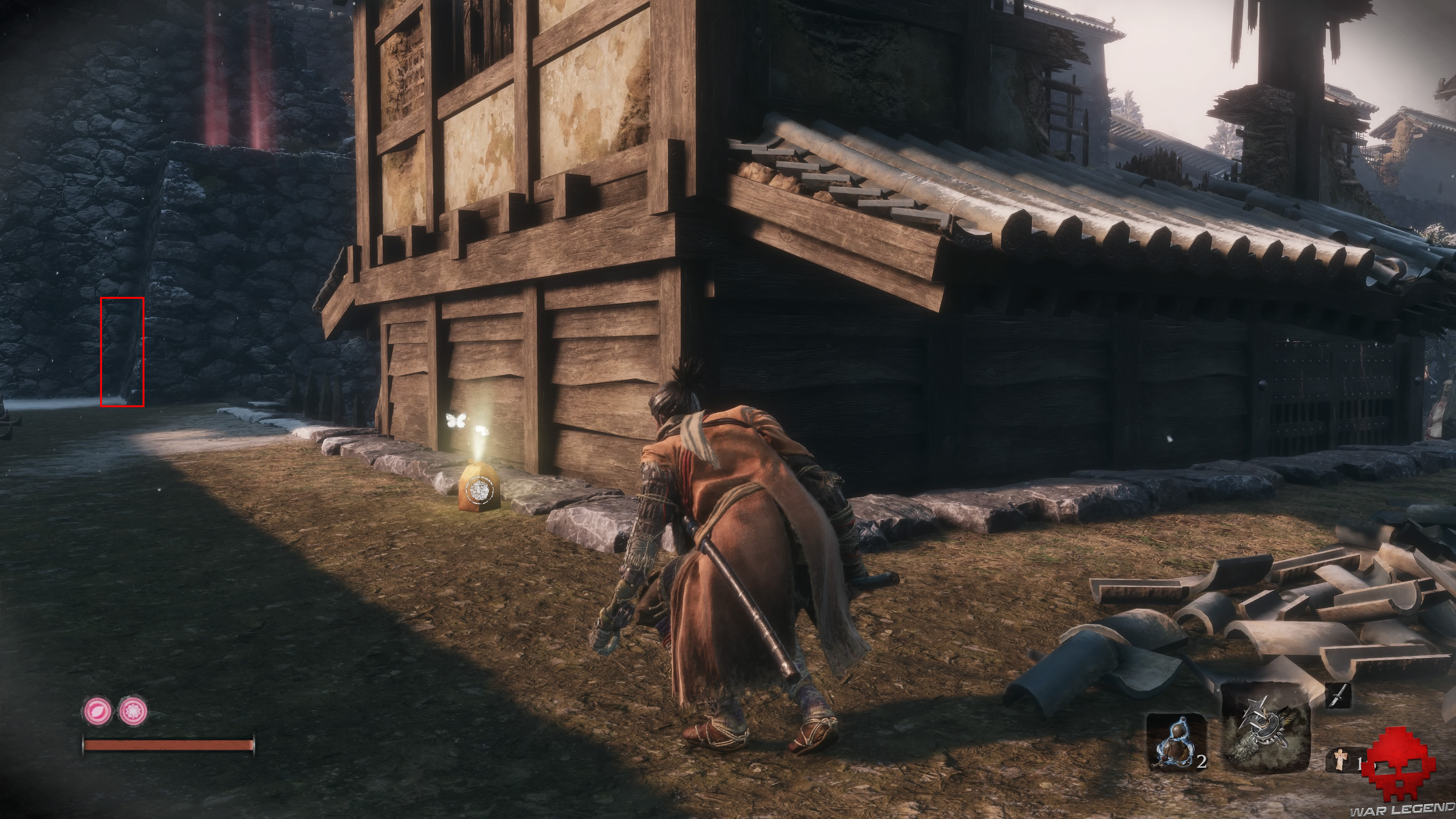 Vous pouvez ensuite fouillez le coin, à commencer par le rez-de-chaussée du bâtiment où vous avez tué le fusilier et qui referme un Ballon Mibu de richesse, sur le toit vous trouverez une Petite bourse. Plus bas, vous trouverez une vieille femme à l’étage d’une maison en ruine, parlez-lui pour récupérer le Charme de la cloche du jeune seigneur. Si vous le souhaitez, vous pouvez à présent retourner au Temple en Ruines et utiliser la cloche auprès du Bouddha pour accéder au Domaine Hirata, mais je vous conseille de boucler cette zone en premier.