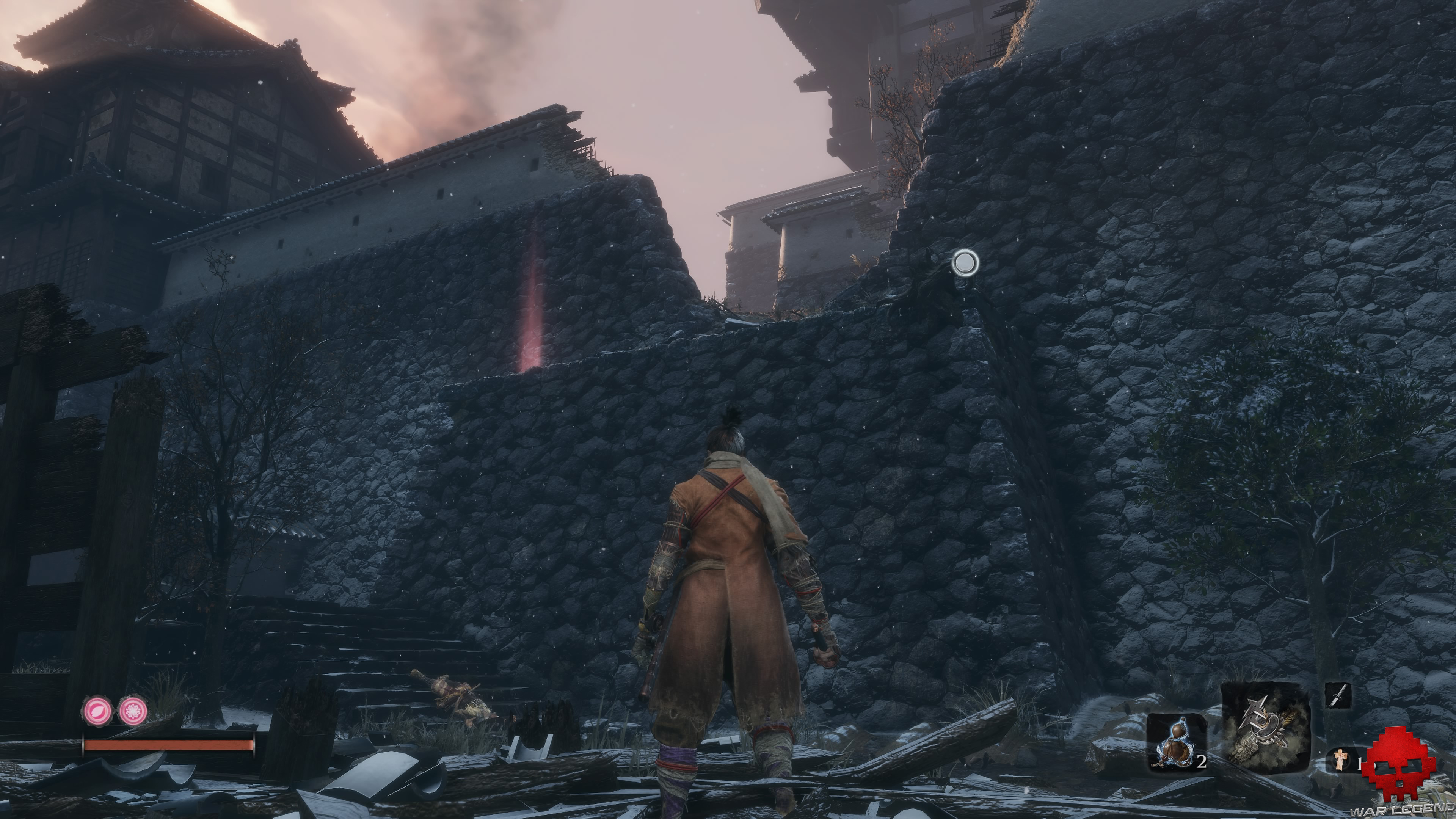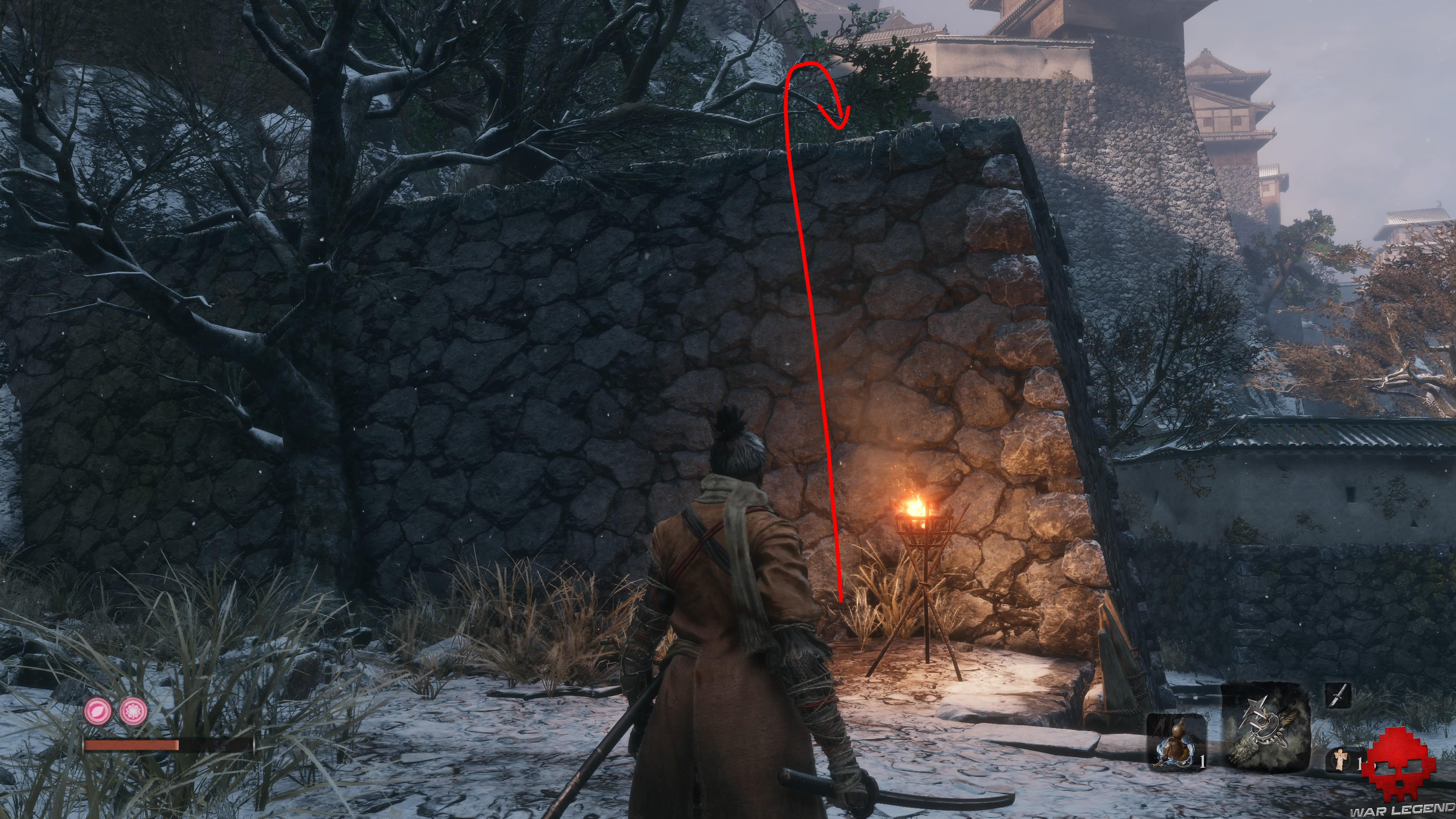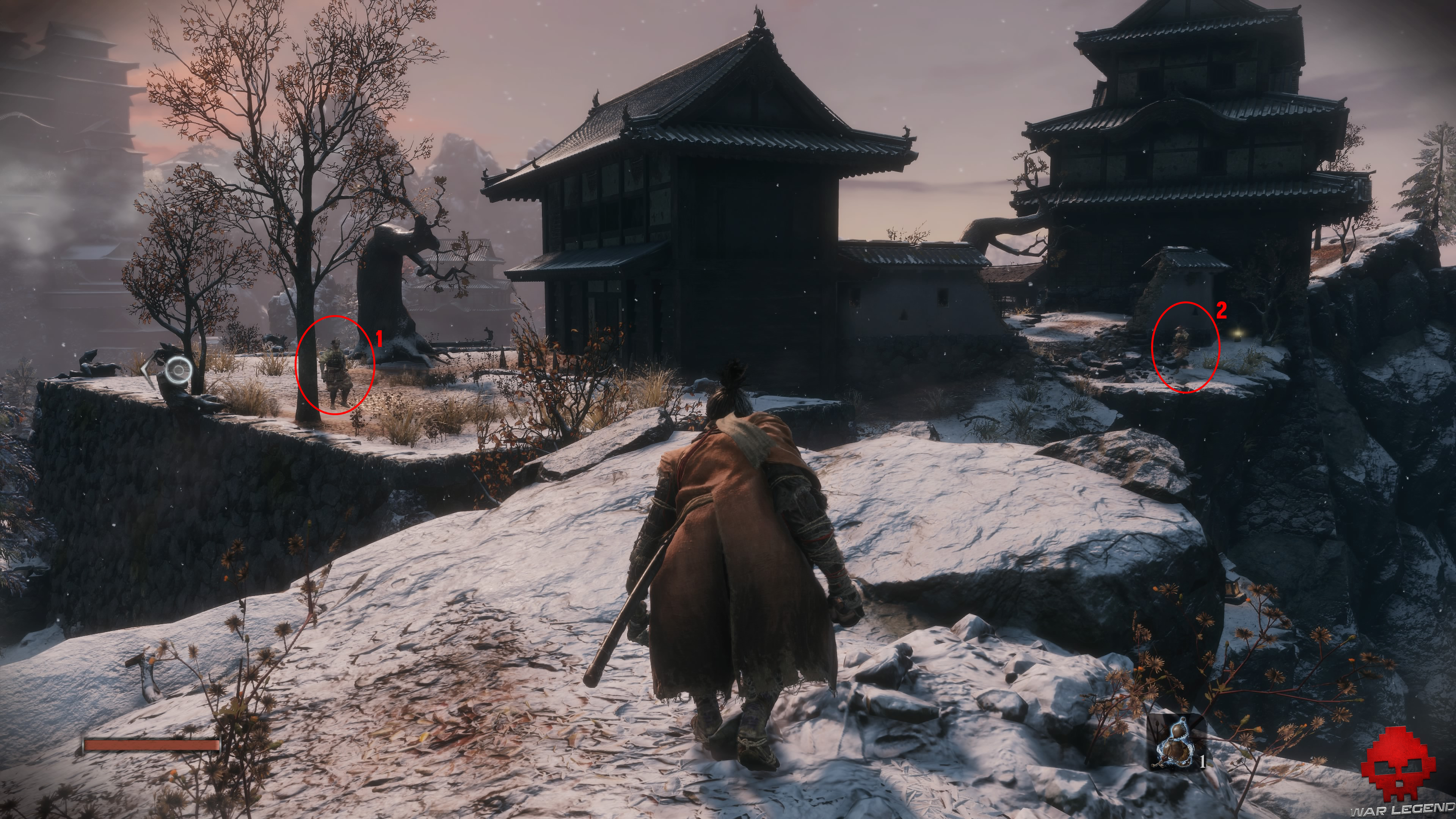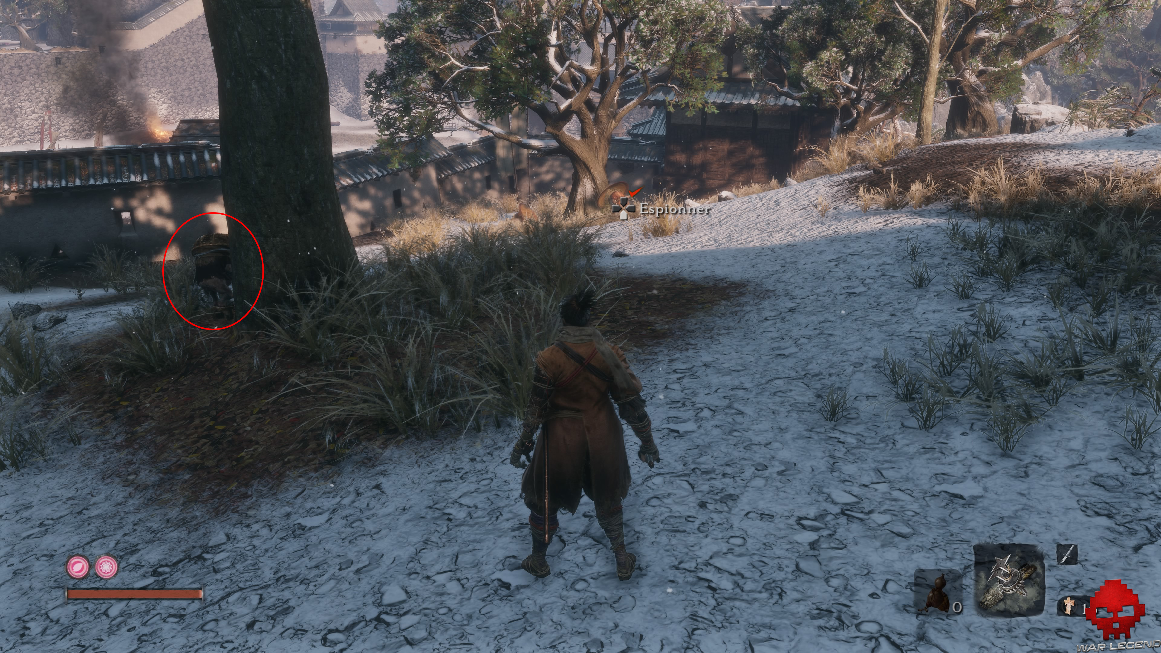 Vous ramasserez 1 Morceau de feret 1 Poignée de cendres. Poursuivez maintenant votre chemin en grimpant sur le toit de la porte face aux escaliers et espionnez la conversation puis tuez les 2 gardes. En passant la porte suivante, vous vous retrouvez au Château Ashina.