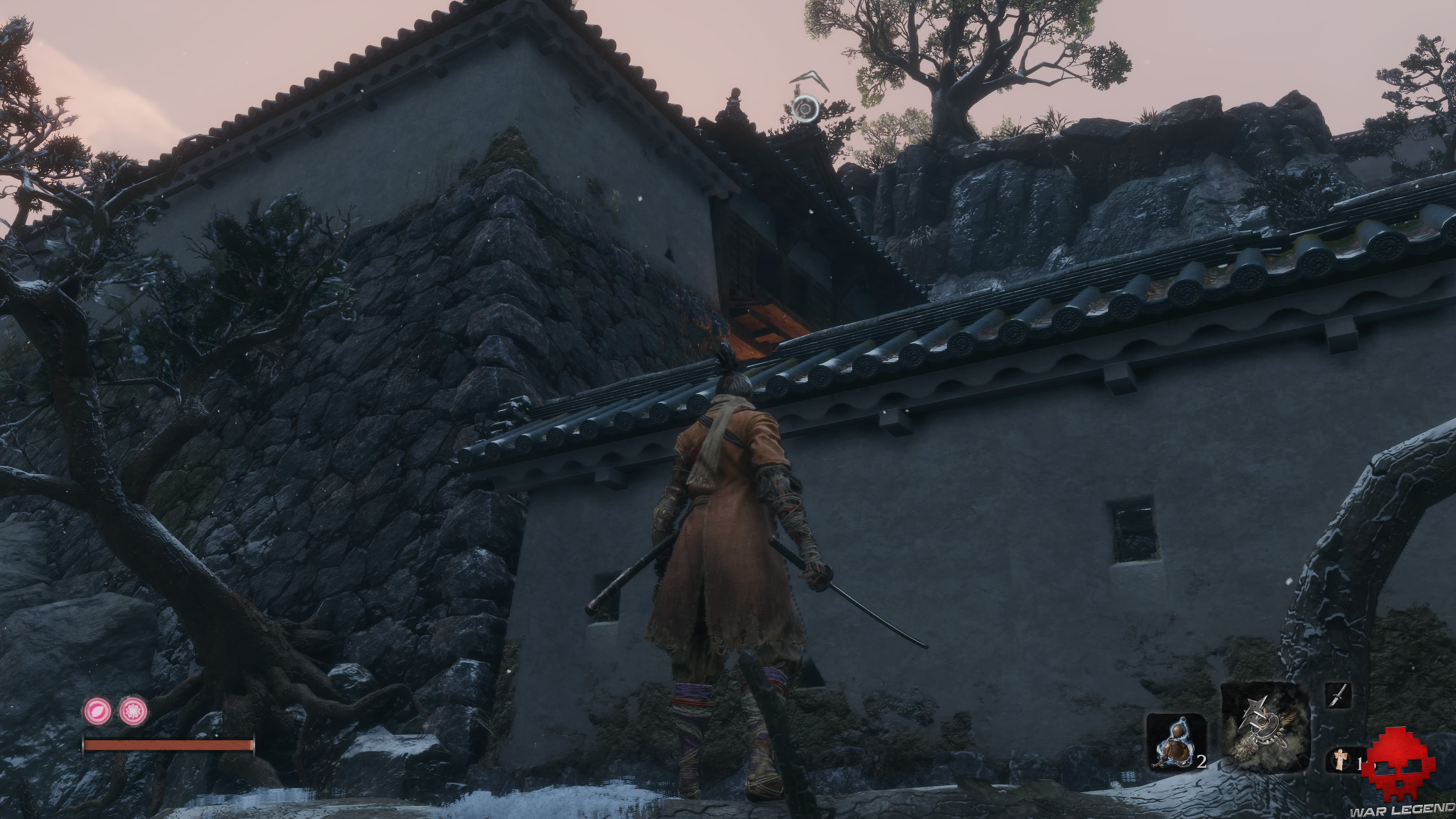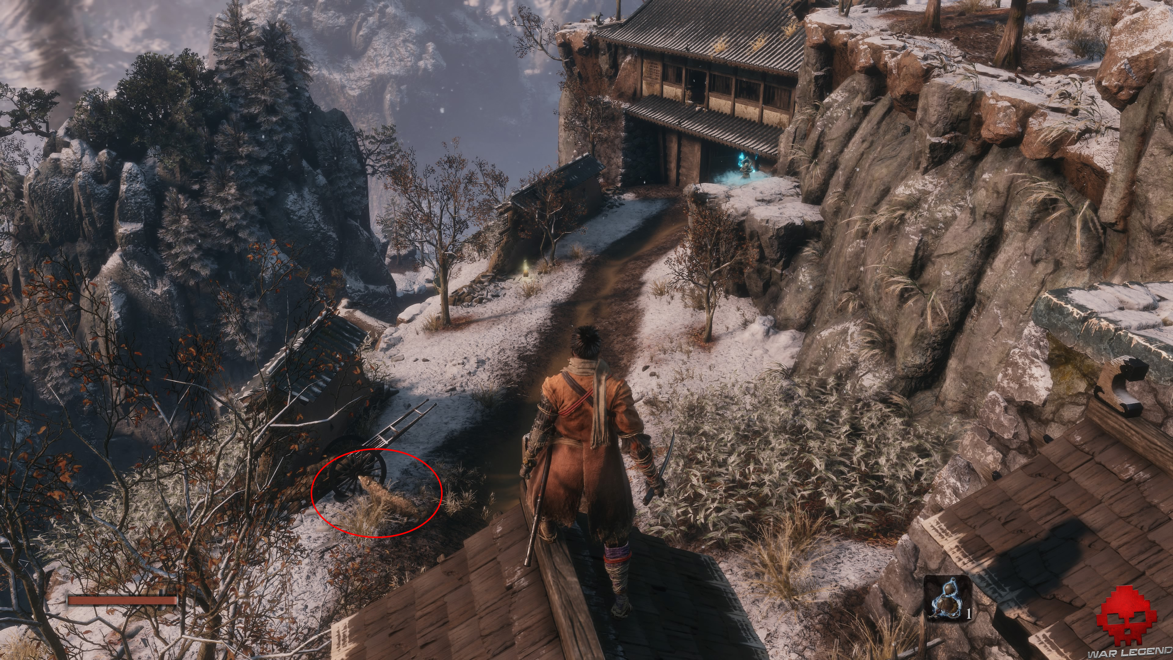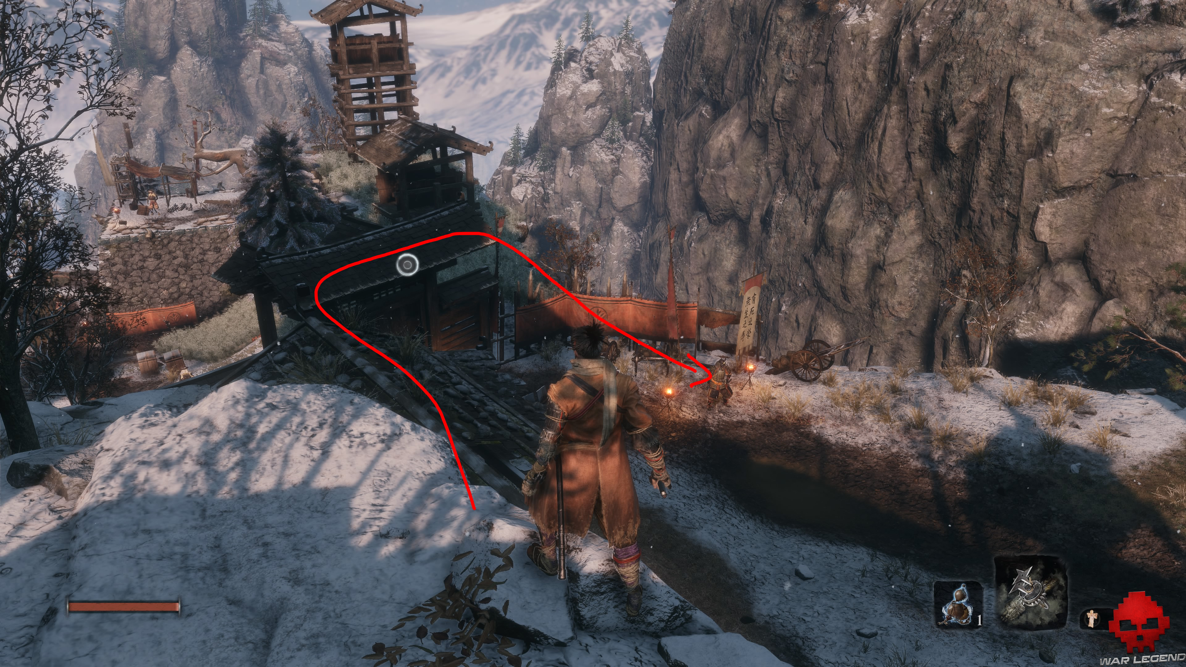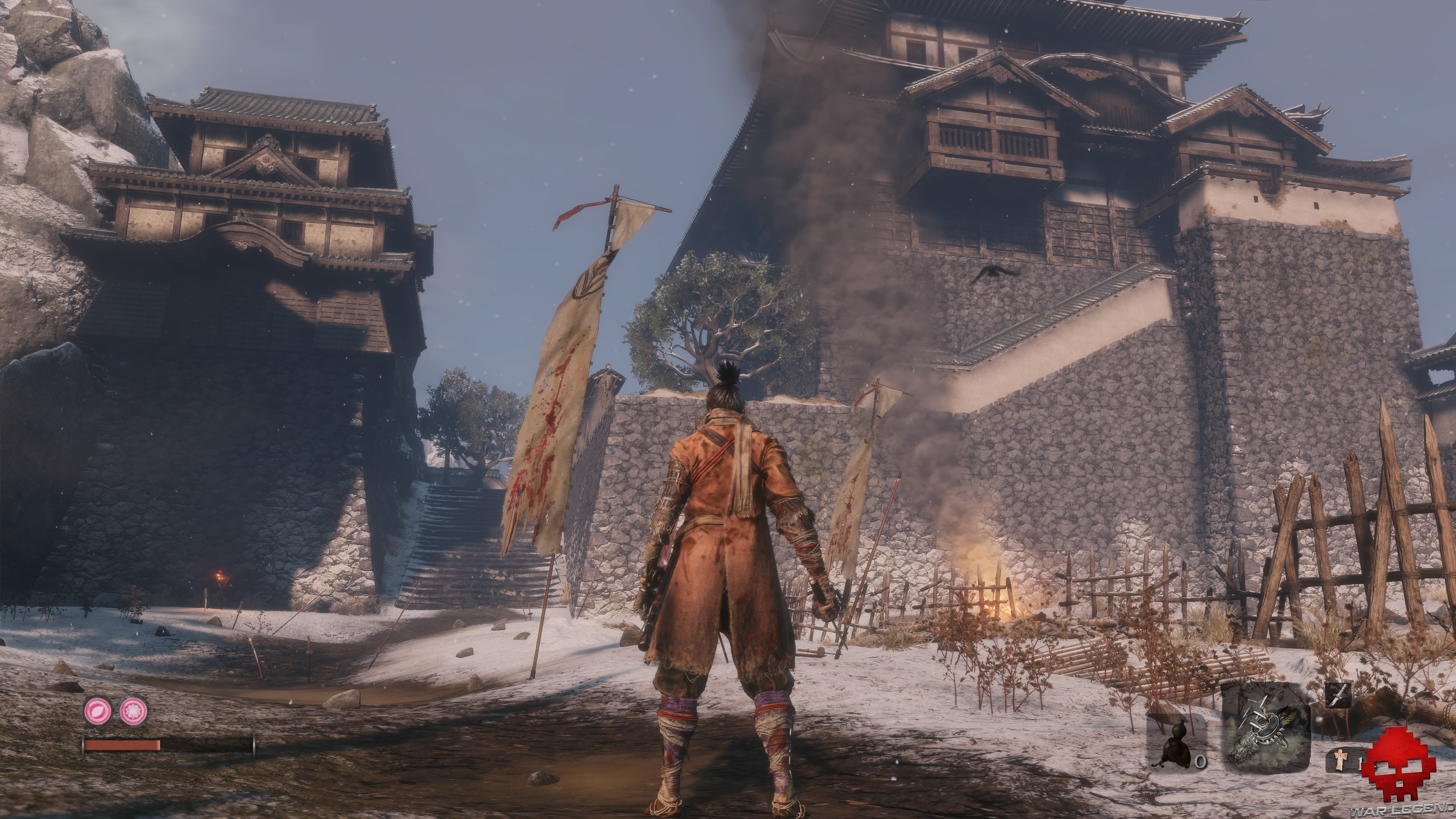 Vous ramasserez 1 Morceau de feret 1 Poignée de cendres. Poursuivez maintenant votre chemin en grimpant sur le toit de la porte face aux escaliers et espionnez la conversation puis tuez les 2 gardes. En passant la porte suivante, vous vous retrouvez au Château Ashina.