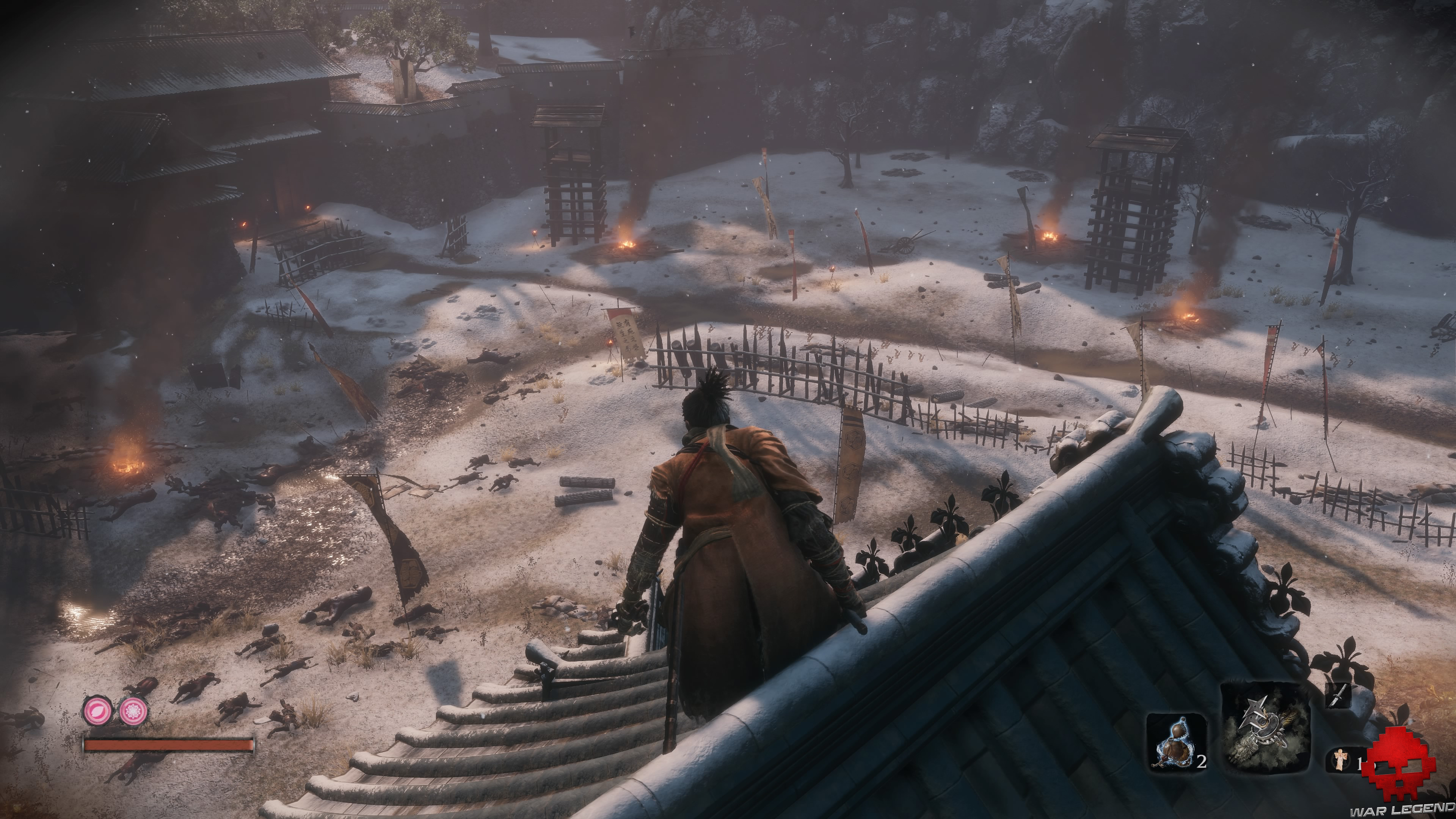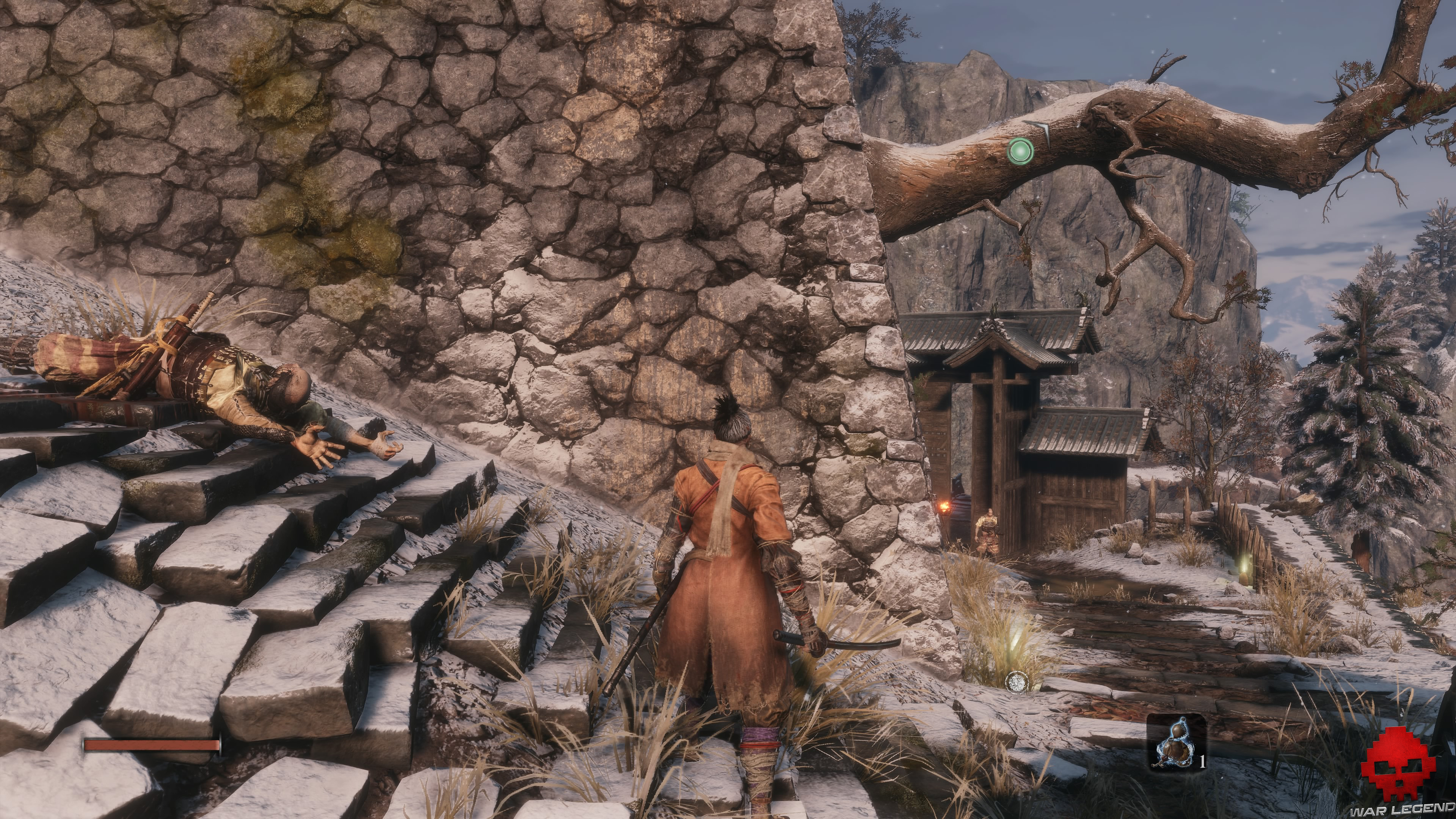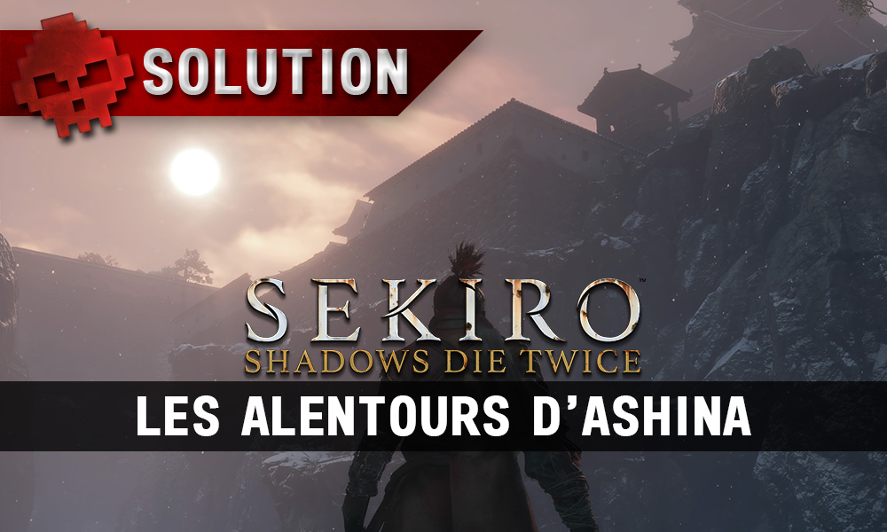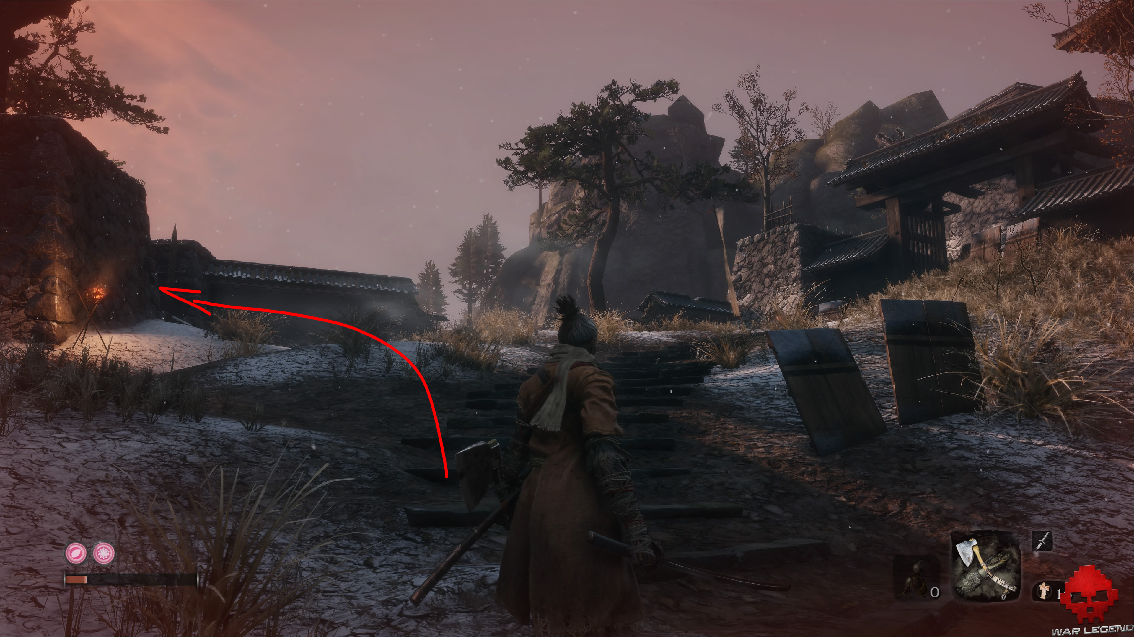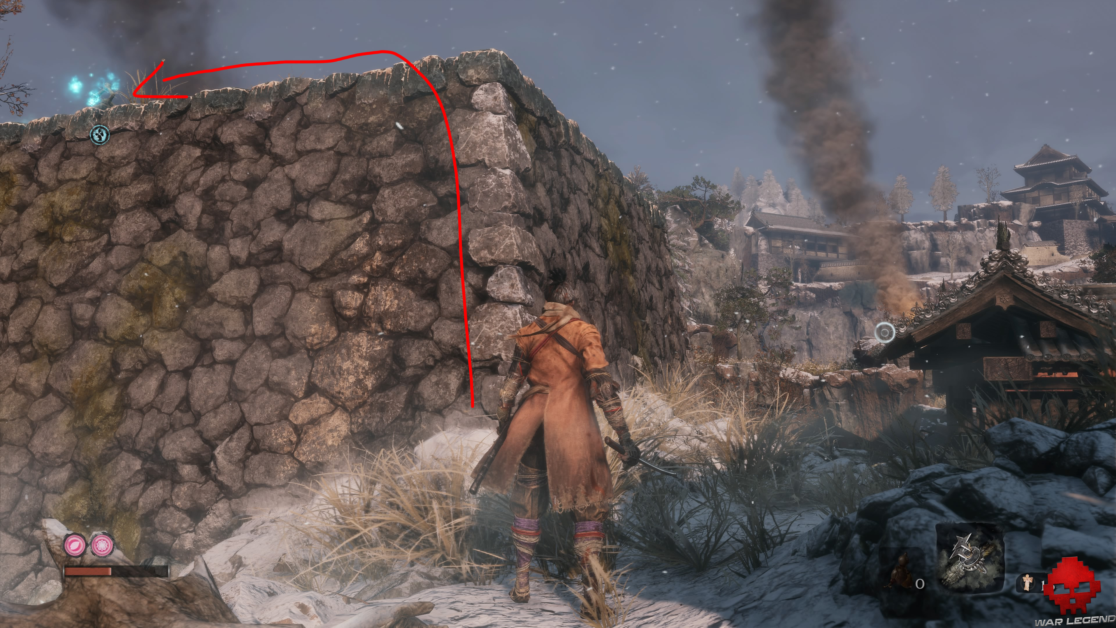 Vous ramasserez 1 Morceau de feret 1 Poignée de cendres. Poursuivez maintenant votre chemin en grimpant sur le toit de la porte face aux escaliers et espionnez la conversation puis tuez les 2 gardes. En passant la porte suivante, vous vous retrouvez au Château Ashina.