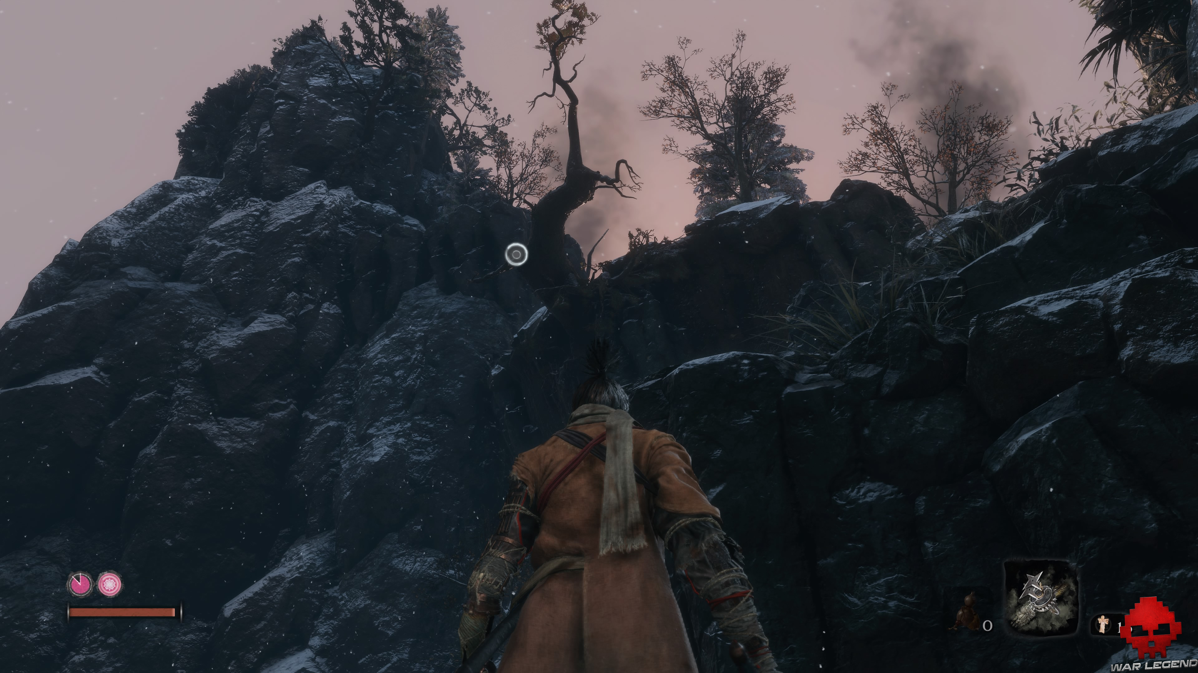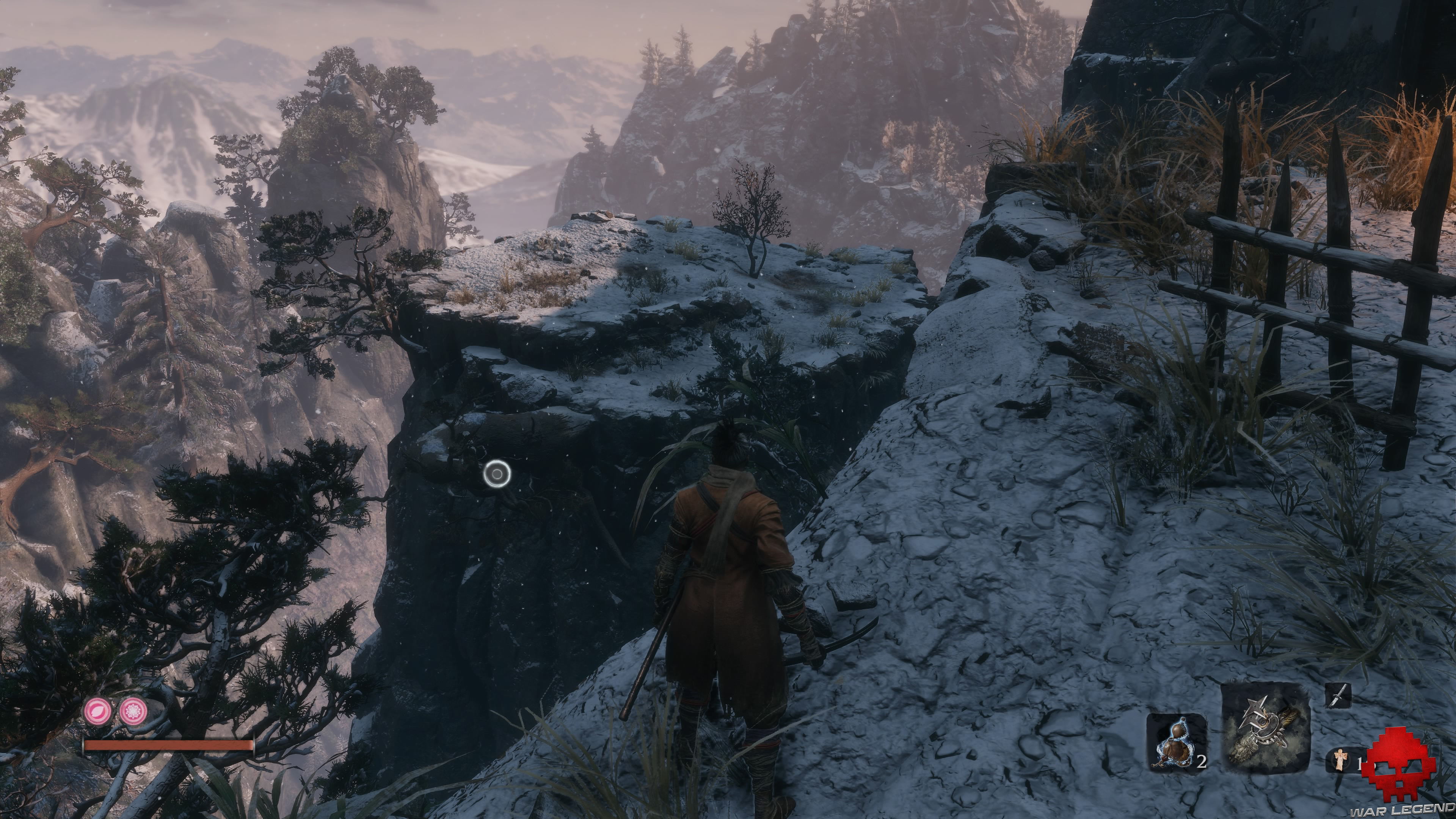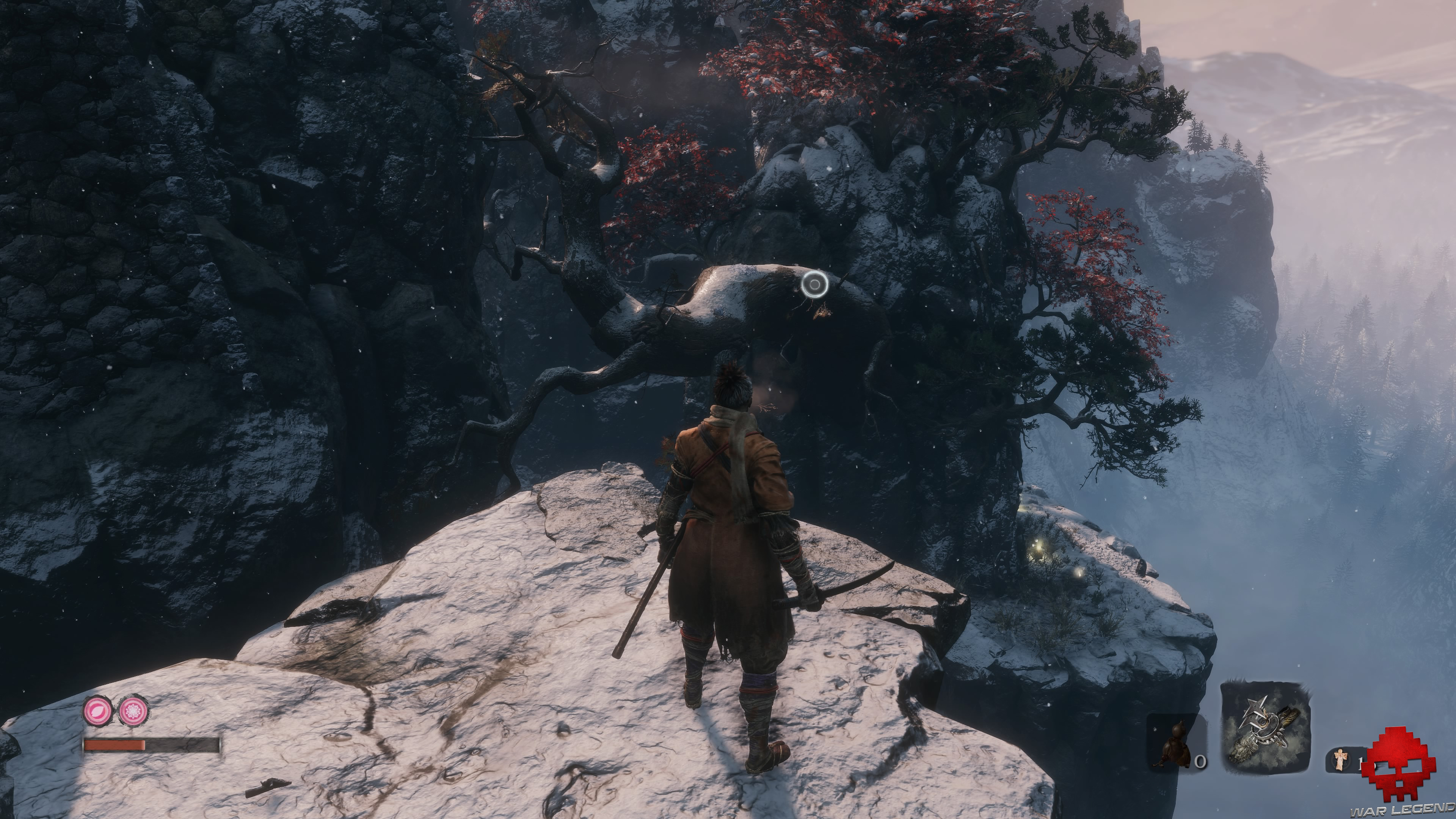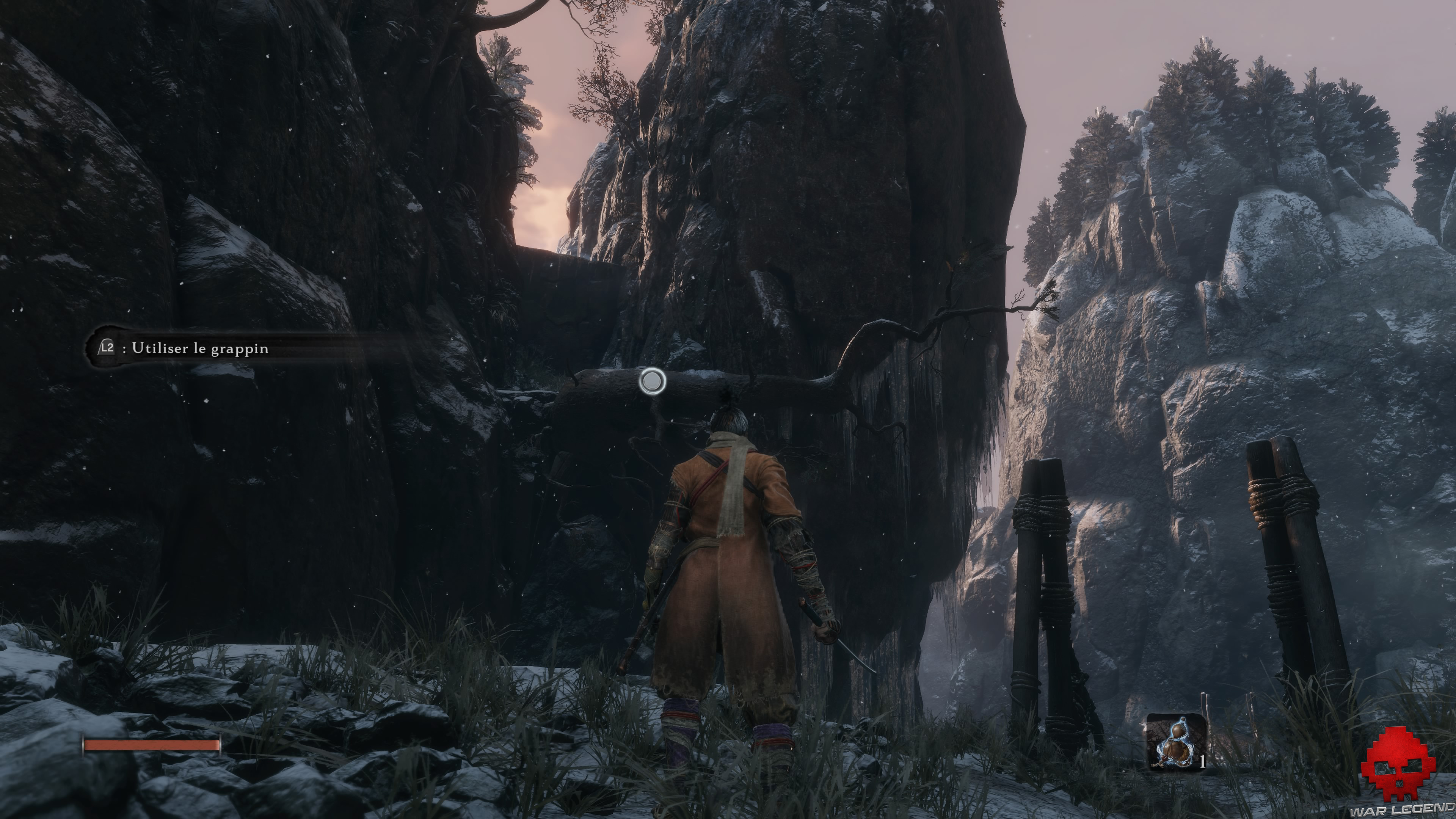 Redescendez et suivez l’autre chemin. Le pont est coupé et vous devez vous familiariser avec le grappin de la prothèse ninja. Approchez-vous du précipice et de la grande racine. Dès que le rond gris est rempli, il devient vert pour vous signaler que vous pouvez vous accrocher pour grimper. Note pour la suite : si le rond est vert mais qu’il est barré d’un trait blanc, c’est que la ligne de vue entre vous et le point d’accroche est obstruée, décalez-vous.