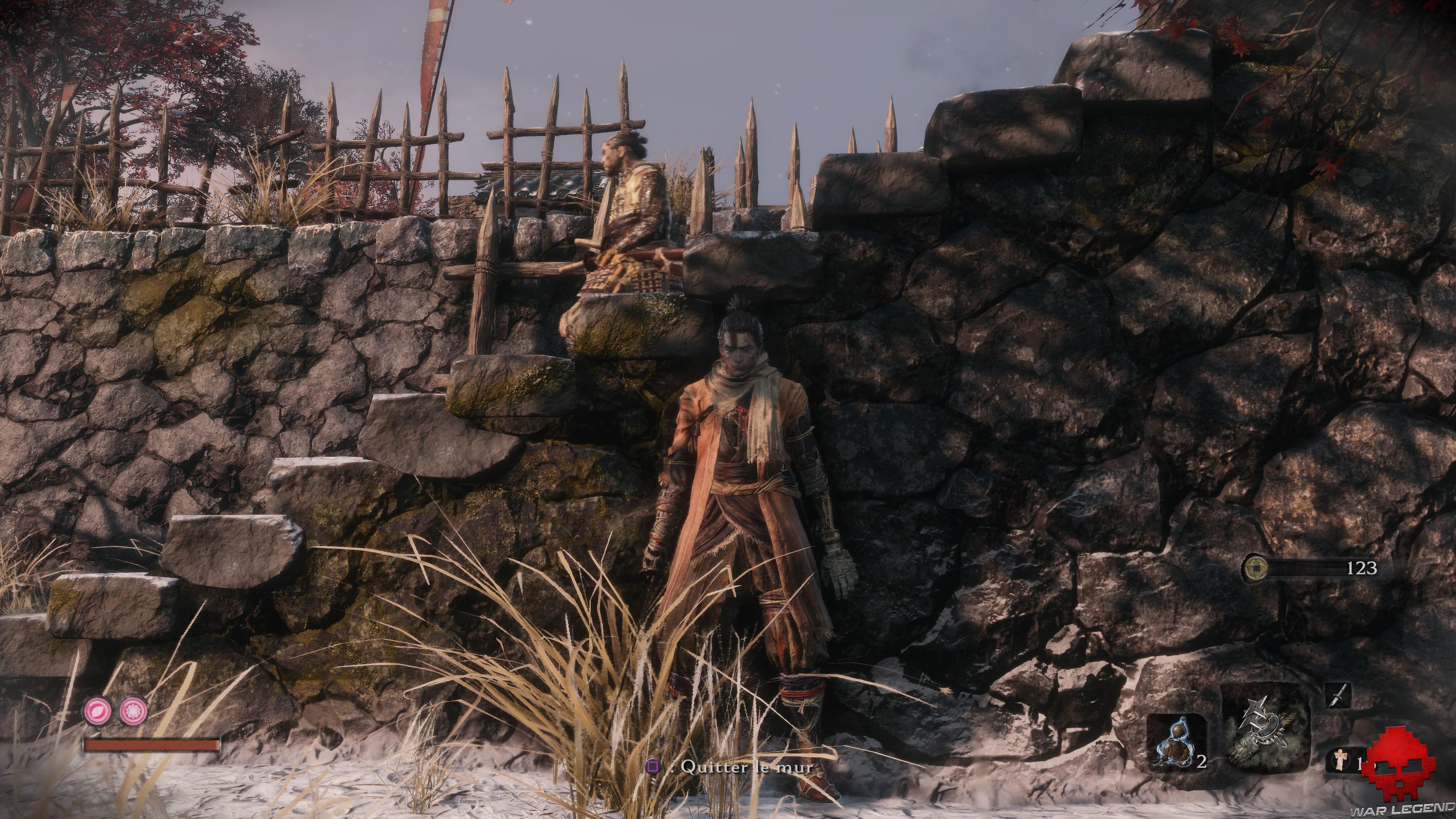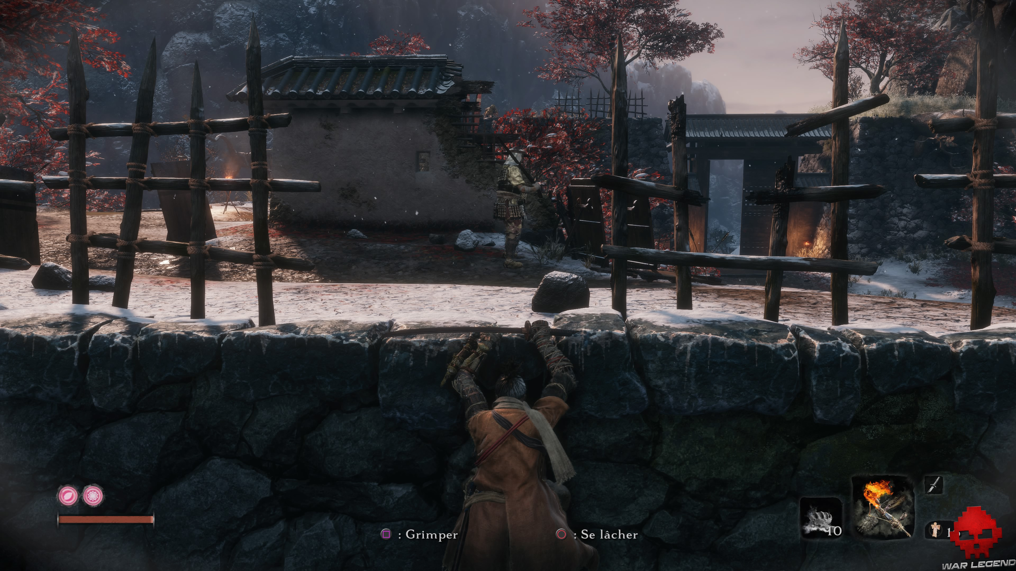 Vous récupérez aussi une Graine de gourde pour améliorer la Gourde médicinale auprès d’Emma. Prenez la Poignée de cendres sous l’appentis puis avancez en grimpant sur la poterne. Dans la zone suivante, plusieurs ennemis à dessouder. Commencez par le fusilier qui se planque à l’étage de la maison au centre (prenez garde à ce que les 4 soldats qui patrouillent soient passés) – derrière lui se trouve un Éclat de porcelaine.