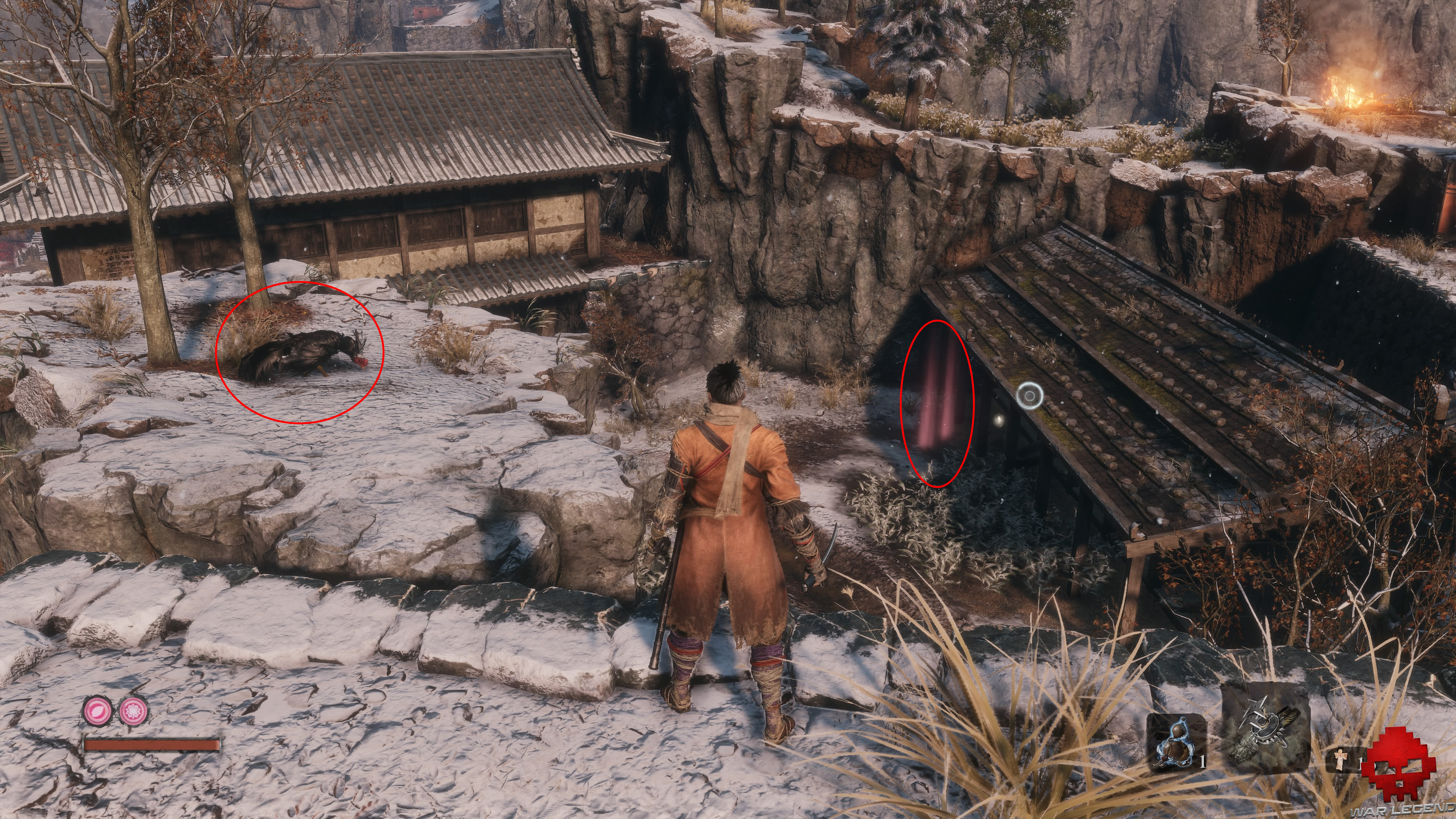 Sa mort vous rapporte une nouvelle Perle de chapelet. Passez ensuite par la grande porte entrouverte de la cour. Récupérez les Confettis divins et lisez le Message du temple cloué sur le mur en bois plus bas.