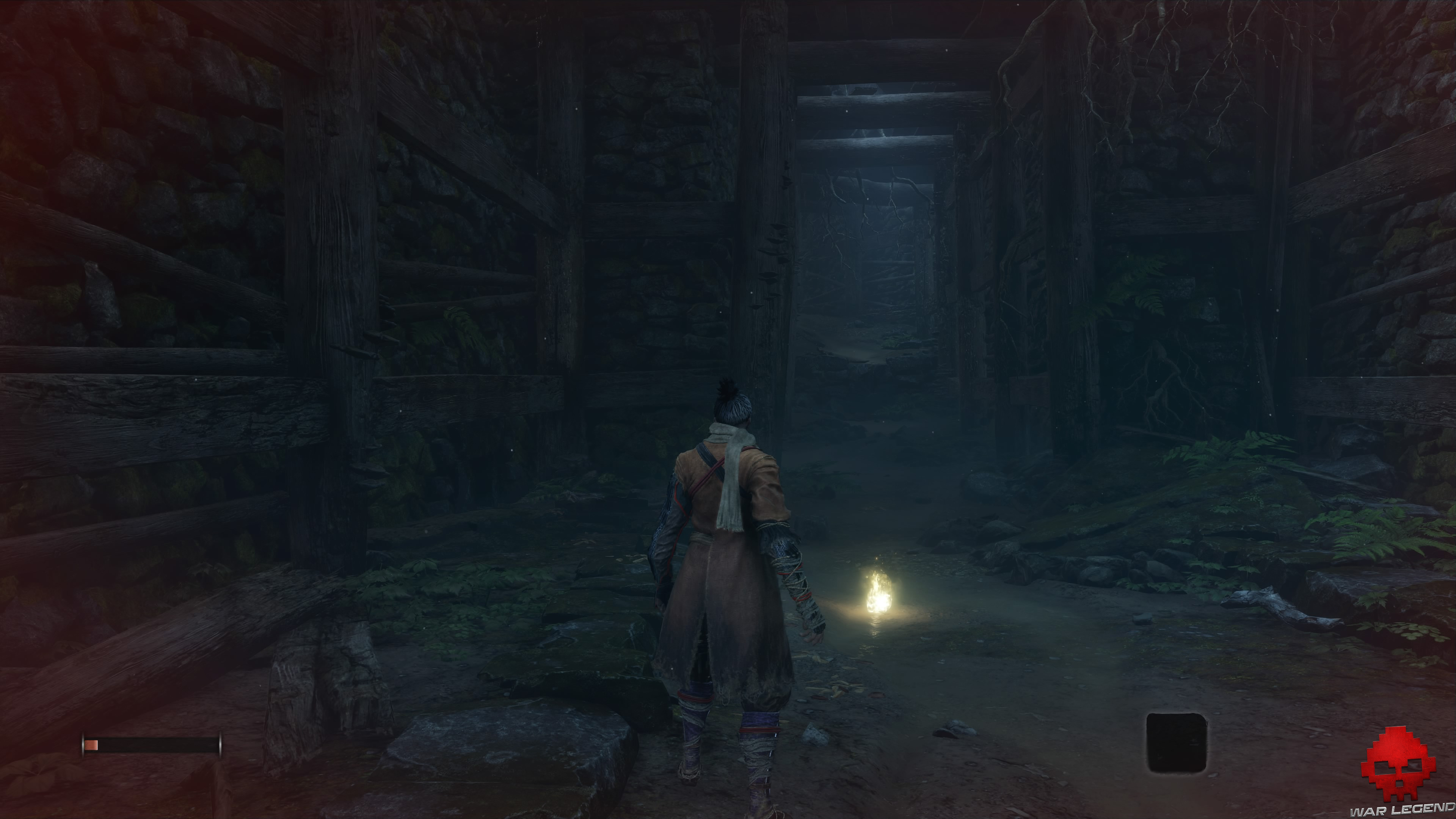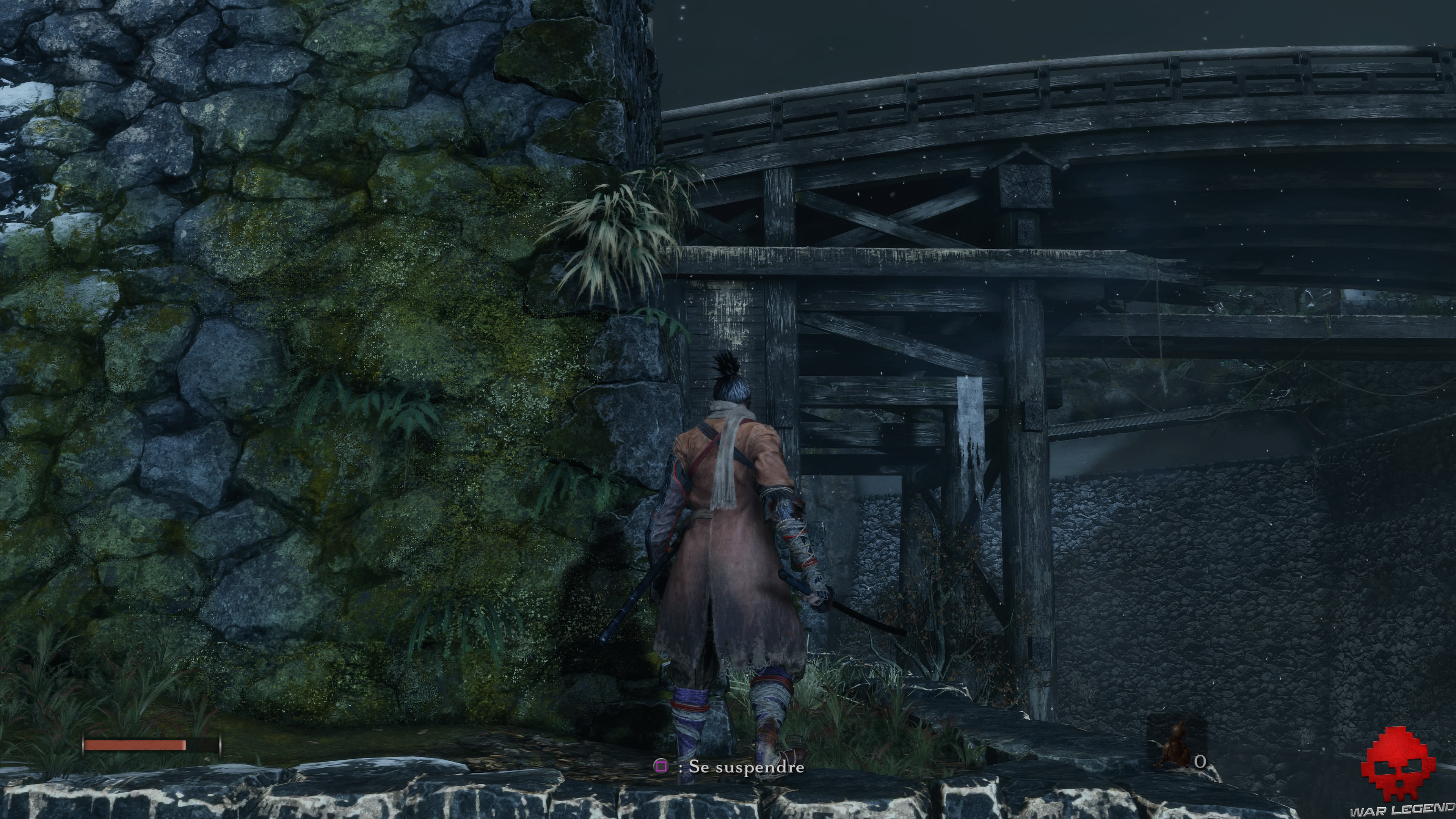 Vous ne pouvez pas ouvrir la porte qui suit, longez par la droite et ramassez une Poignée de cendres. Avancez sur le tronc d’arbre et sautez pour vous agripper au rebord puis faites un double saut plus loin pour passer sous le pont.