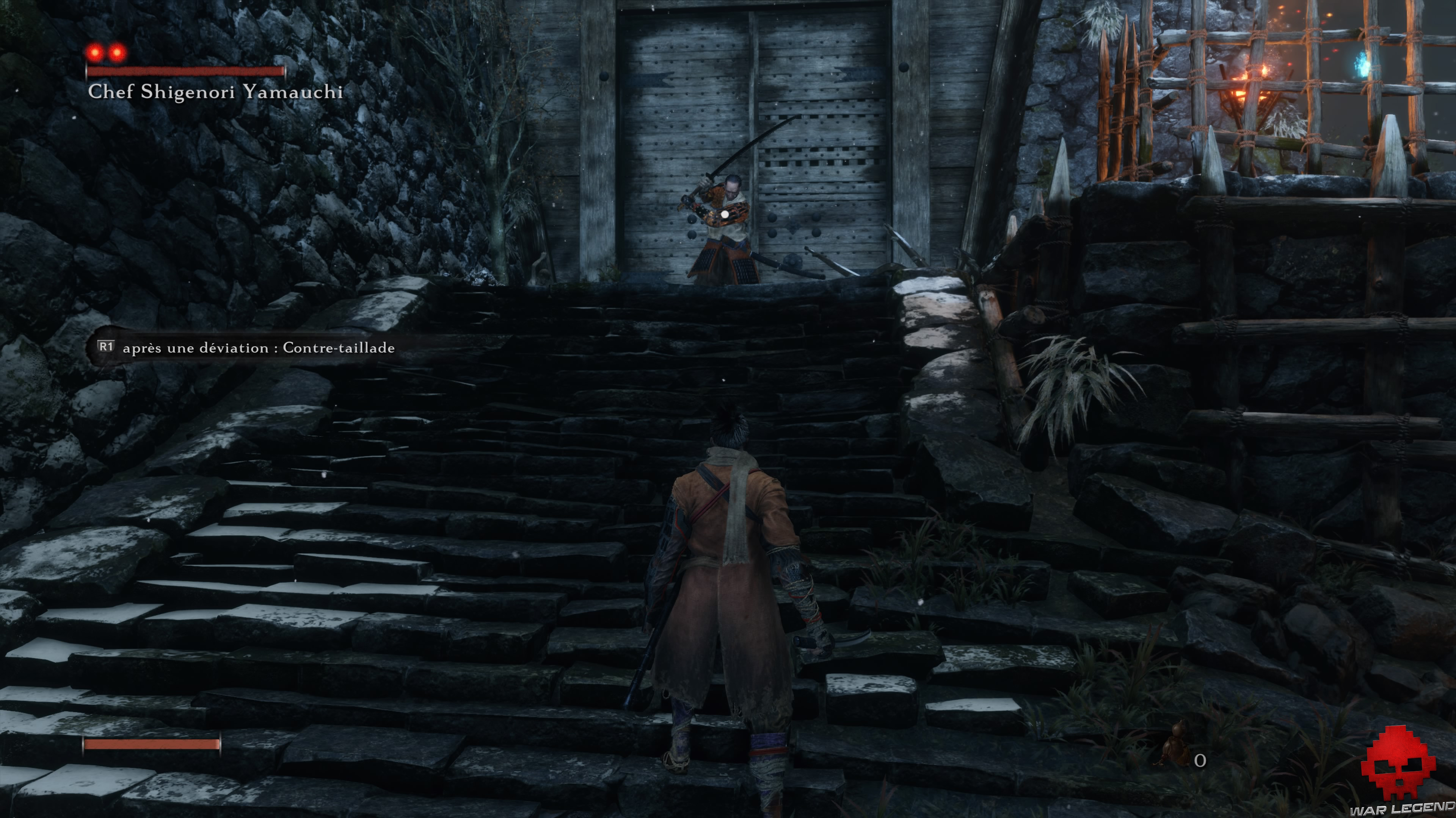 Le prochain ennemi est plus coriace et vous devrez utiliser ce que vous avez appris jusqu’ici pour en venir à bout. Parez ses attaques et attaquez immédiatement une fois cela fait, ça aura pour effet d’entamer davantage sa posture. Quand vous avez réussi à placé 2 coups mortels, vous avez gagné. N’hésitez pas à le larder d’attaques, ne restez pas passif à attendre de pouvoir le parer. N’oubliez pas la Gourde médicinale en cas de besoin si vous ne l’avez pas déjà consommée.