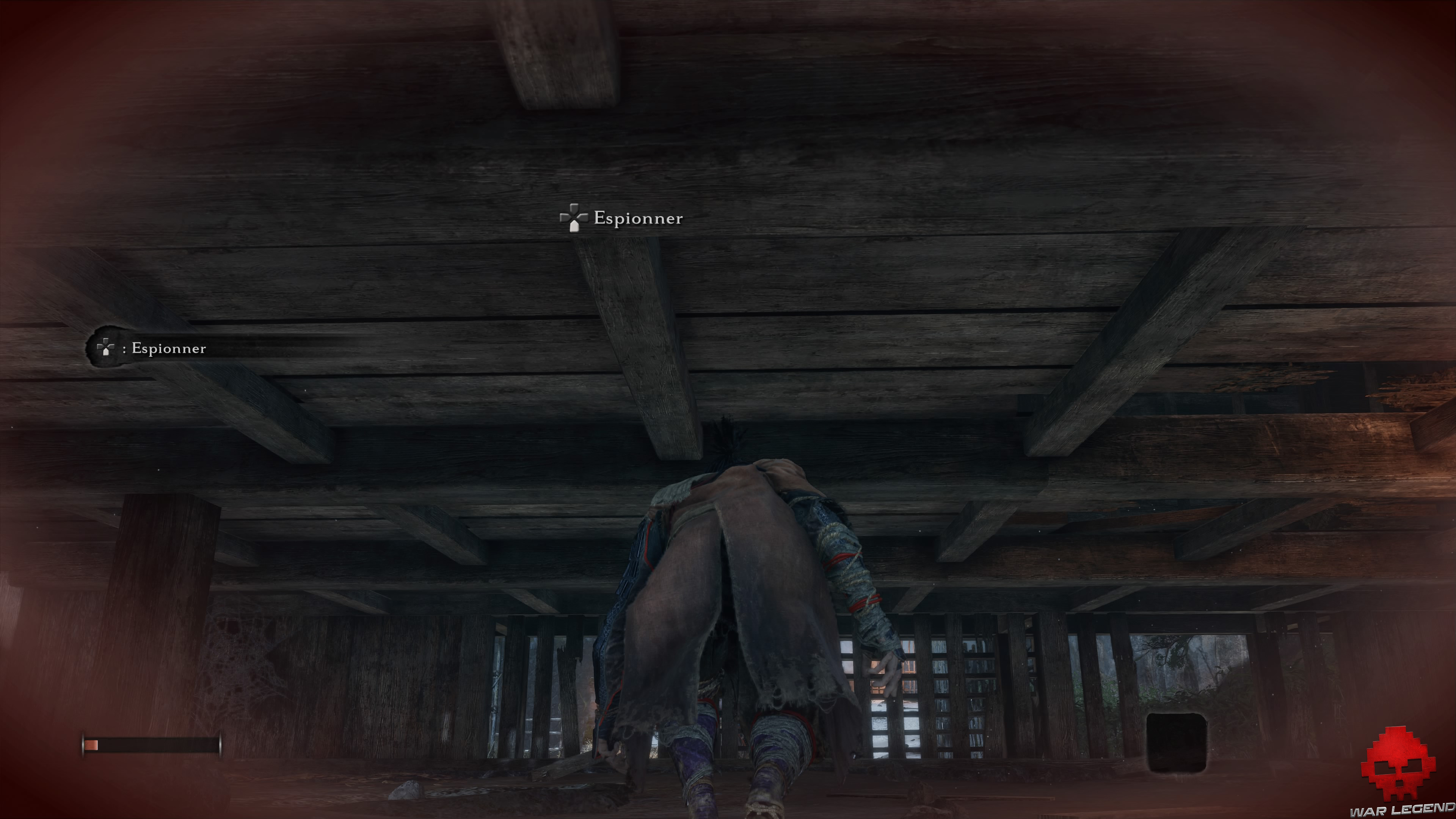 Après avoir traversé le précipice, quittez le mur pour vous accroupir dans les fourrés et avancer jusqu’à la maison, par le sous-sol duquel vous continuez d’avancer. Vous aimeriez bien zigouiller ces gardes, je le sais, mais un peu de patience, vous n’avez pas encore de lame. Une fois sous la maison, regardez en l’air si vous voulez espionner une conversation.