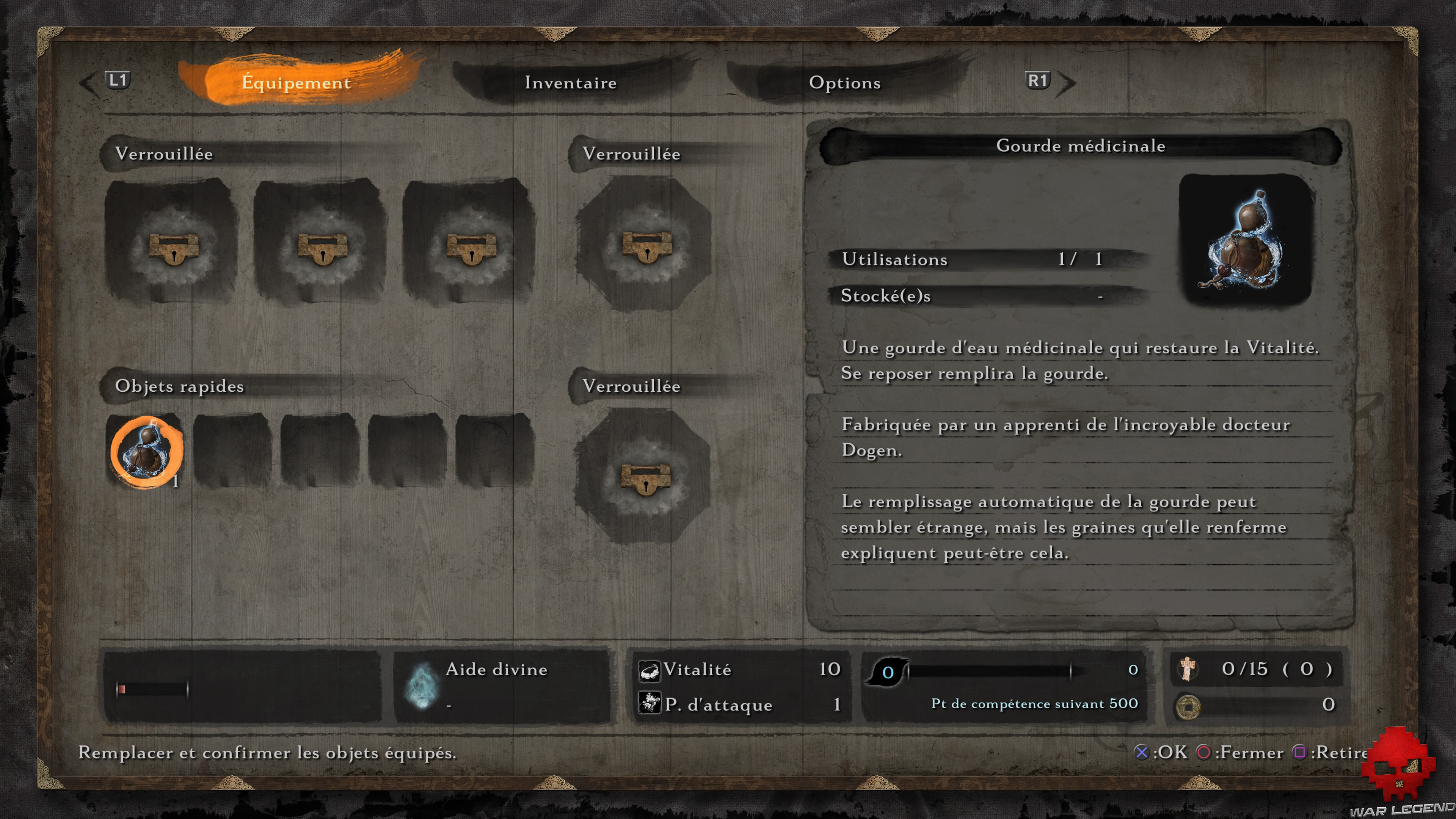 Parlez à nouveau au maître une fois la cinématique passée pour récupérer la Gourde médicinale, la version Sekiro de la Fiole d’Estus et de la Fiole de Sang. Passez par l’inventaire pour l’équiper dans les objets rapides.