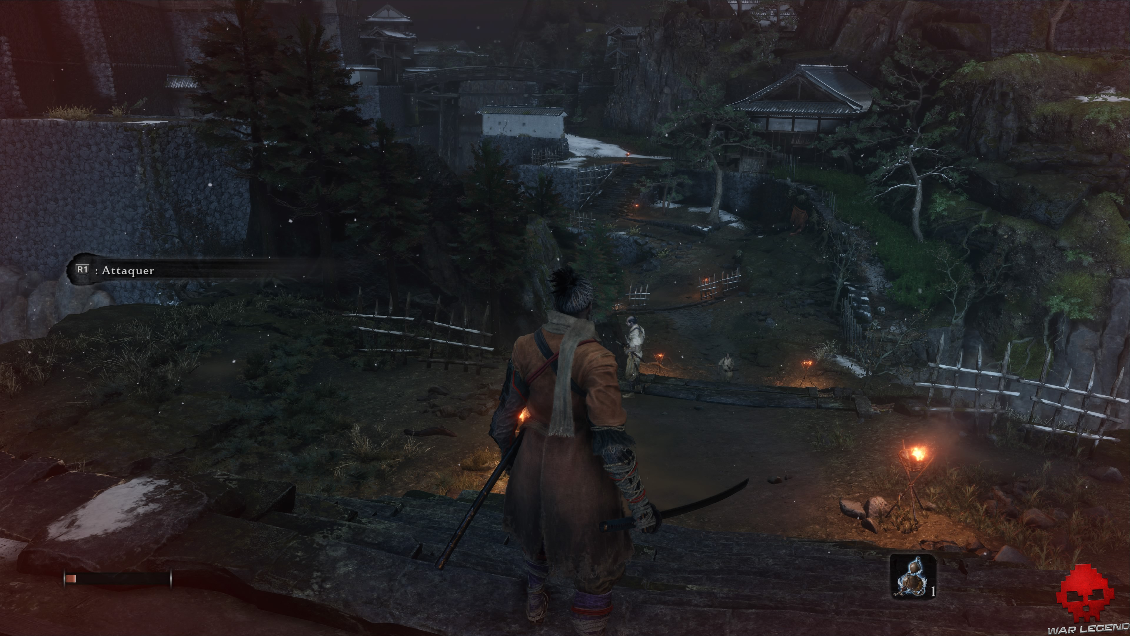 Il y a un troisième ennemi qui arrive en bas sur votre gauche. Si vous avez réussi à éliminez les 2 autres discrètement, il ne devrait pas vous voir. Vous pouvez tenter de le tuer discrètement. S’il vous attaque, faites attention car il peut parer, il est un peu moins nul que les 2 autres. Le mieux est de le parer vous-même : dès qu’une attaque devrait vous frapper, parez puis enchaînez aussitôt sur une attaque, ça le tuera. Grimpez ensuite par les fourrés sur la droite, là d’où vous êtes venu, en fait.