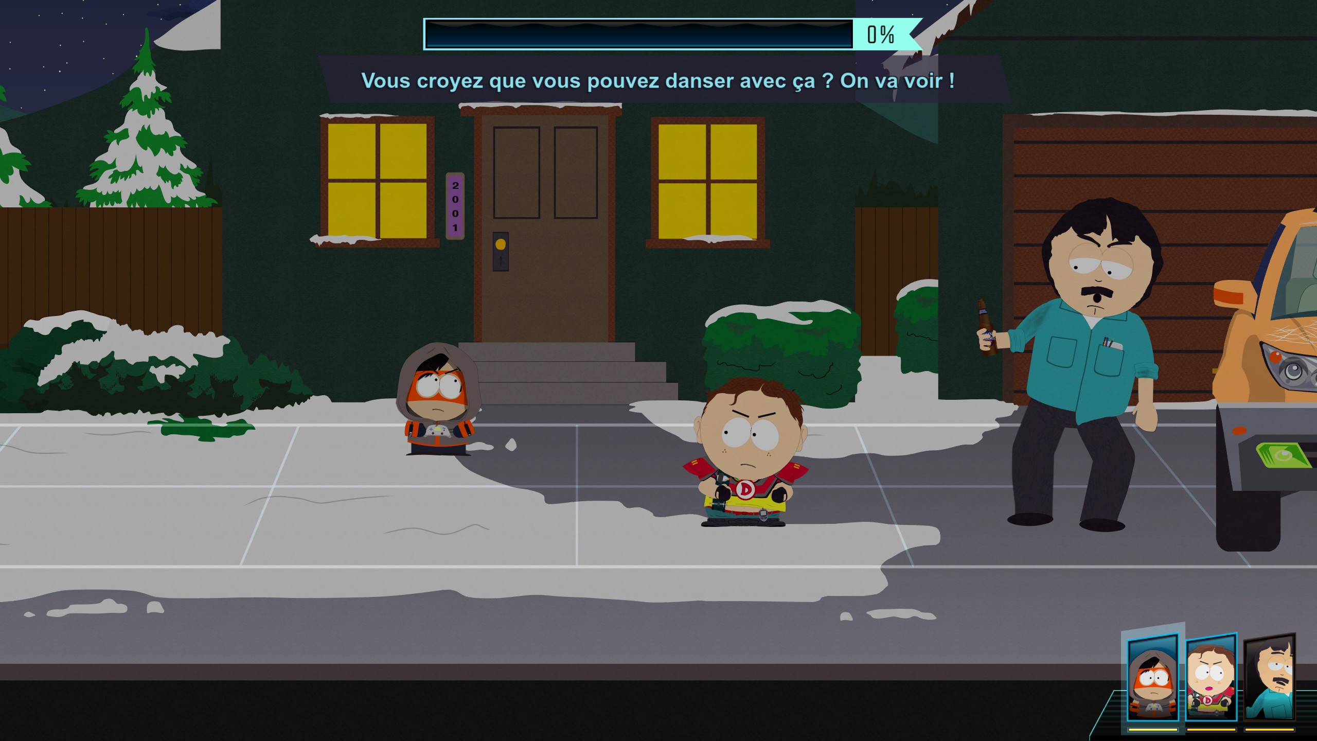 Arrivée au niveau de la maison de Stan, vous voyez son père, Randy, complètement saoul et en train de rayer la voiture de sa femme. Dans un élan héroïque, Capitaine Diabète engage le combat pour éviter au pauvre homme de prendre le volant. Une parfaite occasion de tester les compétences du Héros dont vous êtes le sidekick.