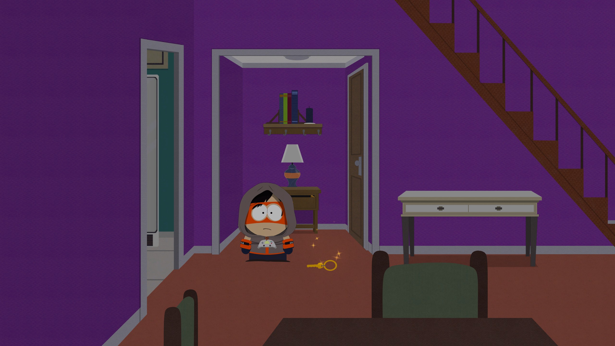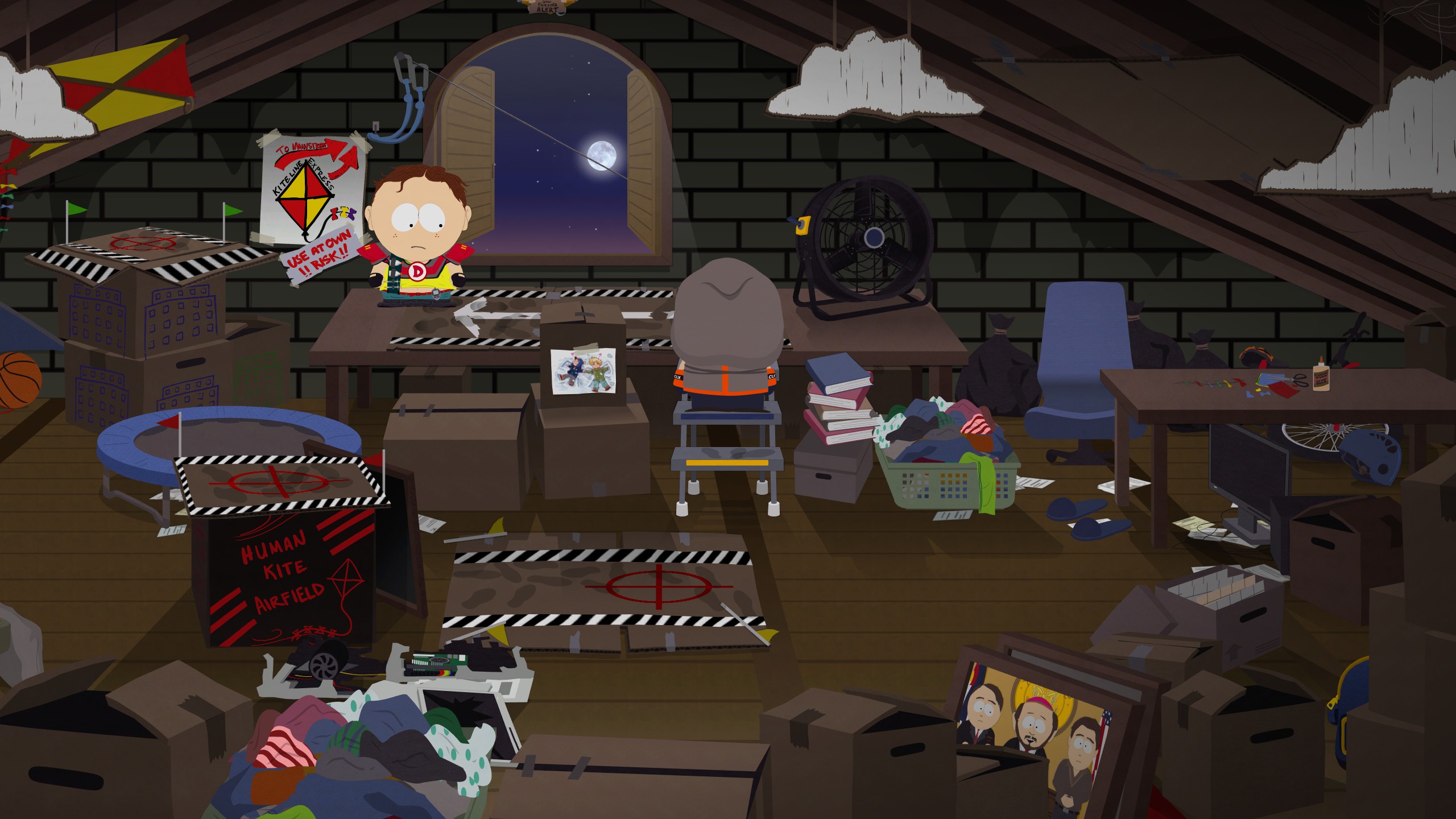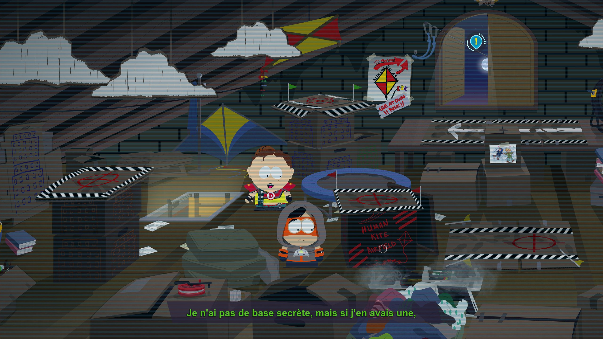 Une fois Randy hors d’état de se nuire, continuez vers la maison de Kyle. Rentrez et montez à l’étage. L’Homme cerf volant a installé un système sophistiqué qui vous permettra de rejoindre le centre-ville en un rien de temps. Pour y accéder, balancez des pétards sur l’échelle qui mène au grenier.