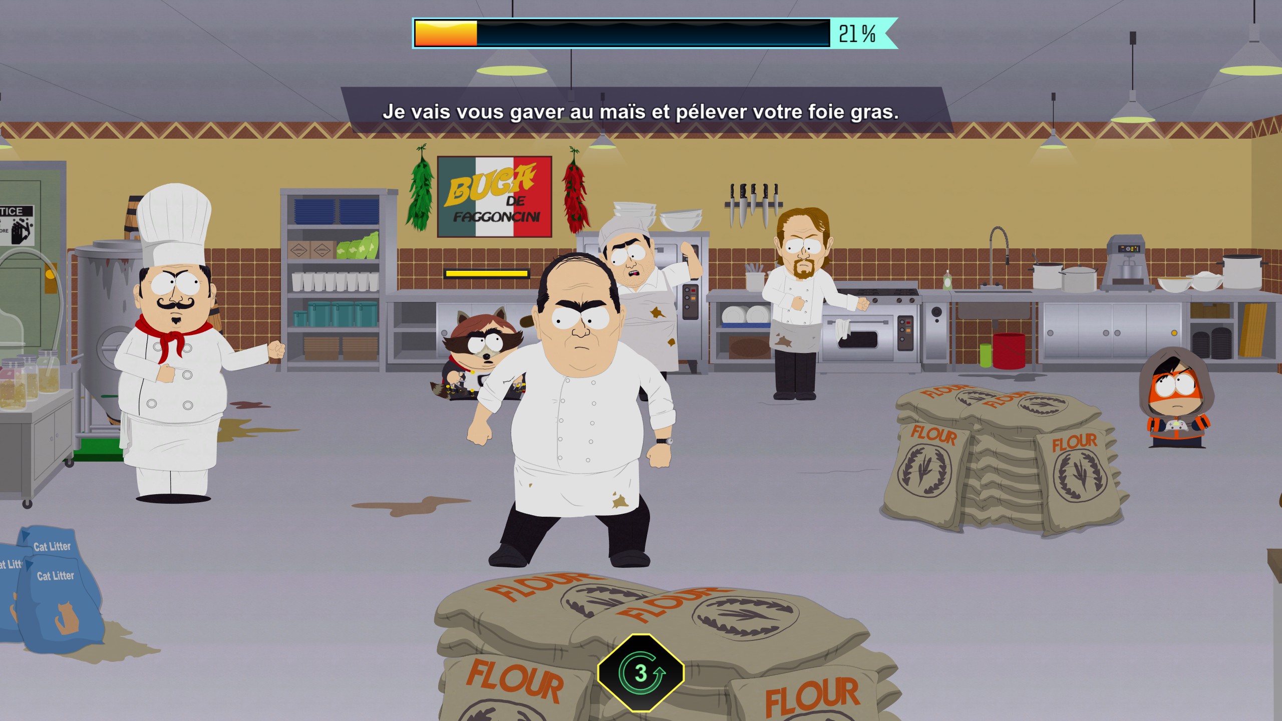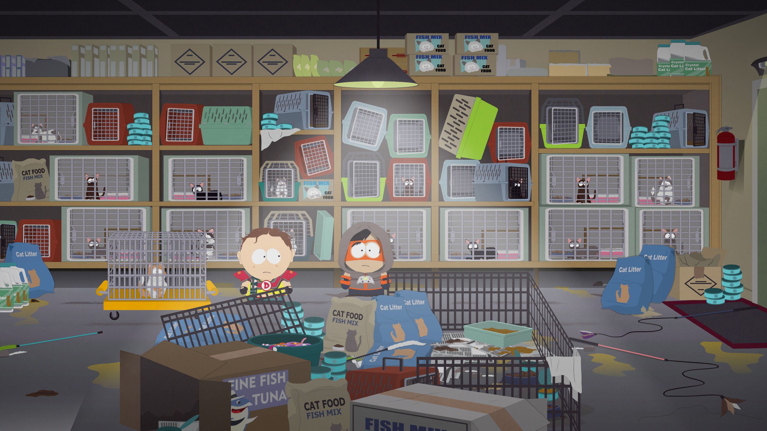 Stupeur, des chats disparus de South Park sont retenus prisonniers dans l’arrière-cuisine, mais aucune trace de Classi ou du chat de la récompense. Poussez la cage le plus possible puis utilisez le Pet temporel pour la faire revenir à sa position initiale, vous laissant un passage vers la porte. Préparez-vous au combat de boss qui va suivre.