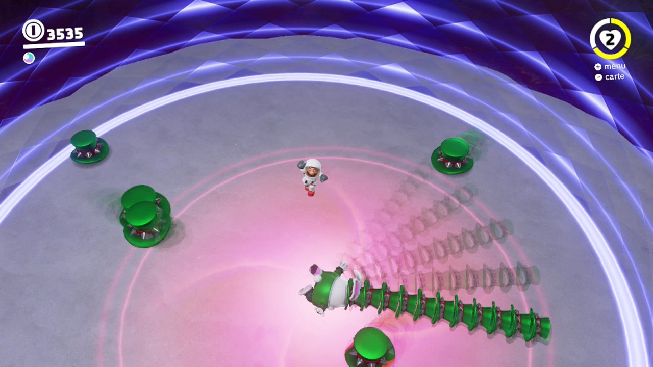 Une fois dans la carotte lunaire géante, vous rencontrez en premier Topper, avec plus de chapeaux qu’il n’en faut. Si vous ne l’aviez pas déjà remarqué lors de vos précédentes rencontres, le plus simple pour le battre, est de l’écraser avec une charge au sol quand il tourne sur lui même, afin de gagner du temps.