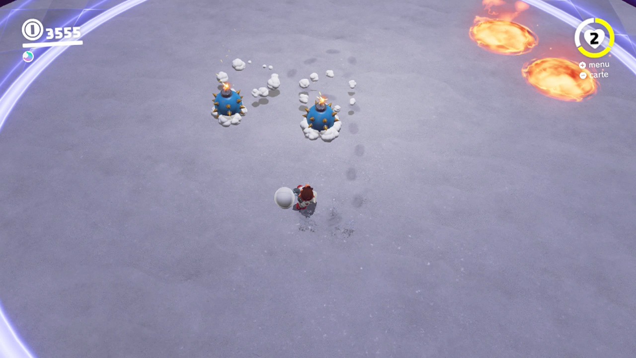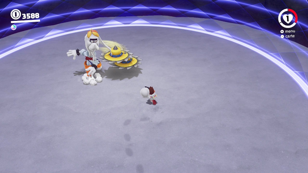 Pour éviter qu’elle ne contrôle trop le terrain avec ses bombes, qu’elle lâche depuis les airs, touchez la dernière bombe rapidement avec Cappy pour lui renvoyer.